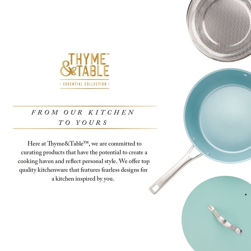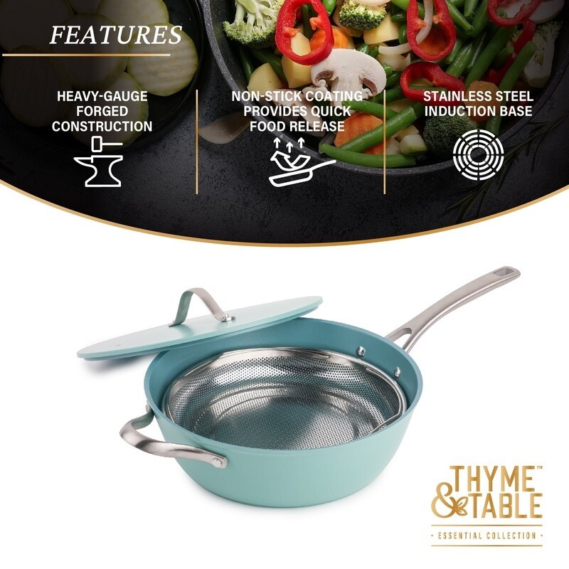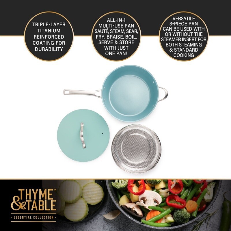 Aluminized Steel Chef Pan Set with Steamer Basket, Acadia Blue is the ultimate cooking tool. Made for those who demand both versatility and elegance in their kitchen. Crafted from high-quality materials. This chef pan set is designed to last and built to impress. Its sleek and sophisticated design adds a touch of class and refinement to any kitchen. Versatile 11 inch size and included steamer basket. This skillet is perfect for everything from saut? ? ing vegetables to searing meats to steaming dumplings. The steamer basket is ideal for cooking healthy meals that retain their natural flavors. For care & ensuring the product's longevity, please hand wash in warm water with a soft sponge and dish soap. Acadia Blue color Suitable for all cooktops Non-stick coating for easy release Crafted from durable aluminum and stainless steel Hand wash recommended to maintain longevity Brand