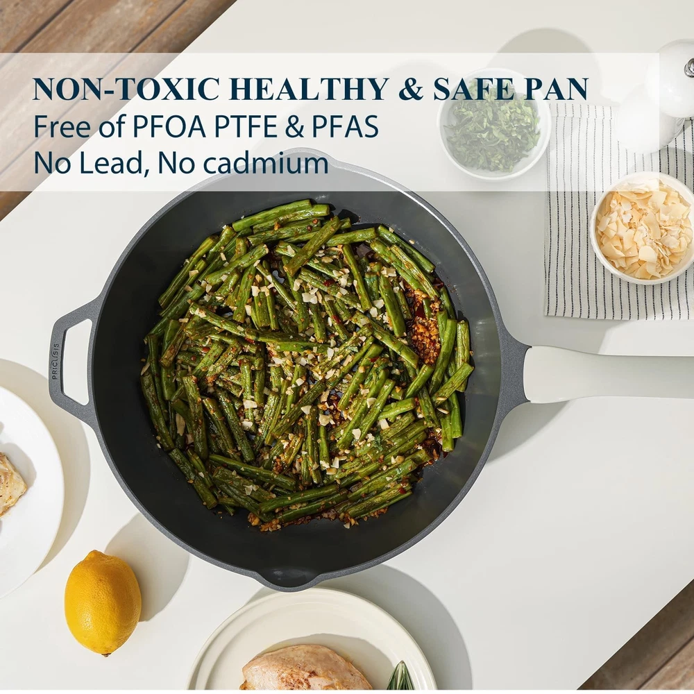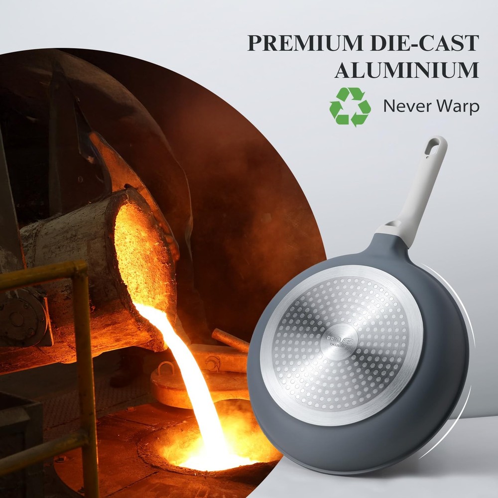 DURABLE CONSTRUCTIONS: Cast aluminum nonstick frying pan provides durability, fast and even heating, never warp. The flared, mid-sized sides that allow for easy flipping and tossing. NON-TOXIC COATING: Our ceramic nonstick pan is free of PTFE, PFOA, PFAS, lead, cadmium and other toxic materials, which gives for healthy cooking in the kitchen. CERAMIC NON-STICK: The super nonstick ceramic coating makes food easily slides around the cooking surface with a minimal amount of oil or butter. The efforless release and clean up bring you a enjoyable cooking experience. STOVETOP AGNOSTIC: The thick stainless base is protected your food from burning, it is suitable for all stoves (Gas, Electric, Ceramic & Induction). VERSATILE FRY PAN: This nonstick skillet is perfect for shallow frying, scrambling, sauteing, or searing. Whether you fry up bacon for breakfast or steak and potatoes for dinner, the fry pan always keeps the moisture out of your dish, so you can count on perfectly browned and crispy food every time. GIFT READY: Comes with elegant gift boxes which is a perfect gift for your familys and friends. (Such as Mother's Day, Father's Day, Thanksgiving, and Christmas)