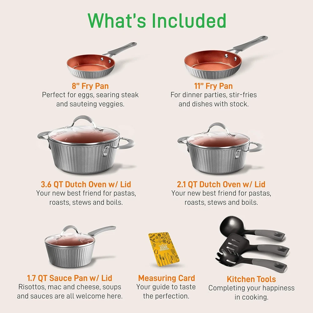 Store New Arrivals Add to Favorite View Feedback Contact Nonstick Cookware Excilon |Home Kitchen Ware Set with Saucepan, Frying Pans, Cooking Pots, Lids, Utensil PTFE/PFOA/PFOS Free, 11 Pcs, Gray Description Item model number NCCW11GL Global Trade Identification Number 00842893123493 Closure Material Tempered Glass Size 11 Pcs Color Gray Included Components Saucepan Pot with Lid, 1.7 Quart, Dutch Oven Pot with Lid, 3.6 Quart, Cooking Pot with Lid, 2.1 Quart, Large Fry Pan, 11-Inch, Small Fry Pan, 8-Inch, Soup Ladle, Pasta Fork, Spatula Material Aluminum Country of Origin China Is Dishwasher Safe No Item Weight 15.95 pounds Is Oven Safe No Handle Material Metal, Plastic With Lid Yes Material Type Free PTFE Free, PFOA Free Special Feature Gas Stovetop Compatible, Electric Stovetop Compatible, Manual, Induction Stovetop Compatible Product Dimensions 19 x 11 x 4 inches Compatibility Options Pots & Pans Safe for Gas, Electric, Ceramic & Induction Counter Cooktops Number of Pieces 11 11-PIECE SET: NutriChef offers a 11-piece nonstick cookware set which includes 1. 7qt saucepan pot w/ lid, 3. 6qt dutch oven pot w/ lid, 2. 1qt cooking pot w/ lid, 11” large fry pan, 8” small fry pan, soup ladle, pasta fork, and spatula NON-STICK COATING: The non stick pot set cooking ware features a durable and long lasting nonstick coating for easy tossing, cleaning & healthy cooking. Features blue diamond ceramic exterior which makes the pot more durable & w/ better heat transfer SILICONE TOUCH HANDLE GRIPS: This pots set features cool-touch ergonomic handles & also heat-resistant which ensures comfortable & safe cooking. Offers an elegant & sleek diamond line pattern adding a stylish and modern touch to the pots and pans SEE-THROUGH LIDS: The non stick cookware is equipped with see through tempered glass lids with vent holes that allow steam to escape. The cookware set effectively distributes and retains heat for even cooking with maximum temperature of 500° F INDUCTION READY: These pots and skillet fry pans are safe for use in gas, electric, ceramic & induction counters. Made of reinforced forged aluminum w/ coating thickness of 25-35um, 3. 5mm multi-layered. Includes heat-resistant nylon silicone utensils. Basically you can use them anywhere Features: - Professional Home Kitchenware - Stylish Modern Kitchen Cookware Design - Elegant Lines Pattern - Multi-Sized Cooking Pots with Lids - Medium & Large Skillet Fry Pans - Durable and Long Lasting Ceramic Coating - Comfortable Cool-Touch Form-Fitting Handle Grips - Effectively Distributes & Retains Heat for Even Cooking All-Around - See-Through Tempered Glass Lids - Stain-Resistant & Easy-to-Clean - Includes Heat-Resistant Kitchen Tool Utensils - Food-Grade Safe, Construction - Pots & Pans Safe for Gas, Electric, Ceramic & Induction Counter Cooktops What's in the Box: - Saucepan Pot with Lid (1. 7 QT) - Cooking Pot with Lid (2. 1 QT) - Dutch Oven Pot with Lid (3. 6 QT) - Small Fry Pan, 8'' -inches - Large Fry Pan, 11'' -inches - Soup Ladle - Pasta Fork - Spatula Technical Specs: - Max Temperature: 500° Fahrenheit (260° Celsius) - Construction Material: Reinforced Forged Aluminum Metal, Engineered Nylon Silicone, Tempered Glass - Coating: Excilon Blue Diamond Ceramic Coating Inside, and Heat Resistant Lacquer Outside - Coating Thickness: 25-35um, 3. 5mm Multi-Layered Cookware - Material Metal Hardness: 7 HB - Cook Pot Size (L x W x H): 12. 2’’ x 7. 9’’ x 3. 7’’ -inches (with Lid) - Saucepan Pot Size (L x W x H): 14. 3’’ x 7. 1’’ x 3. 6’’ - inches (with Lid) - Dutch Oven Pot Size (L x W x H): 13. 7’’ x 9. 5’’ x 4. 1’’ - inches (with Lid) - Small Fry Pan Size (L x W x H): 15. 1’’ x 7. 9’’ x 1. 6’’ -inches (with Handle) - Large Fry Pan Size (L x W x H): 19’’ x 11. 0’’ x 2. 0’’ -inches (with Handle) ABOUT US We offer the best prices around on high quality products. Our E-store includes media such as books, movies, music and games while offering electronics, toys, sporting apparel, clothing, tools, general home, garden items and more. SHIPPING We are always working hard to ensure your package arrives as soon as possible. Please understand that some factors like weather, high postal traffic, and the performance of shipping companies are outside of our control. We offer free shipping to the lower 48 states and ship within 2 business days of payment, usually sooner. We do not accept P.O. Boxes. Please provide a physical address. For shipping outside of the continental USA, we only use eBay's Global Shipping Program.The item is shipped to KY and then sent to the rest of the world. International customers are responsible for all duties and taxes. Continue to check out in order to calculate costs for shipping the item to your country. Messages regarding eBay's Global Shipping Program MUST be directed at eBay EXCLUSIVELY. RETURNS We offer a 30-Day Return Policy on items which you are not completely satisfied with. You have the option for a full-refund or an exchange of the item. No returns are available on items shipped outside of the USA. PAYMENT We accept PayPal. CONTACT US This page content is yet to come Please ad us to your favorite seller and visit again later Thank You CUSTOMER SATISFACTION We try our very best to make sure every customer is completely satisfied. If there's a problem, message us! We're happy to help. WE ACCEPT Copyright © 2021 AutoDS. | All Rights Reserved