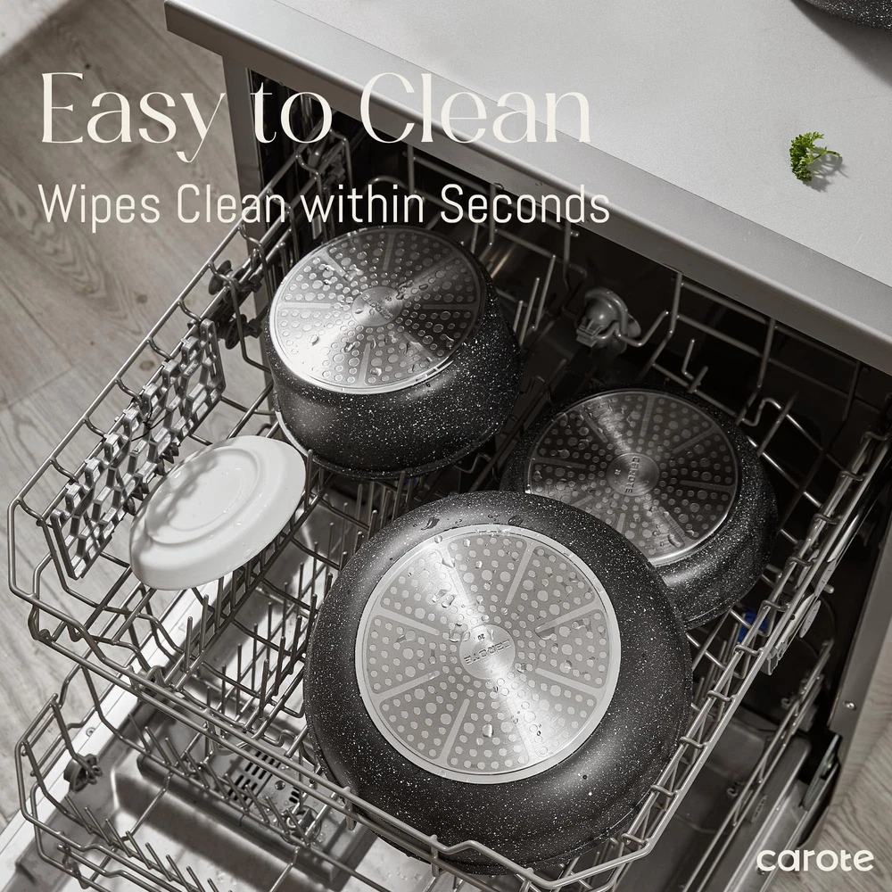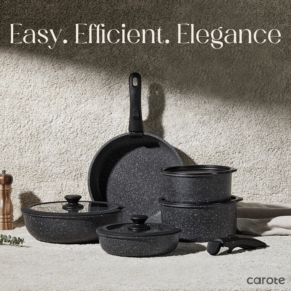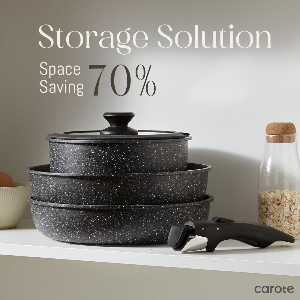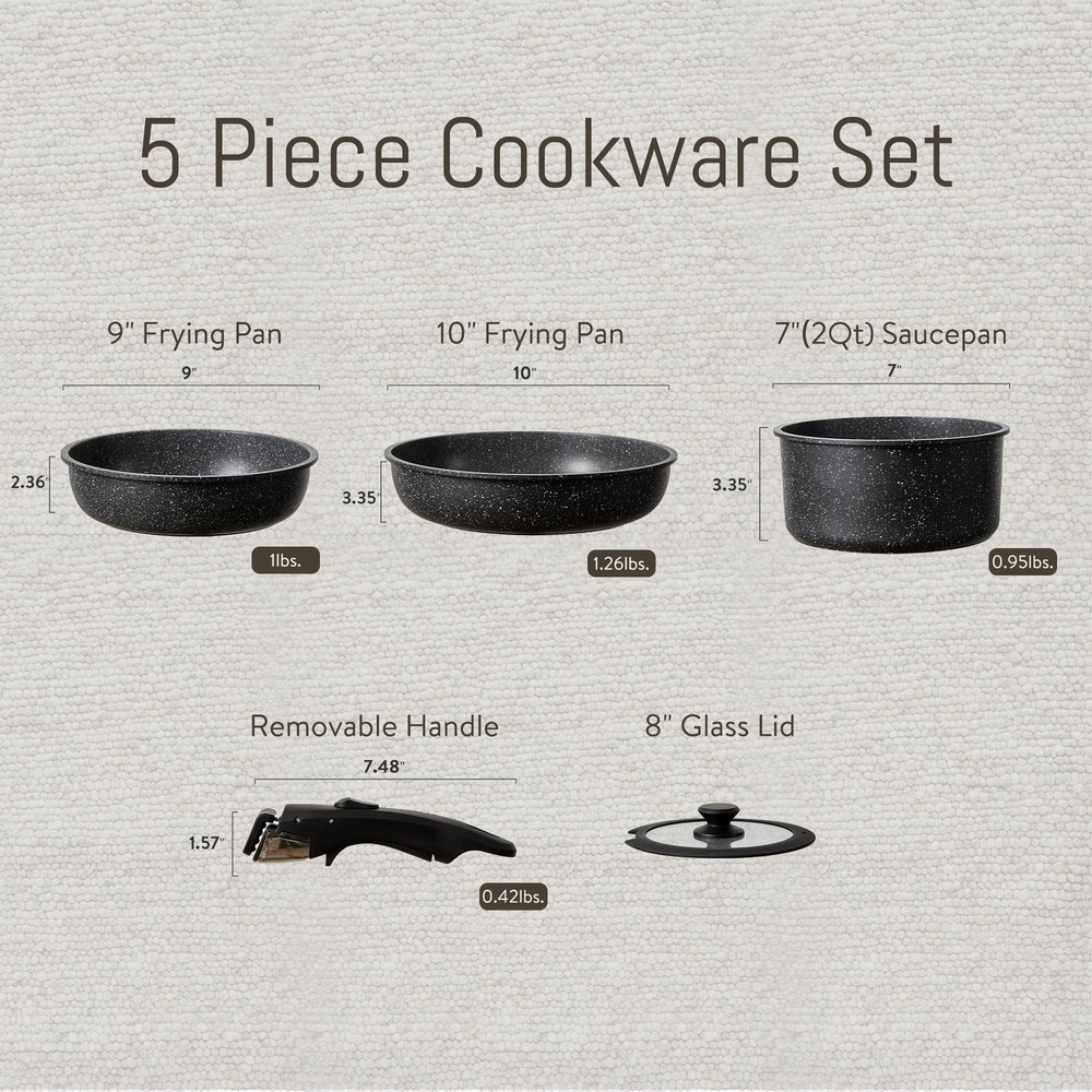 Ultimate Versatility: The removable handle lets you experience kitchenware's ultimate versatility. It can go from stove to oven, serve on the table, and into the fridge. Unique Removable Handle: With professional safety test, it withstands up to 22 lbs/ 10 kg. Just a simple click, start your kitchen journey. Long Lasting Non-stick Granite: Safe to use, 0% PFOS, PFOA. Features unique non-stick technology, the longest-lasting non-stick among items. Oven Safe: Induction-, plus oven safe up to 480F thanks to its removable handle. Optimal Stack Storage: Optimal storage and easy stacking with the handle ff saves up to 50% more space. Suitable For All Stoves: Enlarged high magnetic conductive base features it heats up quickly and evenly and works on all cooktops, including induction top. Set Includes: 1 x removable handle, 2 x frypans (9" & 10"), 1 x sauce pan (2qt), 1 x glass lid with silicone ring (7”) Worry-free Service: Each cookware passes a strict multi-inspection process. In case you received defective items caused by delivery, please don't hesitate to reach out, You will be guaranteed to get a solution or a new .