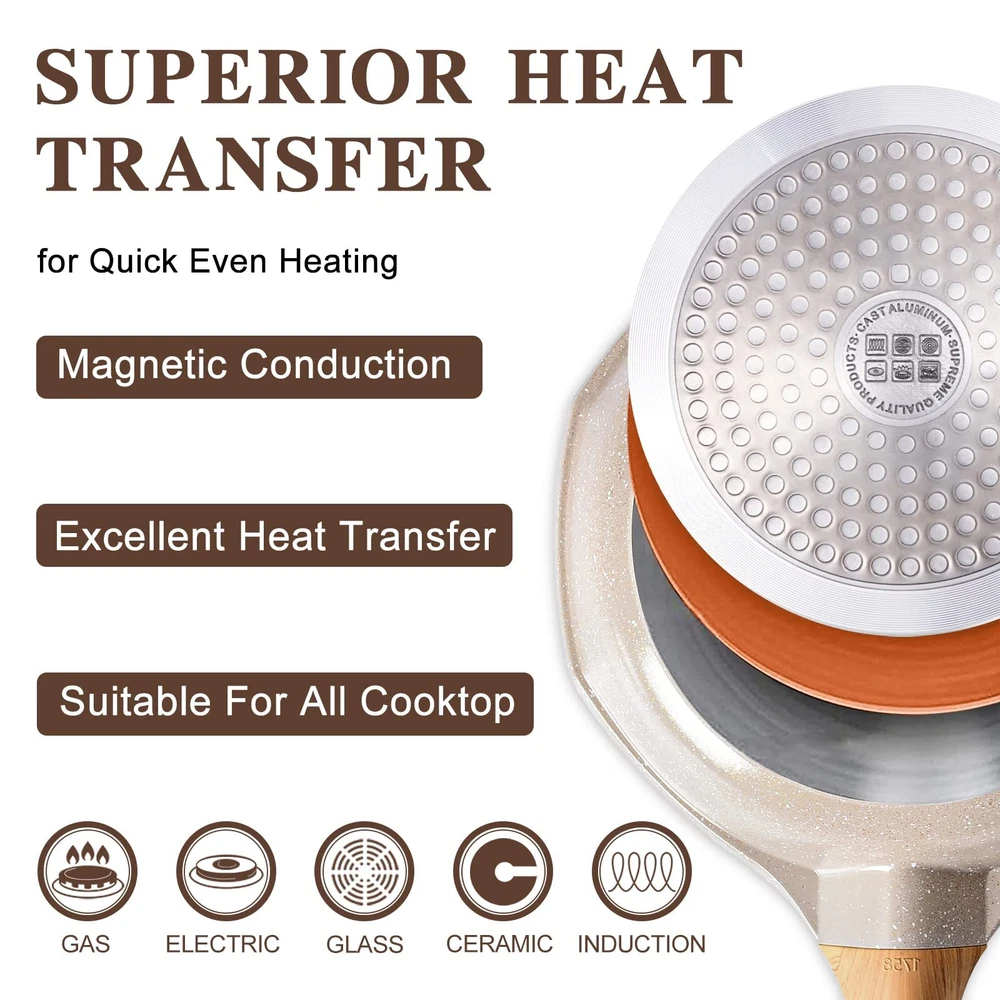 Nonstick Frying Pan Set - Granite Induction Pans for Cooking Omelette Non-Stick Cookware Set, Healthy Kitchen Skillet Non Sticking Stone Pot and Pan Set (8", 9.5" & 11") Beige Healthy Nonstick Frying Pan Set: The skillet set includes an 8" frying pan, a 9.5" frying pan and an 11" frying pan. Smokeless, green and healthy, very durable surface, great non-stick effect, ideal for using on low to medium heat. The stylish cookware set meets all your kitchen and family needs. Safety Non-Stick Granite Coating: The nonstick cooking set is made with a stone-derived nonstick coating inside out to deliver unprecedented nonstick performance - everything just slides right off with less oil & cleans up easily. The natural mineral nonstick coating is ultra-durable while remaining 100% free of PFOA, PTFA, lead, and cadmium. Compatible Induction Bottom: The granite omelette pans are made of premium aluminum alloy material combined with a magnetized base that allows for rapid heat transfer and long-time use, saves energy and time, satisfying cookware like induction, gas, ceramic, electric, halogen & solid fuel cookers. Not suitable for Oven. Unique & Convenient Design: The nonstick granite pans for cooking make it easy to cook food that the whole family will love. Break-resistant & does not warp, conducts heats quickly & evenly, 4.6 mm thicken induction compatible bottom provides a stable heat distribution during cooking, rapidly heating up, saves time and energy. The heat-resistant and anti-slip Ergonomic knob and handle are nice to grip, easy to maneuver, safe and anti-scald. Excellent After-Sale Service: The non-stick frying pan set has 100% passed the quality tests before they leave the factory! If you receive this frying pan with any damage or if it malfunctions in any way, please feel free to contact our service team directly for any questions. Shipping We offer FREE shipping on all orders! We use a selection of shipping services such as UPS, FedEx, USPS etc. We only ship to the lower 48 states, no APO/FPO addresses or PO Boxes allowed. Local pickups and combined shipping options are not provided at this time. Return You can return a product for up to 30 days from the date you purchased it. Any product you return must be in the same condition you received it and in the original packaging. Please keep the receipt. Payment We accept payment by any of the following methods: PayPal Please pay as soon as possible after winning an auction, as that will allow us to post your item to you sooner! Feedback Customer satisfaction is very important to us. If you have any problem with your order, please contact us and we will do our best to make you satisfied. Contact Us If you have any queries, please contact us via ebay. We usually respond within 24 hours on weekdays. Please visit our eBay store to check out other items for sale! Thank you for shopping at our store.
