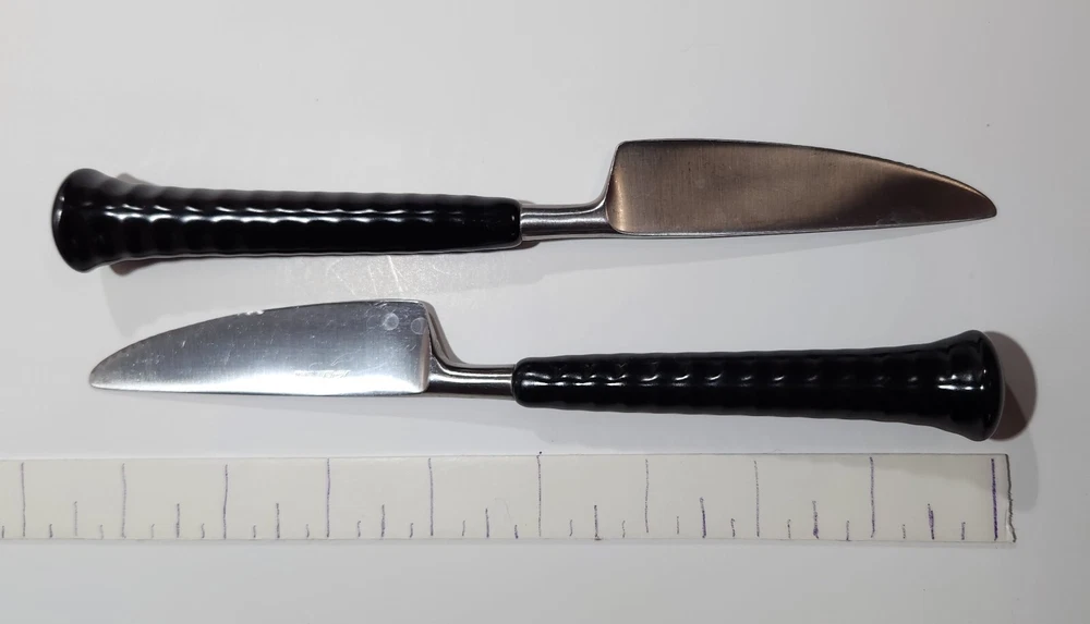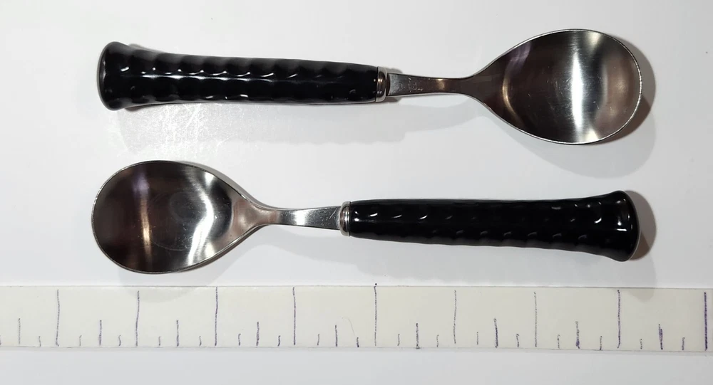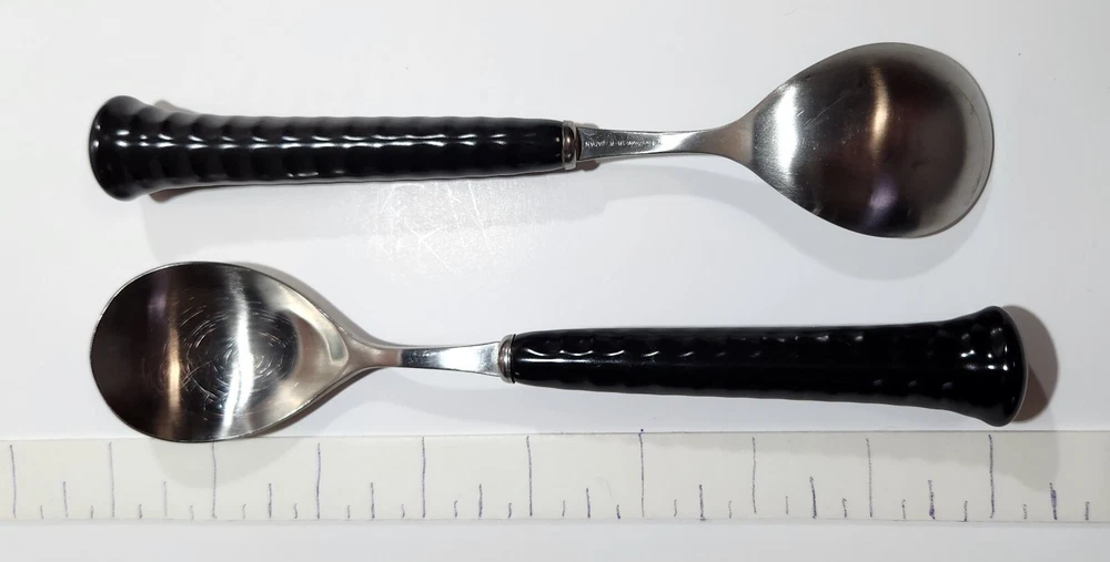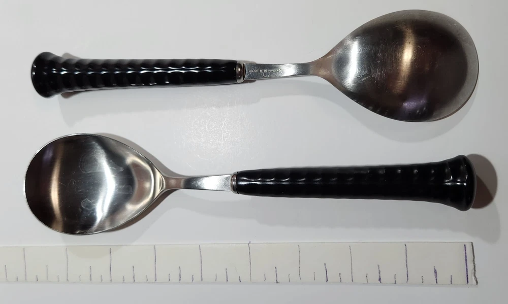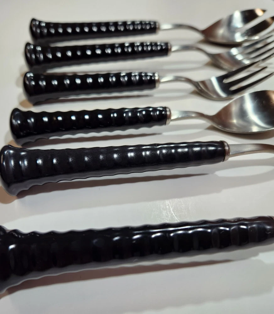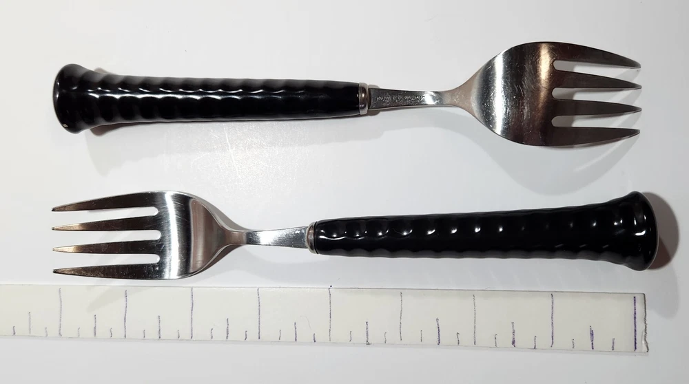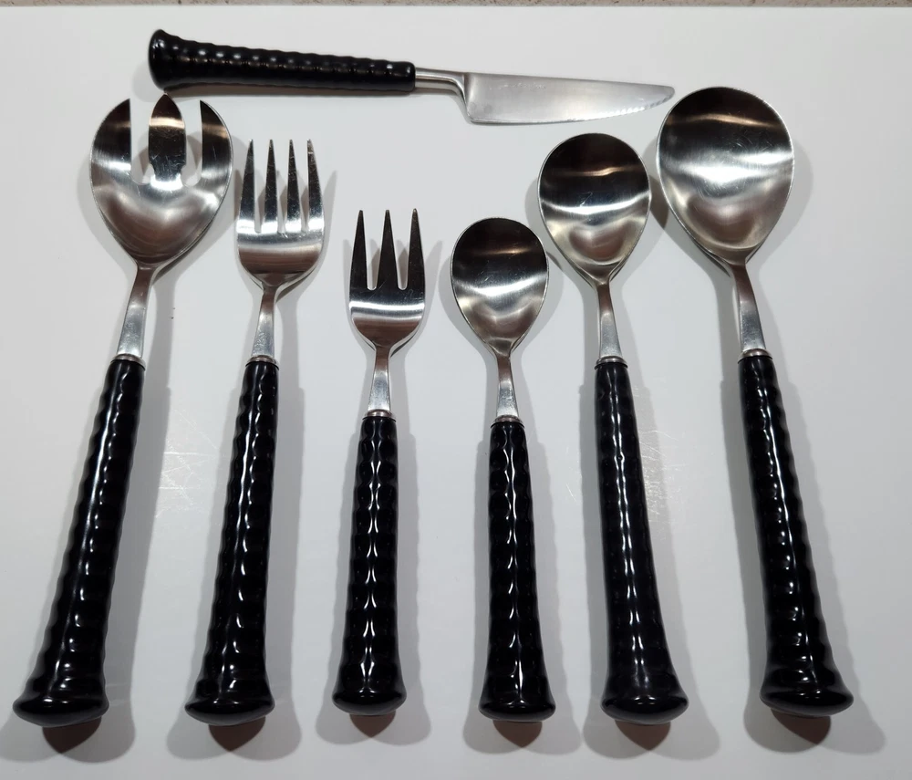 This MCM Noritake Primastone Decision Black 18-8 stainless flatware from Japan is a must-have for any collector or lover of unique flatware. The set features a sleek black color and ribbed handle that adds a touch of sophistication to any dining table. Made of durable stoneware and stainless steel, this vintage set is perfect for both everyday use and special occasions. With hand washing, this set will maintain its beauty for years to come. This flatware is perfect for those who love to mix and match their dinnerware and want a unique set that will impress their guests. Sold by the piece.