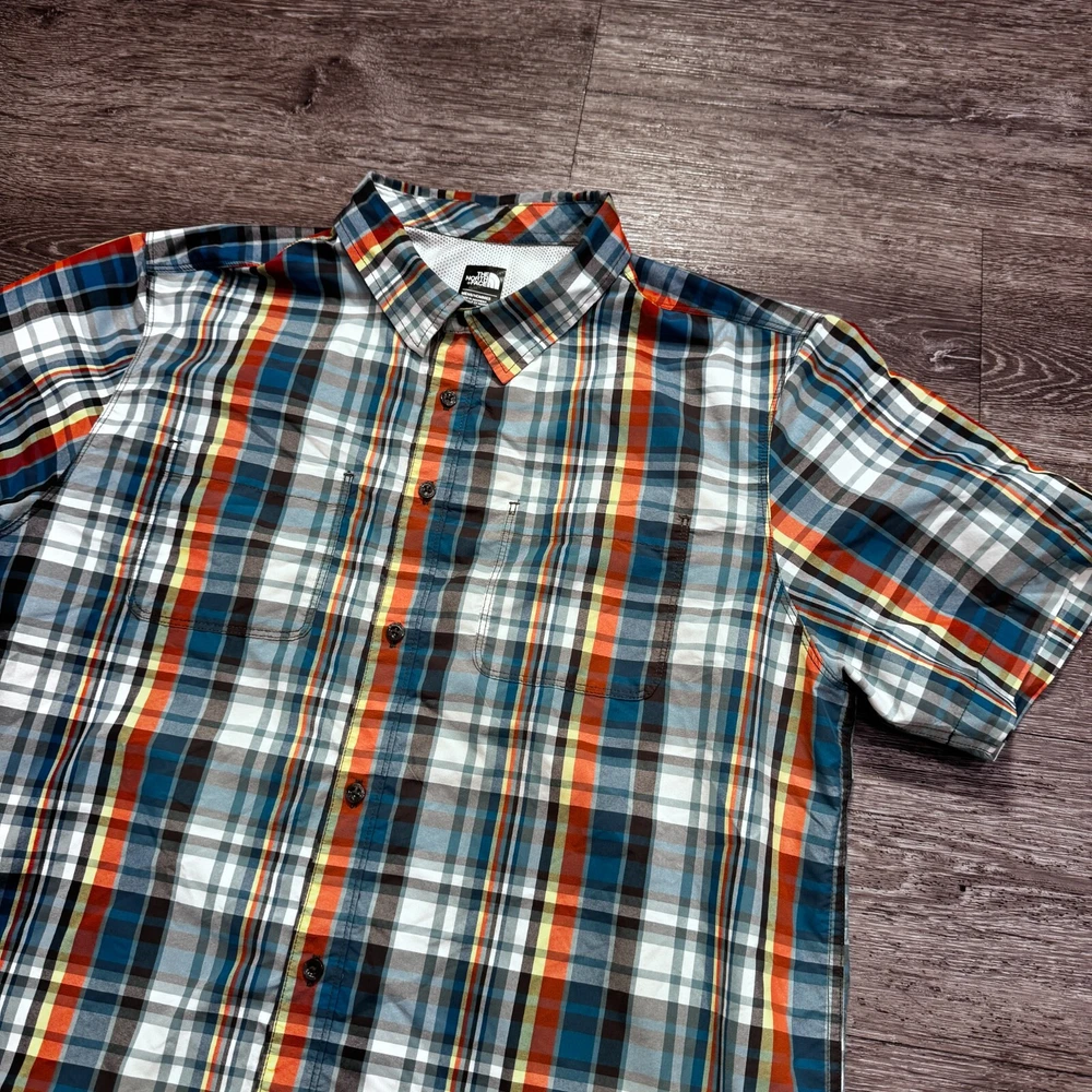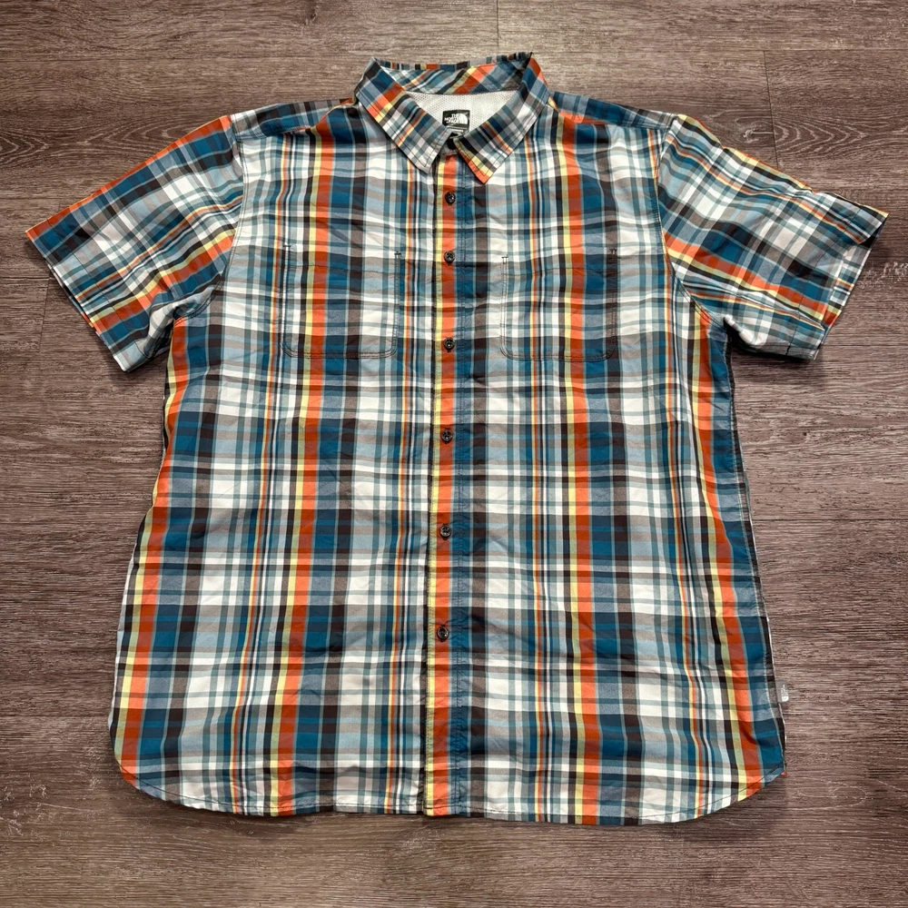 Theme: Outdoor Size Type: Regular Fabric Type: Woven Sleeve Length: Short Sleeve Collar Style: Point Color: Multicolor Brand: The North Face Closure: Button Pattern: Plaid Type: Button-Up Features: Breathable, Easy Care, Lightweight, Lined, Pockets Department: Men Accents: Button Fit: Regular Occasion: Casual, Travel, Workwear Neckline: Collared Size: L Material: Nylon, Polyester