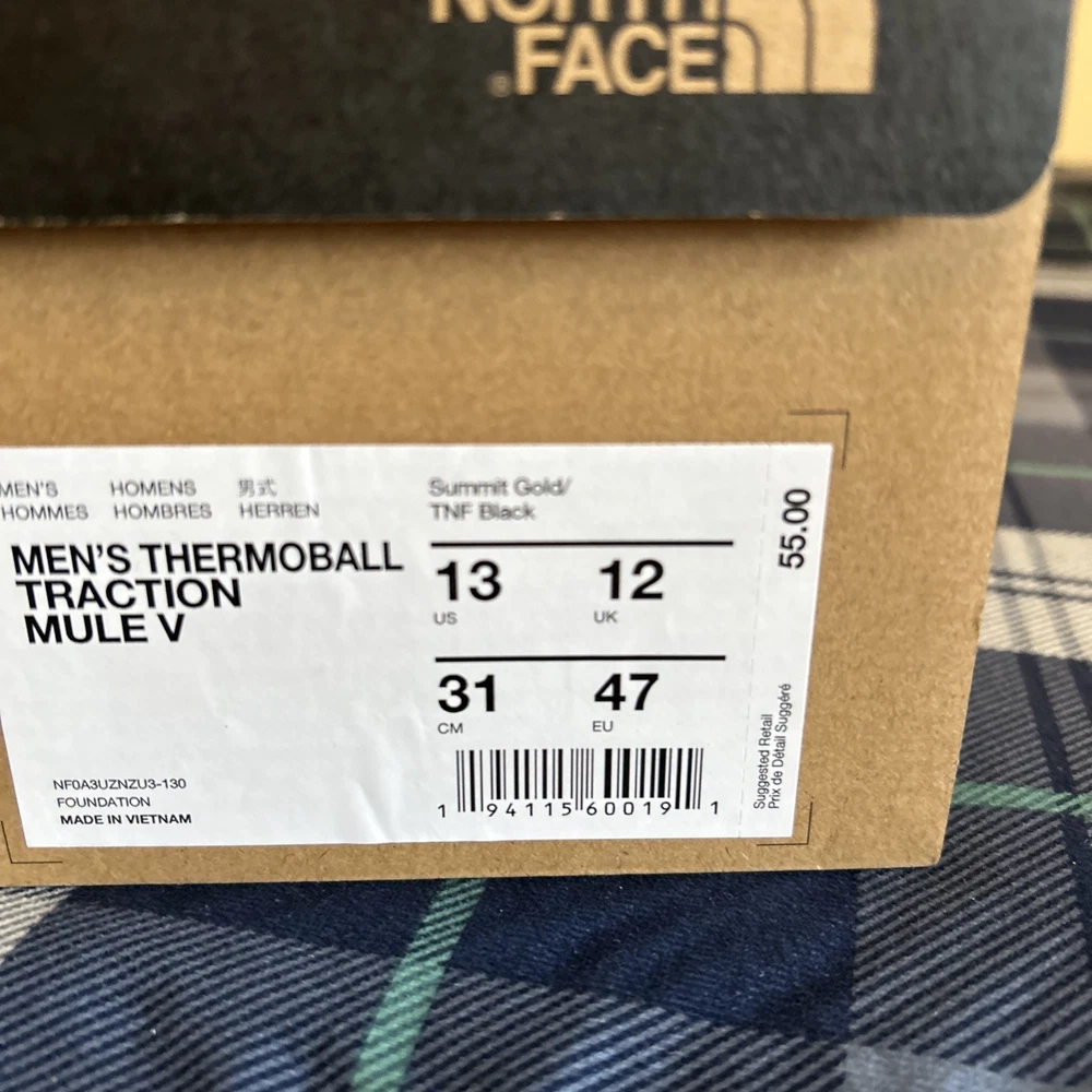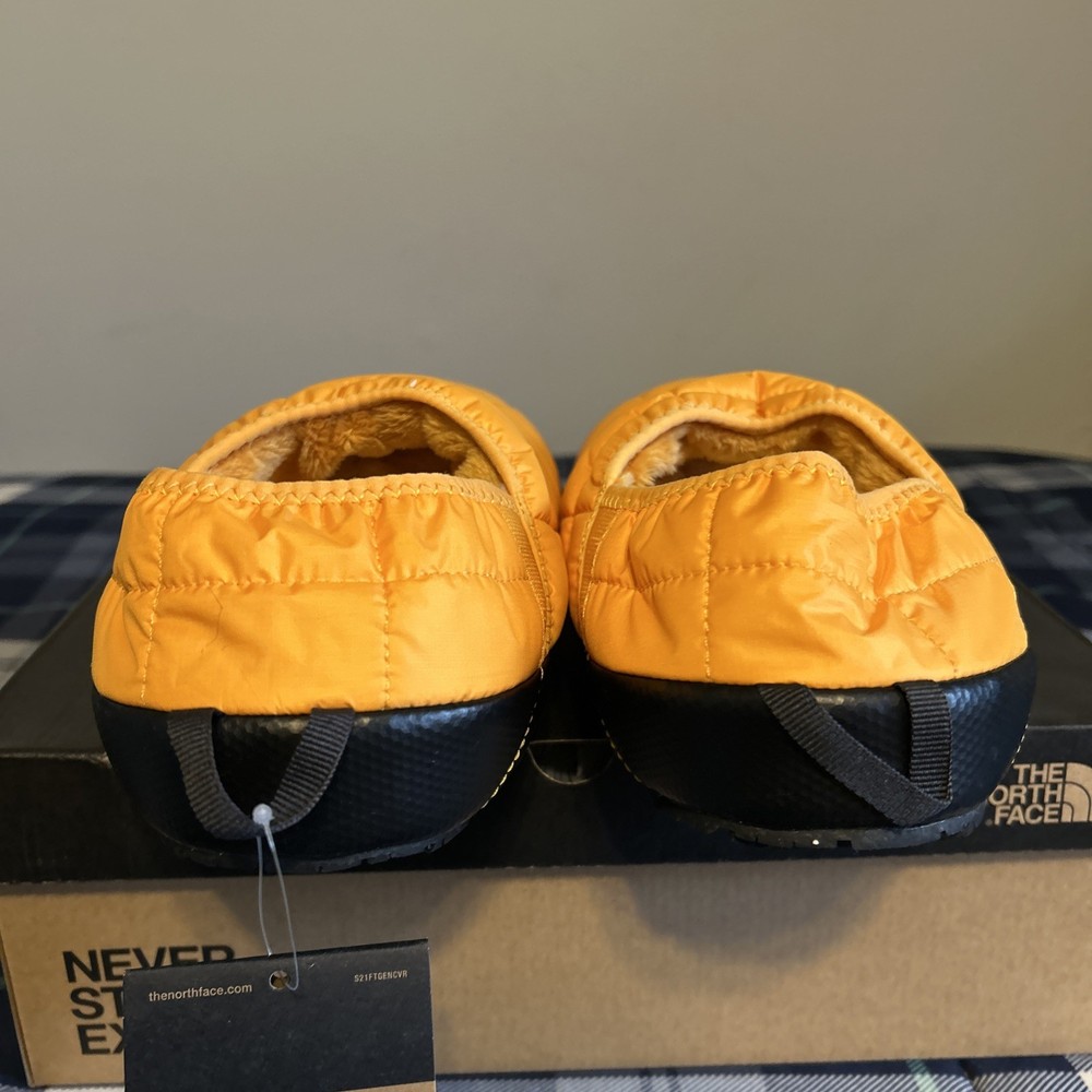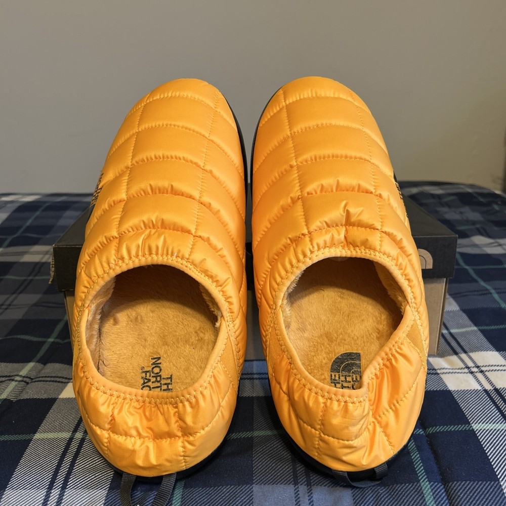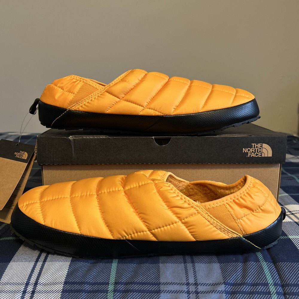 The product is a men's slip-on sandal by The North Face, featuring Thermoball technology for warmth and comfort. The sandal has a bright yellow color with a synthetic lining and polyester upper material. It is designed with a traction outsole for added durability and stability, making it suitable for outdoor activities. The stylish design and slip-on style make it a convenient and fashionable choice for everyday wear.