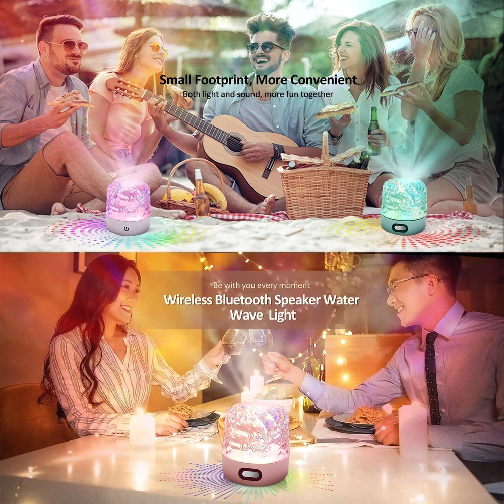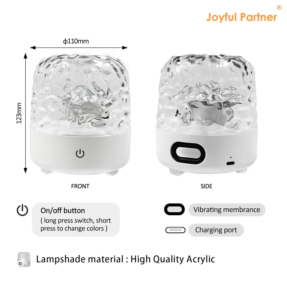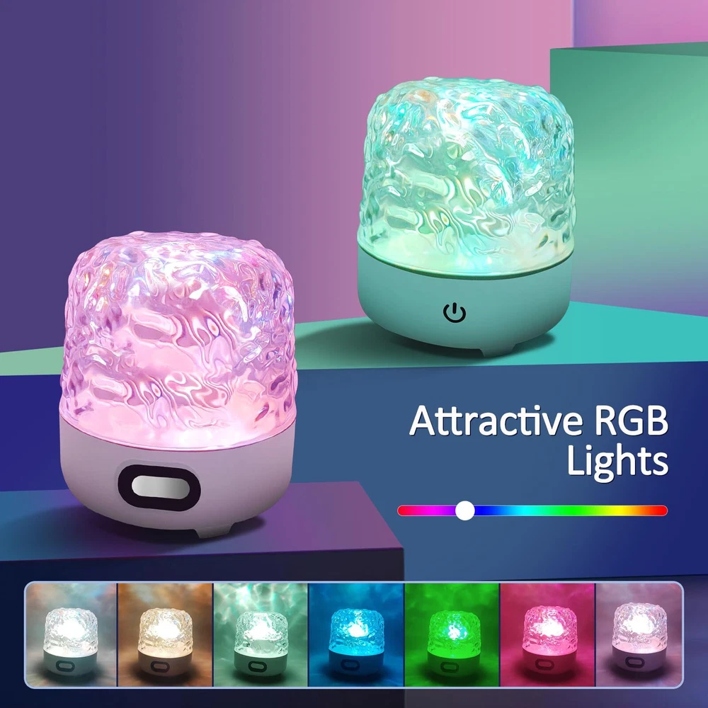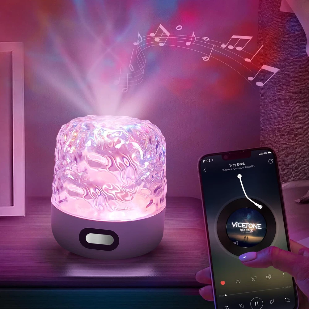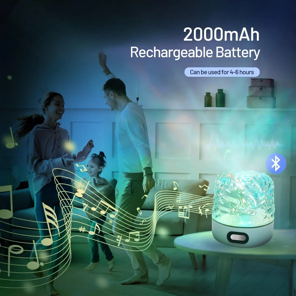 【Wireless Bluetooth Speaker & Rechargeable】The wave light projector built-in a high-quality Bluetooth speaker, that you can listen to your favorite music, and have relax from music and water ripple lights for ceiling projector. The galaxy projector have 2000mah capacity battery and continuous use for more than 5 hours after fully charged. The wireless design and rechargeable celestial water lamp can be placed in any environment to meet your need without limitation of space and power socket. Both indoor and outdoor. 【Multi-functional Galaxy Projector Light】The luminorthe cube lamp can be a ceiling projector, Bluetooth speaker, and night light. The aurora light uses four projection modes, including color jump conversion, gradient color switching, static/dynamic switching, and rhythmed switching, galaxy night light can creates a dynamic water ripple and shadow atmosphere, It is an excellent auxiliary water ripple light for decorating the room and taking pictures. Enjoy the beauty of space in the comfort of your home. The exquisite crystal table water lampshade adopts diamond cut surface to show the gorgeous temperament, decorate your living room and create a comfortable and romantic atmosphere. 【Remote Control & Touch Senor】The ocean wave night light projector with remote controller and sensitive touch senor keys, Touch control options provide a simpler and more intuitive experience, The dynamic night light projects colorful lights onto the ceiling and walls in any smooth space. equipped with multiple light color, adjustable gradient light source and adjustable light color frequency, 4 dynamic modes, you can choose any lighting effects and customize your room's ambiance to your personal preference. With its remote control functionality, easily customize the light color, brightness, and movement speed to create the great atmosphere for relaxation or imaginative play. 【Great Gift & Indoor/Outdoor Use】The ocean light projector has a unique and beautiful design, It's a wonderful gift for family and friends, Our water ripple lamp is very suitable for indoor bedroom decoration, parties, weddings, children's rooms, living rooms and outdoor camping, tent, backyard, garden, party in the open. The sound machine with light is the best gift choice for holidays, birthdays, Christmas, New Year and other festivals. This night light sound machine will bring endless surprises to your children, friends, family, or loved ones. 【High-Quality Material】The dynamic night light has an optical acrylic lampshade.The crystal-clear material ensures high light transmittance, delivering a beautiful, comfortable, and soft lighting effect. water ripple light also have dustproof features, making them suitable for both indoor and outdoor use. This galaxy projector ambient lighting are very easy to install without tools.