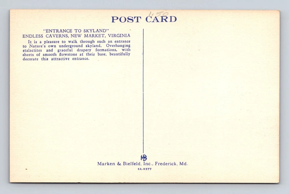 Nuevo Mercado VA-Virginia, Entrada a Skyland, Cavernas Interminables, Postal De Colección