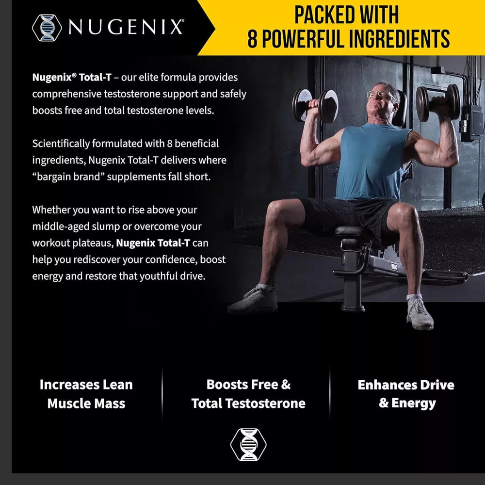 Total-T, Free and Total Testosterone Booster Supplement for Men 90 Count Brand B randed Flavor Unflavored Primary Supplement Type Testofen Unit Count 90.00 Count Item Form Capsule Item dimensions L x W x H 3.2 x 3.2 x 5.6 inches Special Ingredients LCitrulline Malate Diet Type Gluten Free Product Benefits Energy Management Age Range (Description) Adult About this item: Our new and improved compound, which is scientifically formulated, aids in increasing lean muscle mass and free and total testosterone levels. By safely increasing testosterone levels, our elite men's supplement is made to help men 40 and older reach their full potential. Without the use of stimulants or unnecessary fillers, Nugenix Total-T's ingredients have been clinically shown to provide more powerful and comprehensive testosterone support where others fail. You can keep your youthful edge as you get older with this potent, one-of-a-kind testosterone booster. Developed by the most popular GNC men's brand.