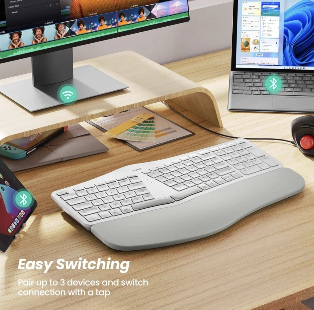 Exceptional Comfort: Standard keyboards force you to hold your wrists and arms at angles that can cause discomfort or pain in your hand, arm, or shoulder. With Nulea ergonomic wireless keyboard, it can help you position your body more properly, with your shoulders relaxed and can reduce the risk of fatigue and injury by its split, splayed and curved design. Easy Switching: By Bluetooth and 2.4G USB, the Nulea bluetooth keyboard can establish connections with up to three devices simultaneously and switch between them by pressing a button. This function allows you to utilize the keyboard to begin writing an email on your computer, switch to your smartphone to send a brief text message, switch to your laptop to change the background music, and then switch back to your PC to finish that email with one-tap. Adjustable 7 Color Backlight Lighting: The wireless bluetooth keyboard has a colorful backlit design. You can choose your own brightness and lighting kind with its 3 brightness levels and 7 color options, depending on your preferences. You can choose from blue, green, red, cyan, purple, yellow, and white. Choosing your favorite keyboard setting and take your desk setup to the next level.(When the battery level is below 10%, the keyboard will turn off backlight to ensure basic user functionality). USB-C Quick Charging: You’re getting tired of being bothered with battery problems. With its larger internal battery (2000mAh) and longer operating time—especially when the backlight is off—this wireless rechargeable keyboard enables you to focus entirely on your work without pesky interruptions. While the battery indication is on, recharge using the USB-C charging cord. Simple and practical. Adjustable Tilt Legs: With 4 adjustable tilt legs, you can adjust the wireless keyboard to 3 different tilt levels. So that your hand and wrist will feel less of pain because of the comfort that you will have. The purpose of this design is to always keep your wrist in a comfortable position for different postures.