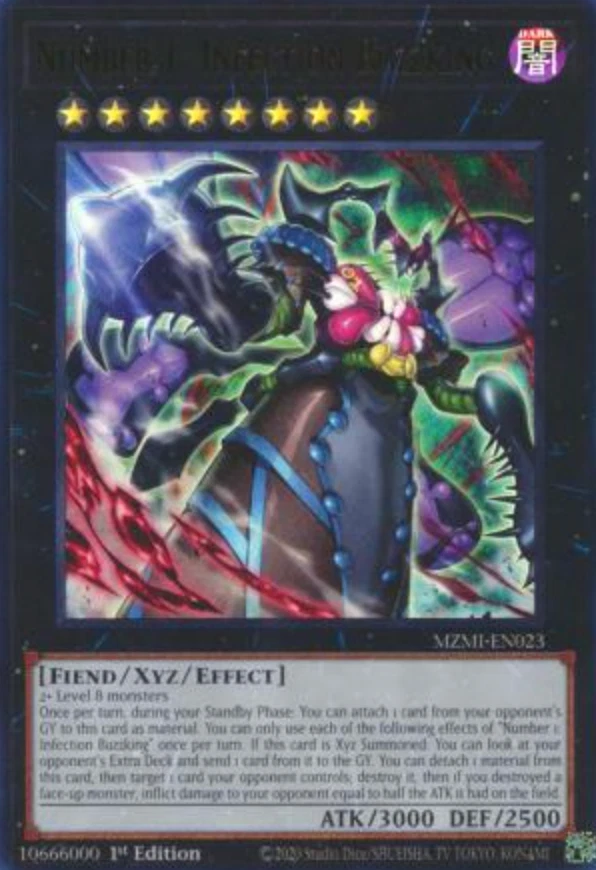 Product Details 2+ Level 8 monsters Once per turn, during your Standby Phase: You can attach 1 card from your opponent's GY to this card as material. You can only use each of the following effects of "Number 1: Infection Buzzking" once per turn. If this card is Xyz Summoned: You can look at your opponent's Extra Deck and send 1 card from it to the GY. You can detach 1 material from this card, then target 1 card your opponent controls; destroy it, then if you destroyed a face-up monster, inflict damage to your opponent equal to half the ATK it had on the field. Number: MZMI-EN023 Rarity: Ultra Rare Attribute Monster Type/Card Type: DARK Fiend/Effect Xyz Monster Level: 8 A / D: 3000 / 2500