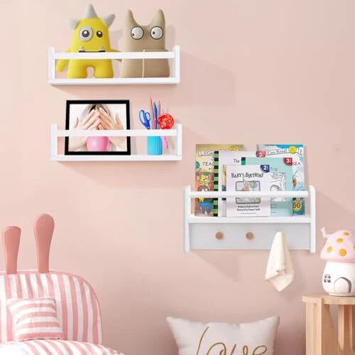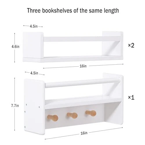 Return Policy Fast Delivery Trusted seller Nursery Floating Book Shelves for Wall White 16 Inch Hanging Bookshelf for Kids Room Wall Mount Baby Book Wall Shelves Bathroom Organizer Wall Shelf Teen Boy Girl Room Decor a Set of 3 Product Description Multifunctional Multi-Creative Floating Bookshelf:2 x 16-inch children's bookshelves and 1 x 16-inch wall book shelf with hooks can be used to place picture books, small stuffed toys, model cars, Barbie dolls and other items. You can also install the shelf upside down and hang items from the bottom cross bar. Suitable for All Occasions: The unique combination is designed to accommodate most small items. The book shelf for wall can help organize floor space and make places tidier, and hanging on the wall can hold items that won't fit on the countertop. So, it is very suitable for children's room, bathroom, bedroom, kitchen, living room and other places. Decorative Wall Shelves: Simple style long floating shelves complement the decor of your home. The white floating shelves can hold photos, records, artwork, canvases, books and other items. The bedroom wall shelf has a unique groove design throughout, which keeps the placed framed photos stable and won't slide. Easy to Assemble and Install: This multifunctional floating shelf set is simple to assemble and easy to install, you can install independently. The package includes all the accessories to install the wooden floating nursery shelf. If you find any problem with the floating bookshelf, please contact us in time, we will reply within 24 hours and strive to satisfy you. Sturdy Storage Space:These sturdy and reliable nursery bookshelves are made of solid wood material with a layer of water-resistant paint for storing your child's books, toys, keepsakes and decorations. Protective crossbars on the front prevent items from falling, and the bottom hooks are designed for hanging items. Shipping Returns Payment Shipping Shipping is FREE to all addresses other than APO/PO boxes in the lower 48 states. All our stock ships from US-based warehouses. Shipped via USPS or UPS (depending on location and package weight) Unless stated otherwise, all orders will ship within 24-72 hours of your payment being processed. Check our feedback to see the great reviews of FAST shipping we offer. Returns Seller does not accept returns Payment We currently accept payment via eBay managed payments only. Once payment is cleared, we will dispatch your shipment within 1-3 business days. Please refer to the "Shipping" tab for more information regarding shipping speed to your destination.