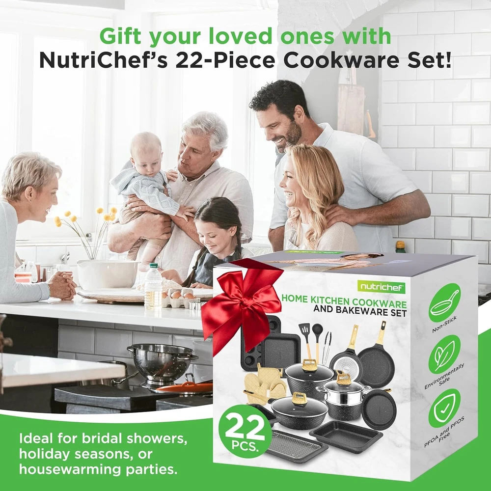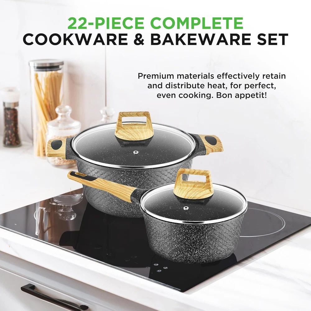 COOL- HANDLE GRIPS - Elevate your cooking comfort with cool-, form-fitting handle grips that provide a secure hold and reduce the risk of burns. Enjoy precision and control in the kitchen while effortlessly maneuvering your nonstick pans. USER-FRIENDLY DESIGN - Embrace eco-conscious cooking with our food-grade ready and user-friendly kitchenware. The pots and pans nonstick set is constructed with care, that is ready to use for gas, electric, ceramic, and induction counter cooktops. MULTI-SIZED COOKING POTS - Master the art of versatile cooking with our bakeware set's multi-sized pots, with glass lids for precise temperature control. From small to large, these pan kits cater to all culinary needs, ensuring perfectly cooked meals. MARBLE NON-STICK COATING - Experience durable and long-lasting non-stick performance with our black cookware set, ensuring effortless cooking and cleaning. The high-quality marble coating is PFOA and PFOS free for a safe culinary experience. On Dec 15, 2024 at 18:43:02 PST, seller added the following information: