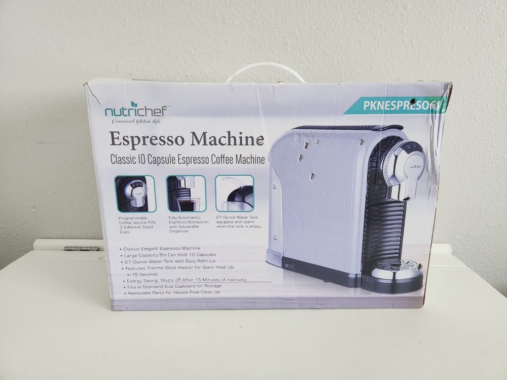 Nutrichef PKNESPRESO60 Espresso Machine. Brand new, open box. Technical Specifications Power Rating-1260 Watts Construction Material-ABS, Plastic Capacity-27.0 Ounce Coffee Spout Height-4.30' inches Capsule Capacity-10 Capsules. Pump Pressure-19Bar Heat Up Time-up to 15 seconds Water Tank Capacity-27 Ounce Stand by Time-15 Minutes Power Cord Length-38.6" inches Power-120V/60H2 Dimensions (LxWxHI 14.2" x 4.60" x 9.75" inches
