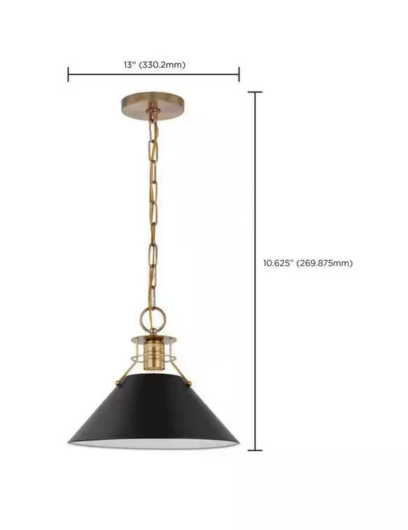 Open, airy and full of charm, the Outpost 60-7523 medium pendant features a unique style all its own. The cone shade is suspended with slim rods, showcasing the exposed decorative burnished brass socket and a slight peek of the vintage bulb. The matte black finish on the metal shade is the perfect companion to the burnished brass finish on the base, chain and canopy. The applications are boundless with the ability to illuminate a variety of areas in your home. Highlights Uses one 60-Watt incandescent medium base bulb Fixture measures 13 in. Dia x 10.625 in. H Rated for indoor use in dry locations Finished in matte black with burnished brass accents and matching metal shade Adjustable height to suit your needs
