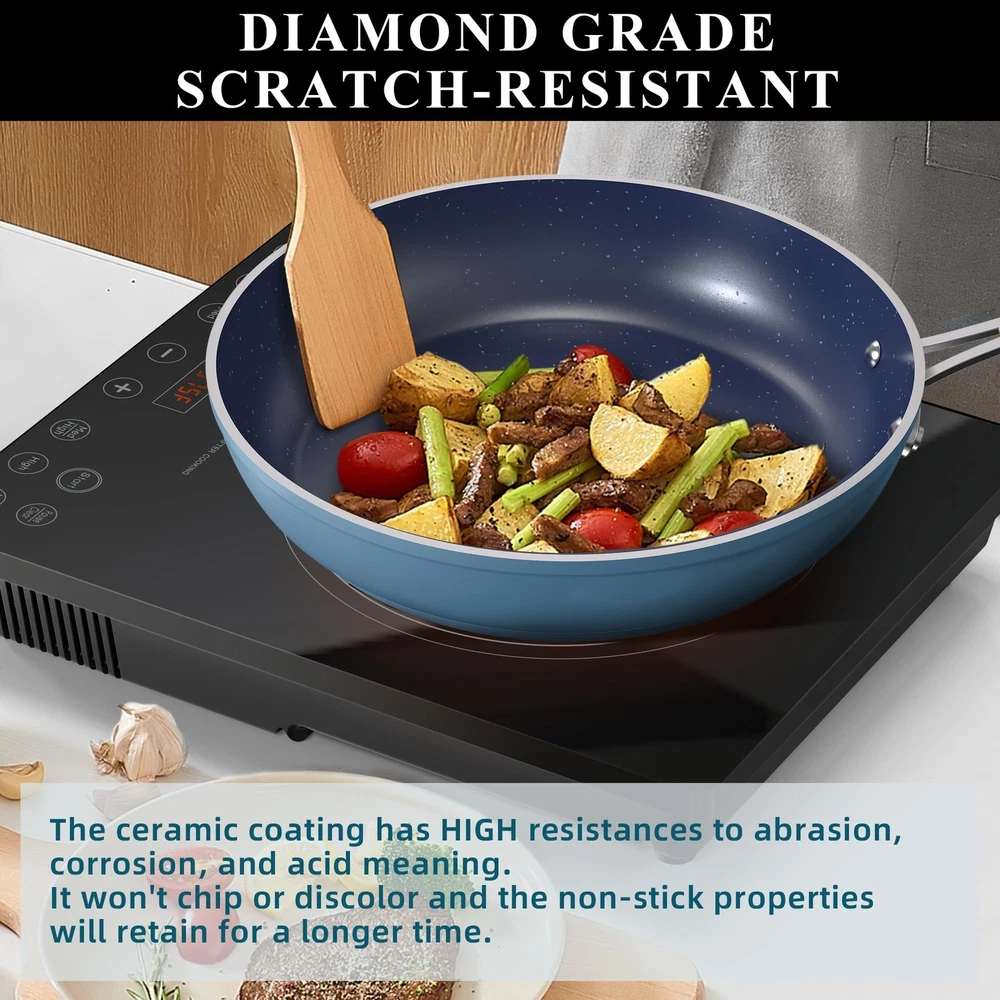 Nuwave 9pc Cookware Set Healthy Duralon Blue Ceramic Nonstick Coated, Diamond Infused Scratch-Resistant, PFAS Free, Oven Safe, Induction Ready & Evenly Heats, Tempered Glass Lids & Stay-Cool Handle Material Ceramic Color Cozy Blue Brand Nuwave Size 9pc Set Handle Material Stainless Steel PREMIUM FORGED CONSTRUCTION – Forging makes the cookware strong and durable yet lightweight and easy to handle. It is a work-of-art where form meets function. It is constructed to perform well under any situation at any skill level. HEALTHY DURALON BLUE COATING – The eco-friendly, ultra-non-stick Gen10 Duralon Blue is all-natural ceramic coating free of harmful chemicals like PFAS*, PTFE, PFOA, lead, and cadmium. It also does not emit toxic gases at higher temperatures. *Tested by TÜV Rheinland for 106 known PFAS elements and none were detected. GENERATION 10 (G10) CERAMIC – For more than a decade, we have continuously perfected our Duralon Ceramic Coating. G10 Duralon Blue is exceptional in every category. It heats fast and evenly; releases food effortlessly; and is extraordinarily durable. DURALON BLUE HARDNESS – Hardness is rated at 9H. Since diamond is rated at 10H, It is extremely strong. It has HIGH resistances to abrasion, corrosion, and acid meaning it won’t chip or discolor and will retain its non-stick properties longer. INDUCTION READY & EVEN HEAT DISTRIBUTION – Every cookware is bonded and reinforced with anti-warp SS plate on the bottom to make it induction ready. This bonding delivers fast, even heat distribution, and superior heat retention at any temperature. Shipping We offer FREE shipping on all orders! We ship within Three business days of payment, usually sooner. We use a selection of shipping services such as UPS, FedEx, USPS etc. We only ship to the lower 48 states, no APO/FPO addresses or PO Boxes allowed. Local pickups and combined shipping options are not provided at this time. Return You can return a product for up to 30 days from the date you purchased it. Any product you return must be in the same condition you received it and in the original packaging. Please keep the receipt. Payment We accept payment by any of the following methods: PayPal Please pay as soon as possible after winning an auction, as that will allow us to post your item to you sooner! Feedback Customer satisfaction is very important to us. If you have any problem with your order, please contact us and we will do our best to make you satisfied. Contact Us If you have any queries, please contact us via ebay. We usually respond within 24 hours on weekdays. Please visit our eBay store to check out other items for sale! Thank you for shopping at our store.