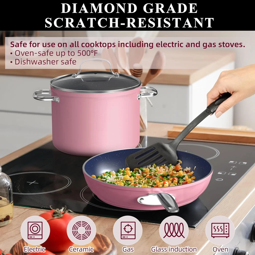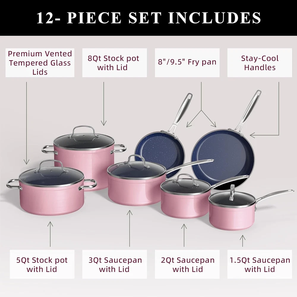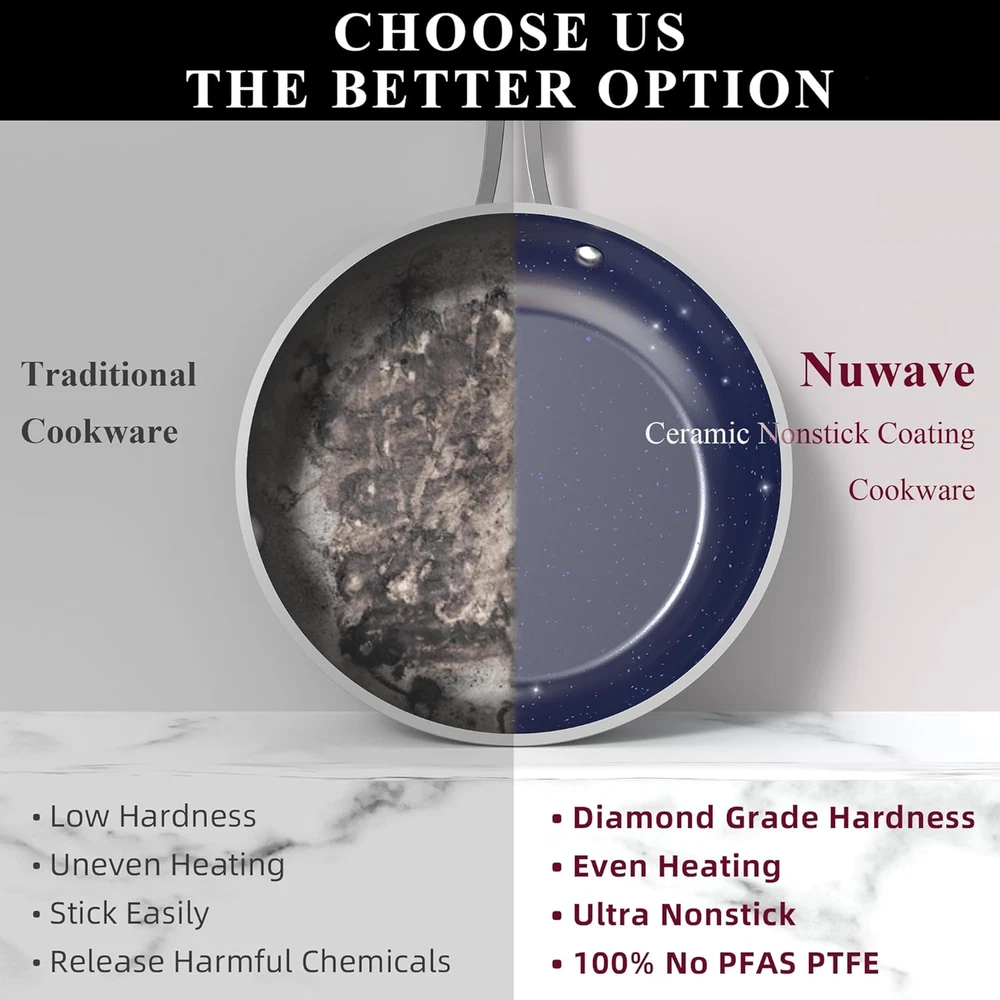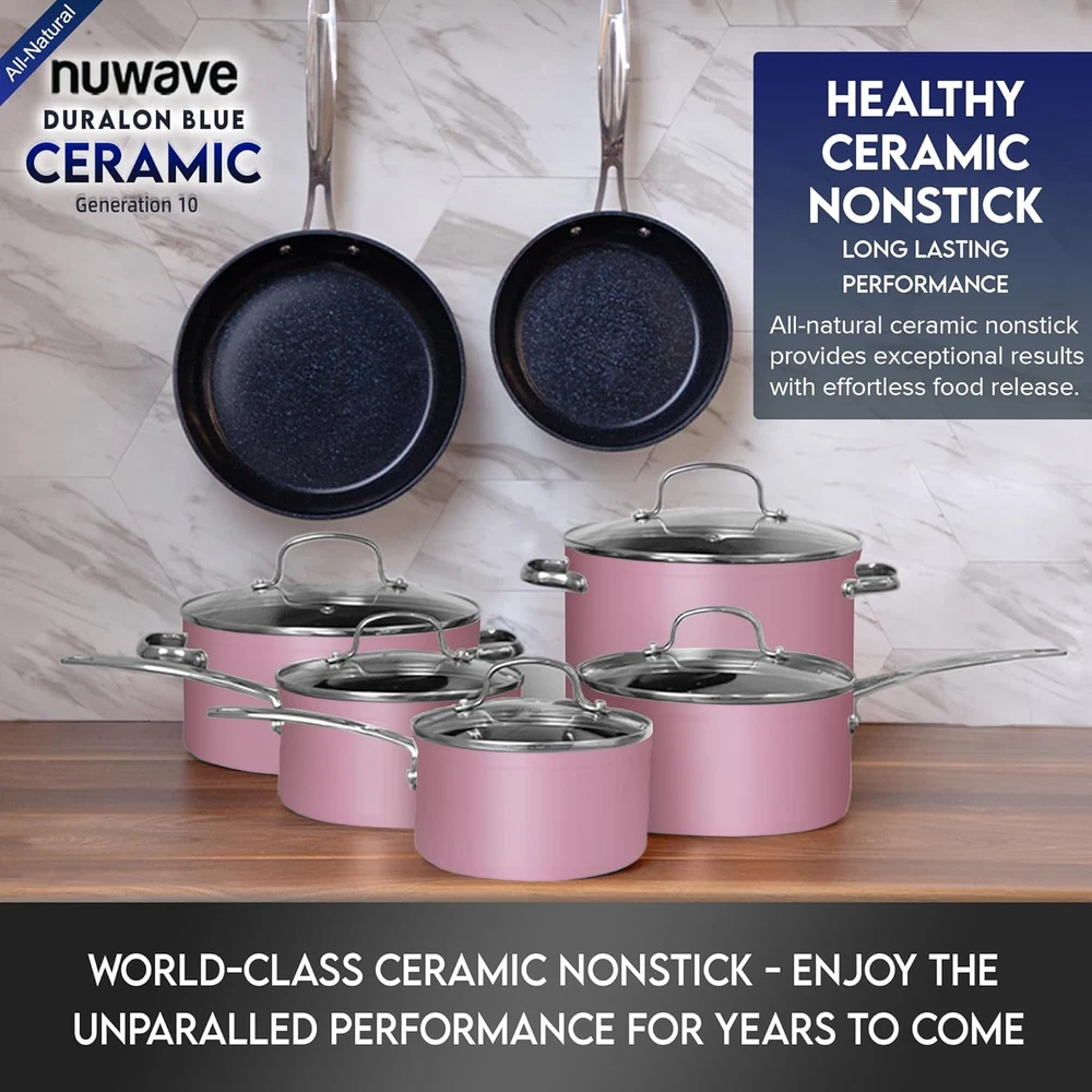 Store New Arrivals Add to Favorite View Feedback Contact Nuwave Healthy Duralon Blue Ceramic Nonstick Cookware Set, Diamond Infused Scratch-Resistant, PFAS Free, Dishwasher & Oven Safe, Induction Ready & Evenly Heats, Tempered Glass Lids & Stay-Cool Handles Description Item model number 31412 Manufacturer Nuwave Closure Material Glass Number of Pieces 12 Item Volume 8 Quarts Color Dusty Pink Included Components 5QT Stockpot with Lid, 3QT Saucepan with Lid, 1.5QT Saucepan with Lid, 8QT Stockpot with Lid, 2QT Saucepan with Lid Brand Nuwave Material Ceramic Country of Origin China Style Cookware Set Is Dishwasher Safe Yes Item Weight 25.7 pounds Is Oven Safe Yes Handle Material Stainless Steel Material Type Free PFOA Free, PTFE Free Special Feature Induction Stovetop Compatible Package Dimensions 23.17 x 13.55 x 12.57 inches Compatibility Options oven Size 12pc Cookware Set PREMIUM FORGED CONSTRUCTION – Forging makes the cookware strong and durable yet lightweight and easy to handle. It is a work-of-art where form meets function. It is constructed to perform well under any situation at any skill level. HEALTHY DURALON BLUE COATING – The eco-friendly, ultra-non-stick Gen10 Duralon Blue is all-natural ceramic coating free of harmful chemicals like PFAS*, PTFE, PFOA, lead, and cadmium. It also does not emit toxic gases at higher temperatures. *Tested by TÜV Rheinland for 106 known PFAS elements and none were detected. GENERATION 10 (G10) CERAMIC – For more than a decade, we have continuously perfected our Duralon Ceramic Coating. G10 Duralon Blue is exceptional in every category. It heats fast and evenly; releases food effortlessly; and is extraordinarily durable. The ceramic coating is not *chemically* nonstick but gets pretty darn close. DURALON BLUE HARDNESS – Hardness is rated at 9H. Since diamond is rated at 10H, it is extremely strong. It has HIGH resistances to abrasion, corrosion, and acid meaning. It won’t chip or discolor and will retain its non-stick properties longer. INDUCTION READY & EVEN HEAT DISTRIBUTION – Every cookware is bonded and reinforced with anti-warp SS plate on the bottom to make it induction ready. This bonding delivers fast, even heat distribution, and superior heat retention at any temperature. Product Description ABOUT US We offer the best prices around on high quality products. Our E-store includes media such as books, movies, music and games while offering electronics, toys, sporting apparel, clothing, tools, general home, garden items and more. SHIPPING We are always working hard to ensure your package arrives as soon as possible. Please understand that some factors like weather, high postal traffic, and the performance of shipping companies are outside of our control. We offer free shipping to the lower 48 states and ship within 7 business days of payment, usually sooner. We do not accept P.O. Boxes. Please provide a physical address. For shipping outside of the continental USA, we only use eBay's Global Shipping Program.The item is shipped to KY and then sent to the rest of the world. International customers are responsible for all duties and taxes. Continue to check out in order to calculate costs for shipping the item to your country. Messages regarding eBay's Global Shipping Program MUST be directed at eBay EXCLUSIVELY. RETURNS We offer a 30-Day Return Policy on items which you are not completely satisfied with. You have the option for a full-refund or an exchange of the item. No returns are available on items shipped outside of the USA. PAYMENT We accept PayPal. CONTACT US This page content is yet to come Please ad us to your favorite seller and visit again later Thank You CUSTOMER SATISFACTION We try our very best to make sure every customer is completely satisfied. If there's a problem, message us! We're happy to help. WE ACCEPT Copyright © 2021 AutoDS. | All Rights Reserved