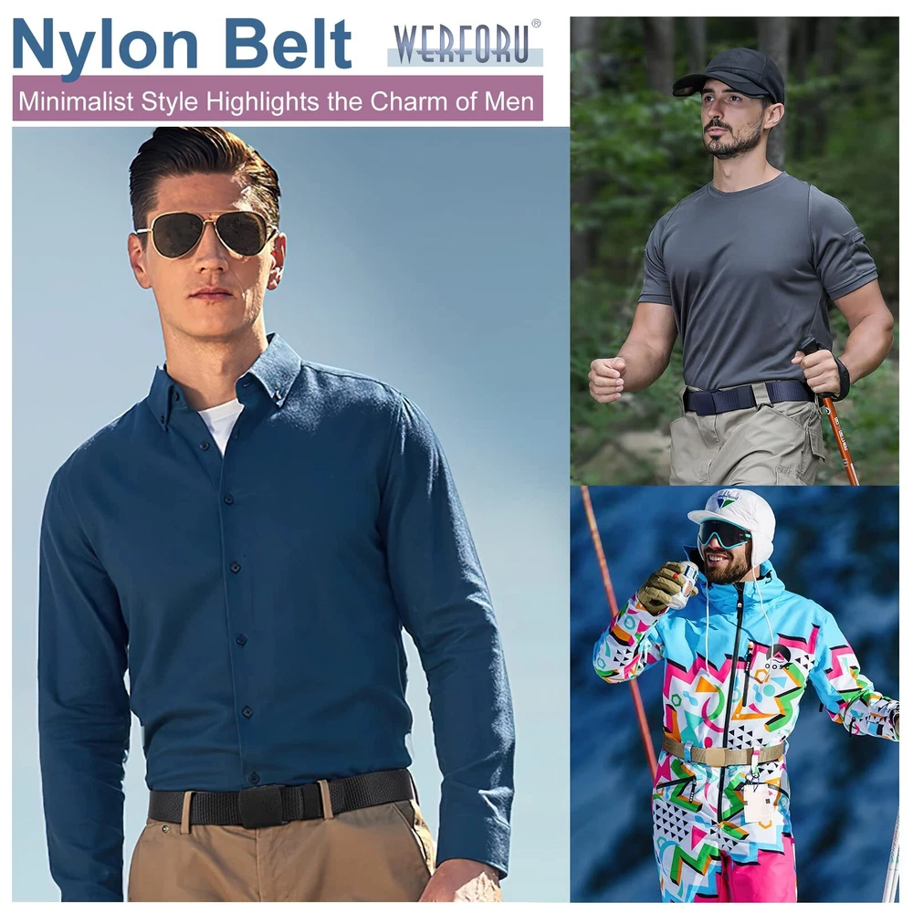 Nylon Belt for Men Military Tactical Belt Canvas Outdoor Web Belt with Plastic Buckle Premium Quality Nylon Material Men's nylon tactical belt is made of high-quality nylon material, it is lightweight and wear-resistant, with fast sweat evaporation, quick-drying, breathable. Strong Durable Plastic Buckle Nickel Free, Non-Allergic. Allow you to be able to go through a metal detector or airport security without having to take it off. The plastic buckle design is also a good choice for someone metal allergy to wear. No Hole Adjustable Belt No holes nylon webbing with flip top buckle design, hold tightly,supper easy to use, no longer worry about adjusting the strap holes. Just slide the strap into the buckle, adjust to fit your waist size then press to close. Trim to Perfect Size The buckle is removable, If the Strap is too long for you,you can cut the excess strap to the perfect size. Color: black,khaki,blue,gray ,coffee Four Kinds of Combination Black+khaki Black+khaki+Blue Black+khaki+Gray Black+khaki+Blue+Coffee Various Match Simple fashion style designed for men, you can wear it in your daily life, matching your jeans/pants/shorts/ski pants/golf dress/cargo pants. And it can also match many style military uniform. Full Occasions Support Awesome accessory for your outdoor sports and daily wearing. Such as hiking, camping, skiing, gardening ,riding ,hunting or fishing and and other casual occasions etc. QUALITY NYLON BELT-- Premium nylon webbing, lightweight, soft, breathable,flexible, sturdy and durable, sweat absorption and dry fast. Compare with the leather belt, the nylon belt won’t be cracked and aged after long times using. PLASTIC BUCKLE DESIGN---Designed with metal-free plastic buckle, which is not easy to crack and breakage. Nickel free plastic buckle, feel comfortable and easy to wear. Non-metallic buckle belt allow you a easy/quick clearance at the security checkpoint at the airport. And especially suitable for metal allergy to wear. VARIOUS COLLOCATION---We have 2 pack,3 pack,4 pack nylon belt for your choice.Different colors nylon belt meet your different daily wear needs. Lightweight, quick dry, comfort nylon material strap with plastic buckle suitable for daily wearing with all pants, and outdoor heavy duty work or sports (hiking pants, ski pants, snow pants etc). A great gift for your friend and relatives! OCCASION---Available in black,khaki,blue,gray ,coffee 5 colors for choose,enough quantity and color to match all your daily outfit. This nylon belt is not only for daily wear, but also more suitable to outdoor sports, such as: climbing mountains, hiking, golf, hunting, fishing ,skiing and so on. FULLY ADJUSTABLE---6 size for your choice,meet most people needs. Belt strap width is 1.5 inches,easy to pass through most pants. No holes belt design, so its tightness and length can be adjusted freely to meet different wearing requirements. If the strap is too long for you, you can trim the strap length to fit your size. The ratchet buckle design makes the belt non-slip, stay tight full day.