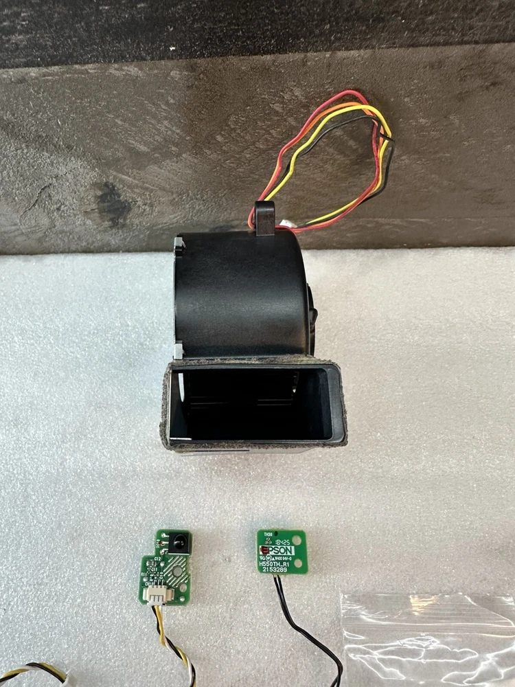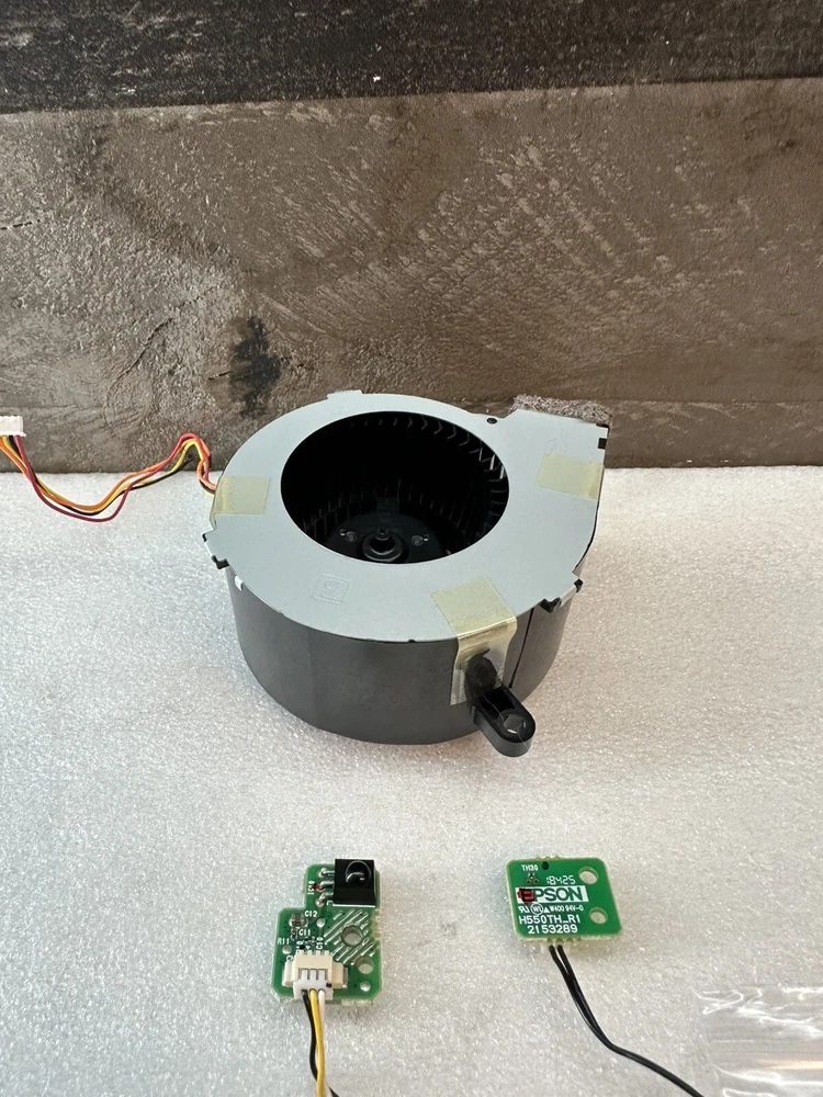 OEM Toshiba CE-7039L-301 Cooling Fan For Epson Projectors w/ Sensors & Wiring was removed from an Epson 760 H848A Open Box Projector. Fan has been tested and functions properly. It has minimal dust and overall looks good. Fan includes the sensors, wiring, and mounting screws. We are unable to confirm other Epson models that this may be compatible with, however, if the fan's model number is the same it'll likely work perfectly. Listing is for a replacement fan, wires, and sensors only. Shipping: This will ship via USPS Ground Advantage to most destinations. Return shipping is not included, so please verify your model's specific compatibility to avoid unnecessary charges in the event of a return.
