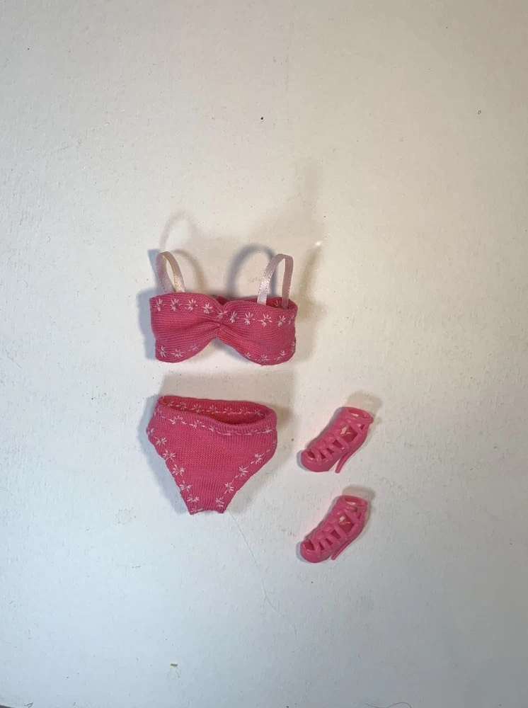 Please Note: This outfit will not fit older, larger busted Barbies. This OOAK clothing set is designed for a modern Barbie doll and includes pink bra, panties/swimsuit, shoes, and outfit. The set is tailored for a modern body-type Barbie doll and features a pink color scheme. The clothing types included are undergarments, shoes, swimwear, and nightwear, suitable for various occasions such as leisurely wear, lounging, and beachwear. Made from stretch knit cloth material, these unique pieces add a touch of individuality to your Barbie doll's wardrobe. Please note that this set does not include the doll itself.