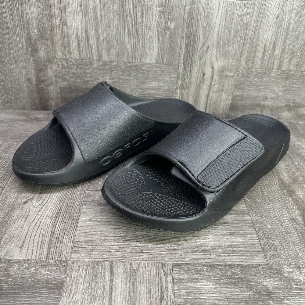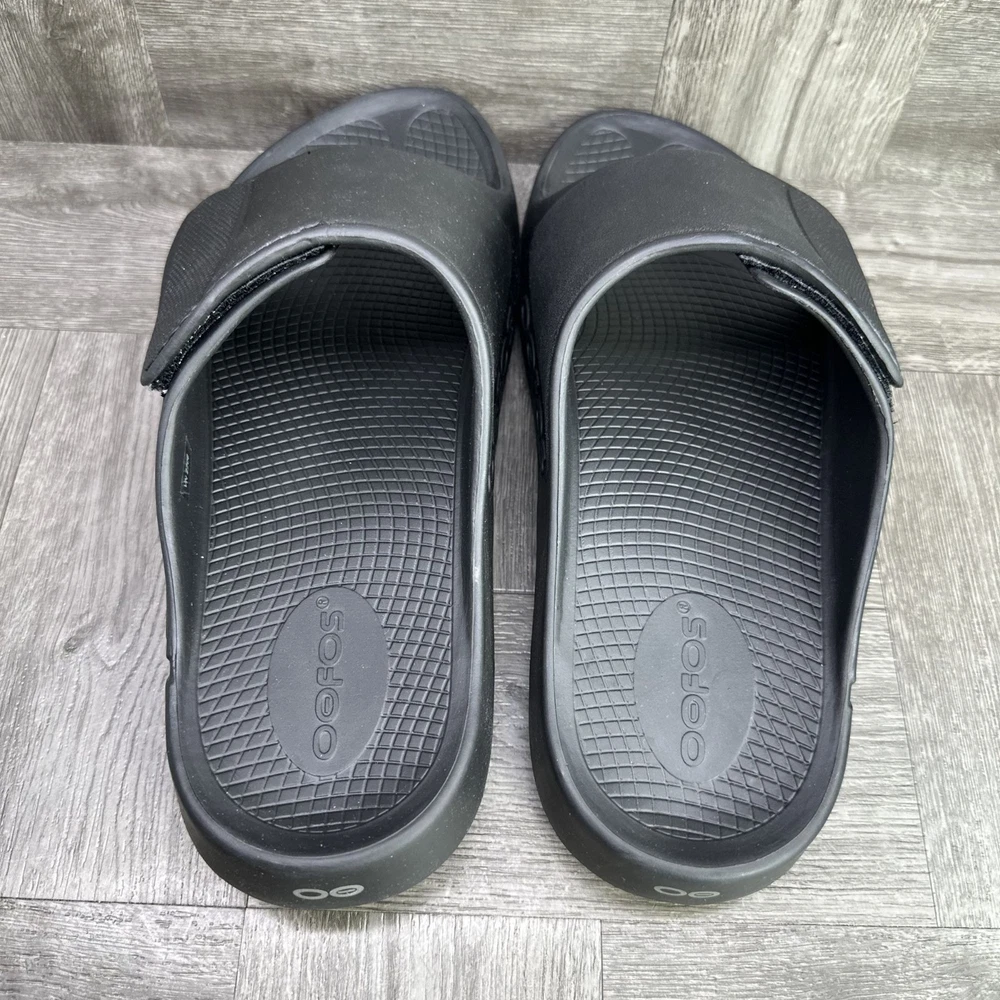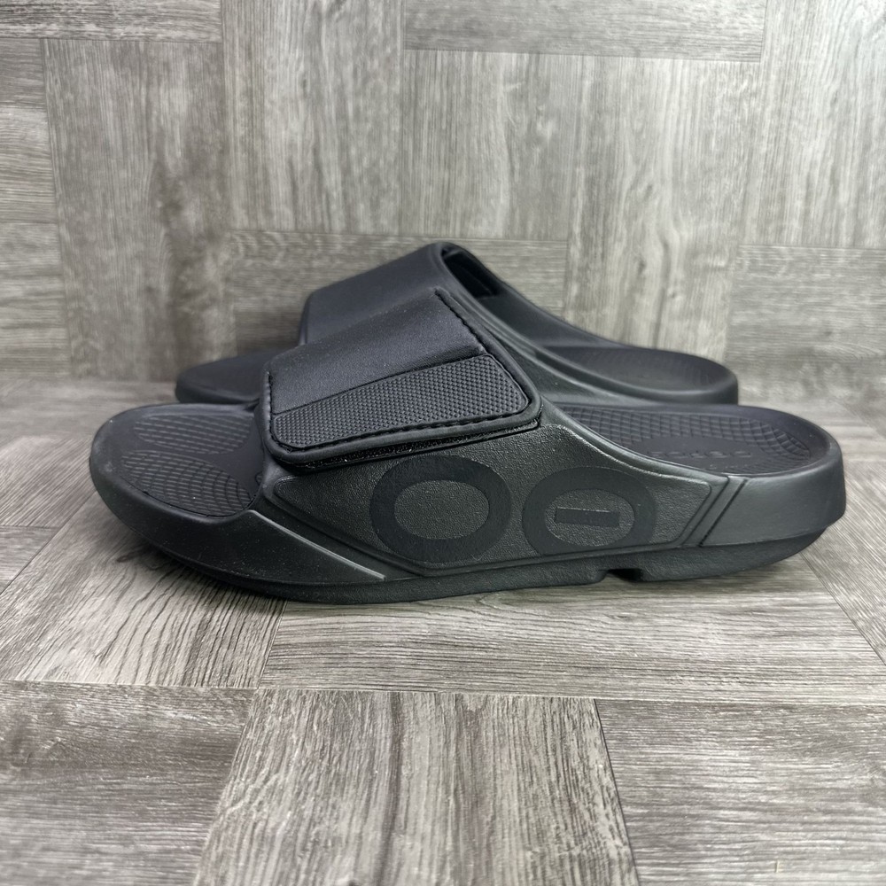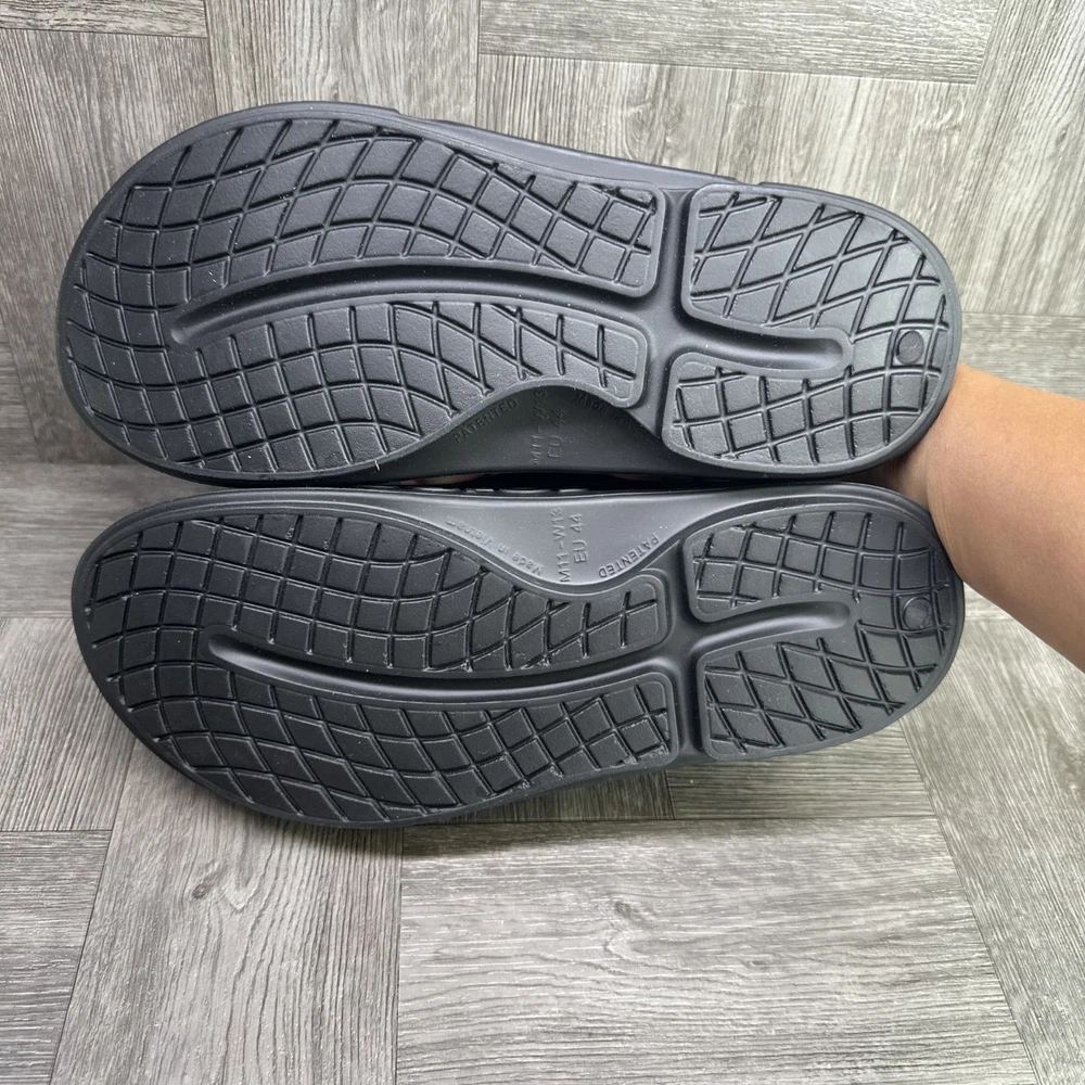 The OOFOS OOahh Sport Flex Men's Slides in size 11/EURO 44 Black are a comfortable and stylish footwear option for men. With a slip-on closure, rubber outsole, and synthetic lining material, these sandals are perfect for activewear or casual occasions during the summer, fall, and spring seasons. Featuring the signature OOFOS logo accent and a solid black color, these slides offer a sporty theme and standard shoe width. Made with synthetic upper material and a rubber insole, these OOFOS sandals provide a comfortable and durable option for men looking for a versatile and practical footwear choice.