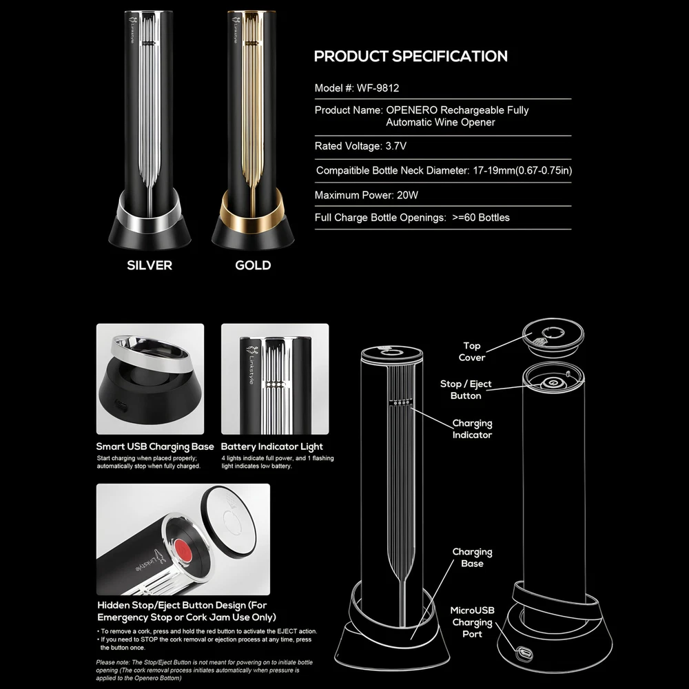 【Quick and Effortless Cork Removal】: Say goodbye to manual cork struggles! Our electric wine opener provides fully automated cork removal, taking just 5-7 seconds to extract corks with precision. Simply position it over the bottle, and let the technology do the work. Ideal for wine enthusiasts of all levels, this gadget transforms the act of opening wine into a seamless and enjoyable experience. 【Crafted with Premium Materials for Durability】: Engineered with high-grade aluminum, our opener ensures long-lasting performance without compromising style. This wine corkscrew is built to withstand frequent use, making it a reliable tool for your wine moments. The premium craftsmanship highlights its luxurious appeal, making it a must-have for any wine gadget collection. 【Elegant Design for Wine Enthusiasts】: Our electric wine bottle opener redefines sophistication, combining a sleek, modern design with luxurious aesthetics. This wine accessory isn't just functional; it's a statement piece that complements any wine lover's collection. Perfect for enhancing the ambiance of wine nights, dinner parties, or as a standout addition to your wine gifts for women or wine gifts for men. 【Rechargeable Convenience with Charging Base】: Powered by a robust 500mAh Li-ion battery, this opener ensures you’re ready to enjoy your favorite bottles at any time. The rechargeable wine bottle opener includes a charging base and USB cable for convenient recharging, with a single charge capable of opening over 60 bottles. Battery level indicators add an extra layer of convenience, making it the perfect companion for gatherings, wine tastings, and celebrations. 【Versatile Features and Stylish Packaging】: Our wine opener comes with an integrated foil cutter and an additional aluminum steel cutter for effortless foil removal. Packaged in an elegant gift box, this opener is perfect for occasions like weddings, housewarmings, and wine tasting parties. Its versatile functionality makes it an ideal addition to any wine gift set or accessory collection. 【Backed by the LINKSTYLE Guarantee】: At LINKSTYLE, we prioritize quality and customer satisfaction. That’s why we offer lifetime technical support and a 1-year warranty covering all mechanical and technical defects. With our commitment to excellence, you can enjoy your wine experiences worry-free. This electric wine bottle opener is the ultimate combination of style, functionality, and durability, making it a standout gift for wine enthusiasts and a staple in any wine accessory collection.