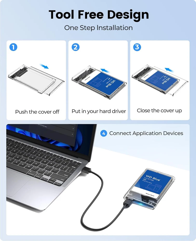 ORICO 2.5'' External Hard Drive Enclosure USB 3.0 to SATA III Transparent Product Details Material: Plastic Item Weight: 0.22 Pounds Memory Storage Capacity: 6 TB Compatible Devices: Laptop Hard Disk Form Factor: 2.5 Inches Max Number of Supported Devices: 1 Data Transfer Rate: 6E+3 Megabits Per Second Manufacturer: ORICO Technology Co.,Ltd Product Dimensions: 4.92 x 3.11 x 0.51 inches Item Weight: 3.52 ounces Item model number: USB 3.0 Is Discontinued By Manufacturer: No Country of Origin: China Hardware Interface: USB 3.0 Brand: ORICO Color: Transparent Product Dimensions: 4.9"L x 3.1"W x 0.5"H Hardware Platform: PC,Laptop Easy to See Which Drive Inside: ORICO 2.5 hard drive enclosure made of high-quality transparent crystal PC material. The clear ssd case design allows you to see the inside drive without opening it Portable Hard Drive Enclosure: ORICO external hard drive enclosure can easily hook up your old 2.5inch SATA I/II/III hard drive to transfer files from one PC to another PC, laptop, PS4 or as a USB external hard drive. A 50cm USB-A cable is included for flexible connection and portability Super Easy to Use: Tool free installation. Plug & Play, No driver needed for this SATA enclosure. Just push out the cover, plug in the drive, close the cover and go. Hot-Swappable. The blue LED indicator to let you know the working status of this hard disk enclosure easily SuperSpeed USB 3.0 with UASP: The SATA interface of the 2.5 ssd enclosure supports UASP SATA III transmission protocol, which is 70% faster than traditional USB3.0. The maximum data transfer rate of the USB 3.0 interface is 5Gbps. Backward compatible with USB 2.0 or 1.1 ports Wide Compatibility: This ORICO SATA hdd enclosure helps to connect your 2.5inch SATA I/II/III hard drive SSD to PC, Laptop, TV and PS4. The hard drive enclosure is suitable for 2.5 inch 7mm/9.5mm 6TB solid hard drives, and is compatible with Windows, LINUX and Mac OS and above systems
