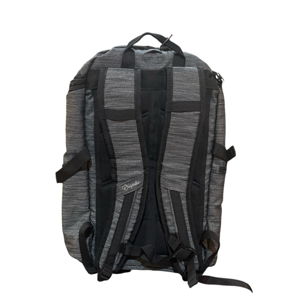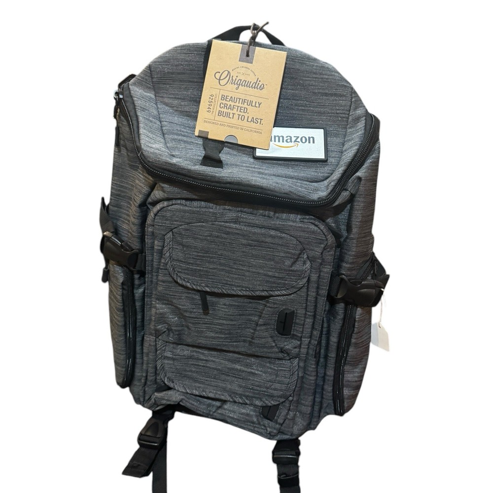 NWT ORIGAUDIO Mission Pack Laptop Backpack Tech Work Bag Cooler Amazon Logo New with tags - never used. Has a brushed aluminum AMAZON logo plate attached to top flap. Large front pocket is insulted like a lunchbox cooler.