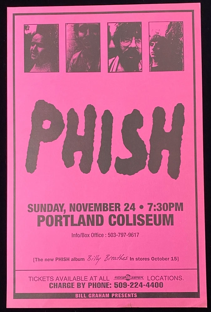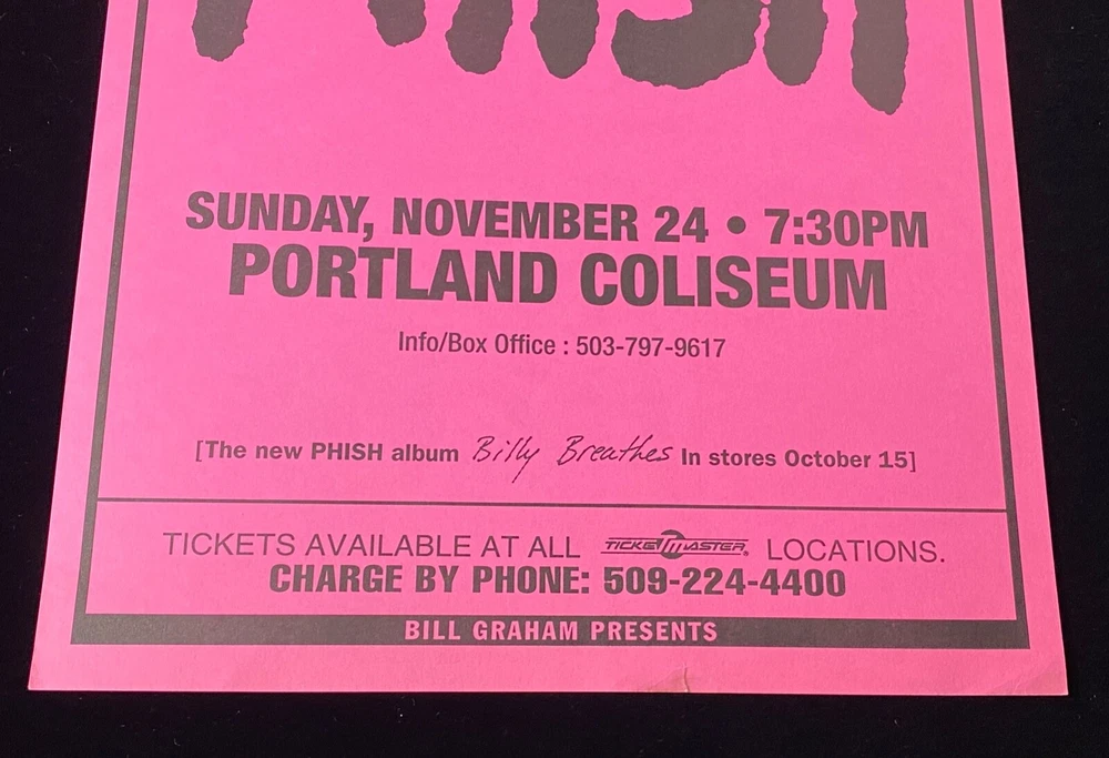 CHECK OUT OUR 7 DAY AUCTION FOR PHISH CONCERT POSTERS ENDING WEDNESDAY 11/27! Up for sale is an original 1996 Phish concert poster from their legendary performance at the Portland Coliseum . Presented by Bill Graham Presents , this poster commemorates Phish’s show on Sunday, November 24, 1996 , and is an essential collectible for Phish fans and concert poster enthusiasts alike. Specifications : Dimensions : 17 inches by 11 inches. Artist : Unknown. Date of Event : November 24, 1996. Venue : Portland Coliseum. Condition : Great overall condition, with slight tear and stain at the bottom center (see photos for details). Material : Semi-thick cardstock with a matte finish on the front and clean back. Printing Type : Original lithograph printing. Condition Details : Front : The bold pink and black design is bright and eye-catching, featuring black-and-white portraits of the band members across the top. All event details are clearly legible, including information about the release of the Billy Breathes album . Minor tear and light stain at the bottom center , which does not detract significantly from the overall presentation (refer to photos). Back : The reverse side is clean and smooth, free from major marks, discoloration, or writing. Notable Features : Bill Graham Presents : Produced under the iconic banner known for its visually stunning and highly collectible concert posters. Commemorates the Portland Coliseum show, part of Phish’s Billy Breathes tour. Authentic details include contact information, Ticketmaster hotline, and event branding. The black-and-white photo portraits of the band members add a nostalgic and personal touch to the poster’s design. Why Buy This Poster? This original 1996 Portland Coliseum Phish poster is a rare and vibrant piece of music history, perfect for collectors or anyone seeking to celebrate the band’s creative energy during this era. Whether you're a Phish enthusiast, a concert memorabilia collector, or an admirer of unique poster designs, this lithograph captures the spirit of an unforgettable performance. Don’t miss your chance to own this rare collectible! Message with any questions or to request additional photos. Thank you for checking out this listing!