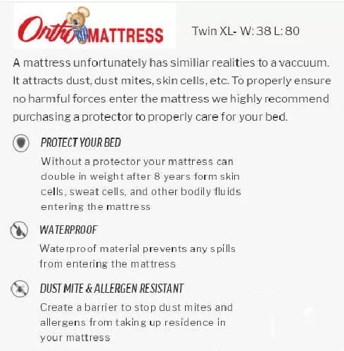 ORTHO SUPREME MATTRESS PROTECTOR Click Image to Enlarge Click Image to Enlarge I accept Here is one Ortho Supreme Mattress Protector size Twin XL. 38" wide, 80" long. This creates a barrier to stop dust mites and allergens from taking up residence in your mattress. Machine washable. Made of 100% polyester. Laminate backing is 100% breathable polyurethane. Waterproof. In its original sealed plastic package. New. Never been used. Package is 2" thick. Gross weight: 1 pound 2 ounces. This will ship inside a cardboard box. On the outside I'll write HANDLE WITH CARE. Consider these options for a package weighing 1 pounds 10 ounces and add your preference to the total. UNITED STATES: Shipping is set at calculated, making it less expensive the closer you are to me in Los Angeles; Estimated delivery 2-10 days Priority Mail comes with free insurance, Estimated delivery 2-4 days .