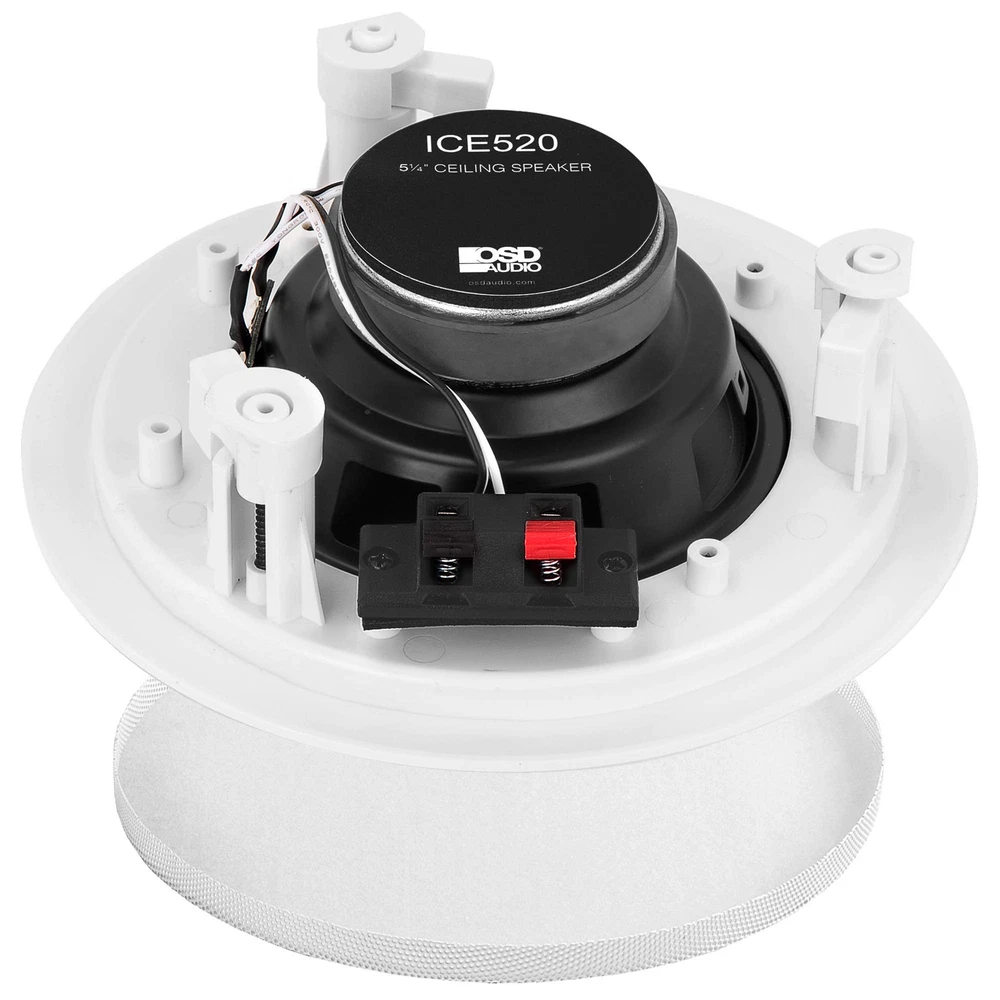 COMMERCIAL: ’s ICE520 is perfect for in-ceiling commercial use in restaurants, hotels, retail shops, office buildings and other indoor locations to fill large areas with good sound. At home, it can be placed in garages, hallways and dining rooms. POWER: The 5.25 inch polypropylene cone woofer and ½ inch pivoting dome tweeter configuration of the ICE520 makes for 100 watts of high powered handling similar to a home theater speaker. SOUND QUALITY: The ICE520 will come through with excellent sound quality to surround large crowds and noisy surroundings. With a frequency response of 65 Hz – 20 kHz, the ICE520 allows for fine tuned sound clarity. MOUNT: This in-ceiling speaker is able to be installed and flushed in the ceiling or wall to match your home décor. The grille can be painted with spray paint for the best look in any building or house. CABLE: OSD recommends purchasing their CL3/FT4 fire-retardant wire that is specifically designed with special shielding for crawl spaces and wall cavities.