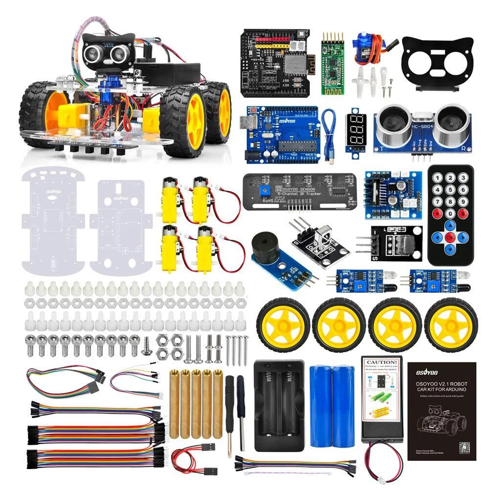 OSOYOO robotic car learning kit is designed for beginners to learn Arduino programming and get hands-on experience on robot design and assembly. We have developed a step-by-step tutorial which evolves from a simple car without any control to a multi-function robotic car controlled by mobile APP. Every lesson has detailed sample code with comments, circuit graph, assembly instruction and video. Even if you have no programming experience, you can follow the step-by-step instruction and gradually become a master. Our robotic car is 100% open source. If you are an intermediate player and have time to read our code comments, you can easily customize this robotic car to make your own project for science fair, college home work or even commercial applications. START AND CREATE - OSOYOO V2.1 robot car for Arduino is a perfect combination of challenge and excitement, learning and fun. Our kit is compatible with basic starter and robot car kit for Arduino. COMPLETE SETS OF MODULES – Bundle Includes basic board for Arduino, OSOYOO Uart WIFI shiled V1.3 for UNO, HC Bluetooth, line tracking module, ultrasonic sensor, OSOYOO Model X motor drive board (an improved L298N module) , micro servo motor, IR receiver, IR Remote, IR obstacle sensor, Battery and charger are also included, almost everything needed to run the car in the package. MULTIPLE WORKING MODES – supports multiple working modes: auto-go, follow, line tracking, IR remote control, Ultrasonic avoidance, Wifi IOT control, Bluetooth control. HANDY APP CONTROL - Connect your smartphone to the car via Bluetooth and Wifi, and both APP is compatible with Android and IOS phone. DETAILED TUTORIAL – This package include a user’s guide and safety instructions. You can get all online instructions from the guide to learn how to assemble the robot car step-by-step with all additional contents included.