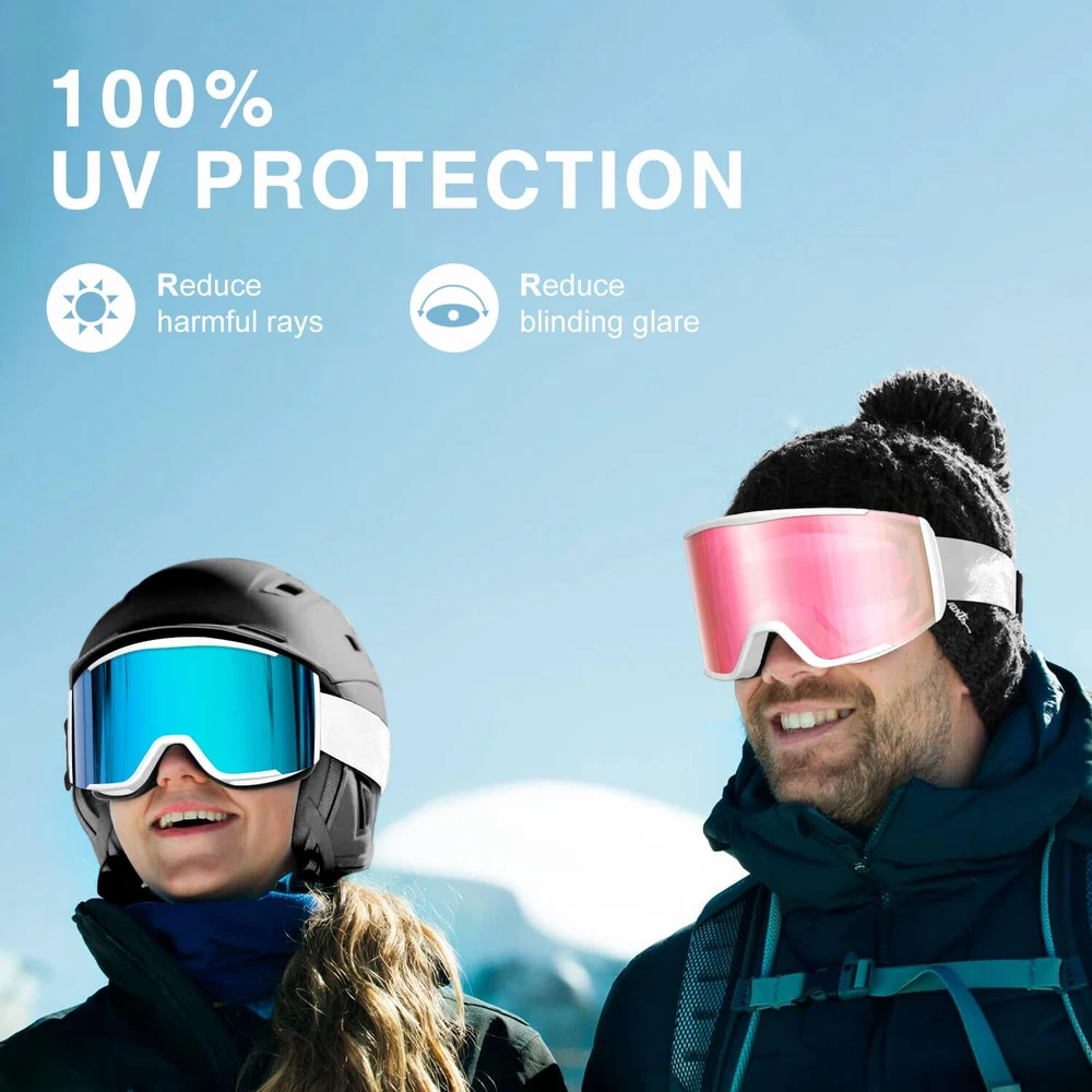 【Double Anti-Fog】-Anti-fog function is the most important function of a ski goggle; ski goggle adopts double-layer lens technology and inner and outer anti-fog coating lens, which provides you with a high-definition and fog-free vision in skiing, and prevents condensation fog 【Helmet Compatibility】-The adjustable elastic headband is helmet compatible and the headband is designed with three non-slip adhesive strips to keep the skiing goggles and ski helmet in place and prevent them from falling off 【Complete Eye Protection】-Snow goggles are made with double-layer PC lenses to ensure sturdiness while blocking 100% of harmful UVA/UVB rays, so you don't have to worry about the effects of harmful sunlight and impaired visibility 【180-Degree Panoramic Design, Smooth Ventilation】-The column lens design effectively reduces spherical aberration and chromatic aberration to ensure a wide field of vision; the air holes at the bottom and top of the snowboard goggles can enhance airflow and accelerate internal air circulation to prevent fogging Snowboarding goggles are suitable for a variety of winter sports, such as skiing, snowboarding, snowboarding, snowmobiling and other sports; they are also a perfect gift for family members & kid or men women & youth