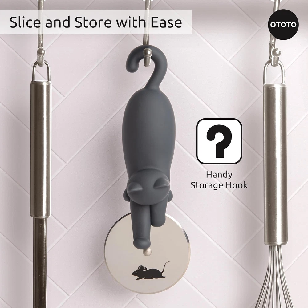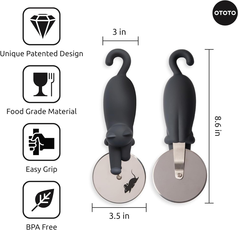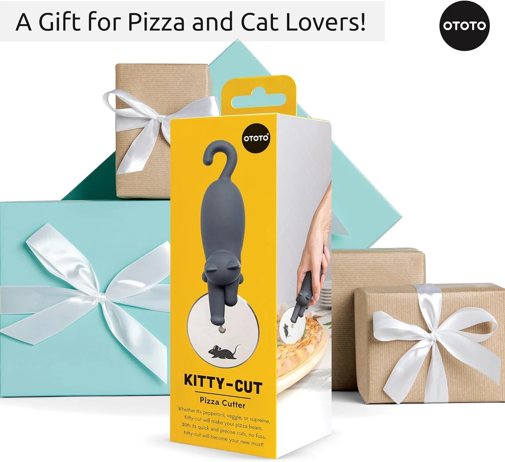 OTOTO Kitty Cut Pizza Cutter Wheel - Pizza Cutters Stainless Steel, Funny Kitchen Gadgets and Kitchen Gifts, Cat Gift for Women Cat Lovers Product Details Brand: OTOTO Product Dimensions: 8.6"L x 3.5"W Item Weight: 0.12 Kilograms Blade Material: Stainless Steel Handle Material: Plastic Manufacturer: OTOTO Item Weight: 4.2 ounces Country of Origin: China Item model number: OT020 Meet Kitty Cut, the Pizza Cutter - Designed by award winning OTOTO, Kitty Cut the slicer adds a playful touch to pizza night! This cute kitchen gadget makes slicing pizzas a breeze, so you can enjoy your favorite pie without the fuss. Achieve the Purr-fect Slice - With an ergonomic handle and a sharp stainless steel blade, this cute pizza cutter wheel ensures a comfortable grip and precise slices, making it the 'purr-fect' pizza slicer to your pizza tools and accessories. Gift for Pizza & Cat Lovers - Looking for funny kitchen gadgets? Our cat-like pizza wheel is an ideal choice for pizza lovers and cat enthusiasts. It'll bring a smile to their faces and make their pizza nights even more 'meow-tastic.' Effortless Cleanup & Storage - The handy storage hook keeps Kitty Cut within reach whenever you need it. Just remember, these are hand wash only funny gadgets, ensuring it's in tip-top shape for your next pizza party! Sprinkle of Fun - Ever heard of the one where they lived happily ever after? That's the story with OTOTO. Our cute products like our funny pizza cutter, always feature a quirky twist to stop the bore of doing chores!