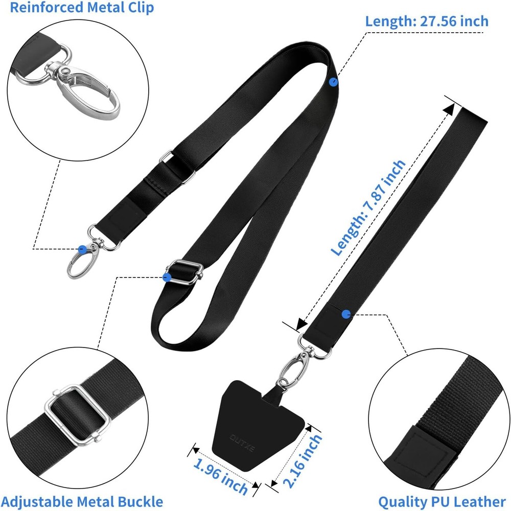 OUTXE Phone Lanyard - 4× Pads, 1× Adjustable Neck Strap, Wrist #1-black Product Details Package Dimensions: 8.46 x 4.6 x 0.59 inches Item Weight: 1.76 ounces Item model number: ACCLN4-B Other display features: Wireless Color: #1-black Department: womens Manufacturer: OUTXE 【What You Get】4× durable pads, 1x wrist strap, and 1x neck lanyard that can be adjusted to crossbody. Enough quantity to use, share, and replace them in the way you like 【Fits All Mobile Phones】Universal Phone Lanyard for all smartphones with a full-coverage case from 4 to 6.7 inches securely. Note: Not support half coverage phone case 【 Not Block Charging Port 】Ultra-thin tear-proof pads support corded and wireless charging without being removed. Completely unobstructive for the buttons and screen of the phone 【 Easy to install 】No tools required, pass the pad through charging hole of fully covered phone case, then insert your phone and connect to the lanyard 【 Comfortable and Durable 】Made of soft skin-friendly Nylon and tear-resistant PU leather with a rust-proof metal hook to attach your keys, ID badges, thread wallet and other accessories