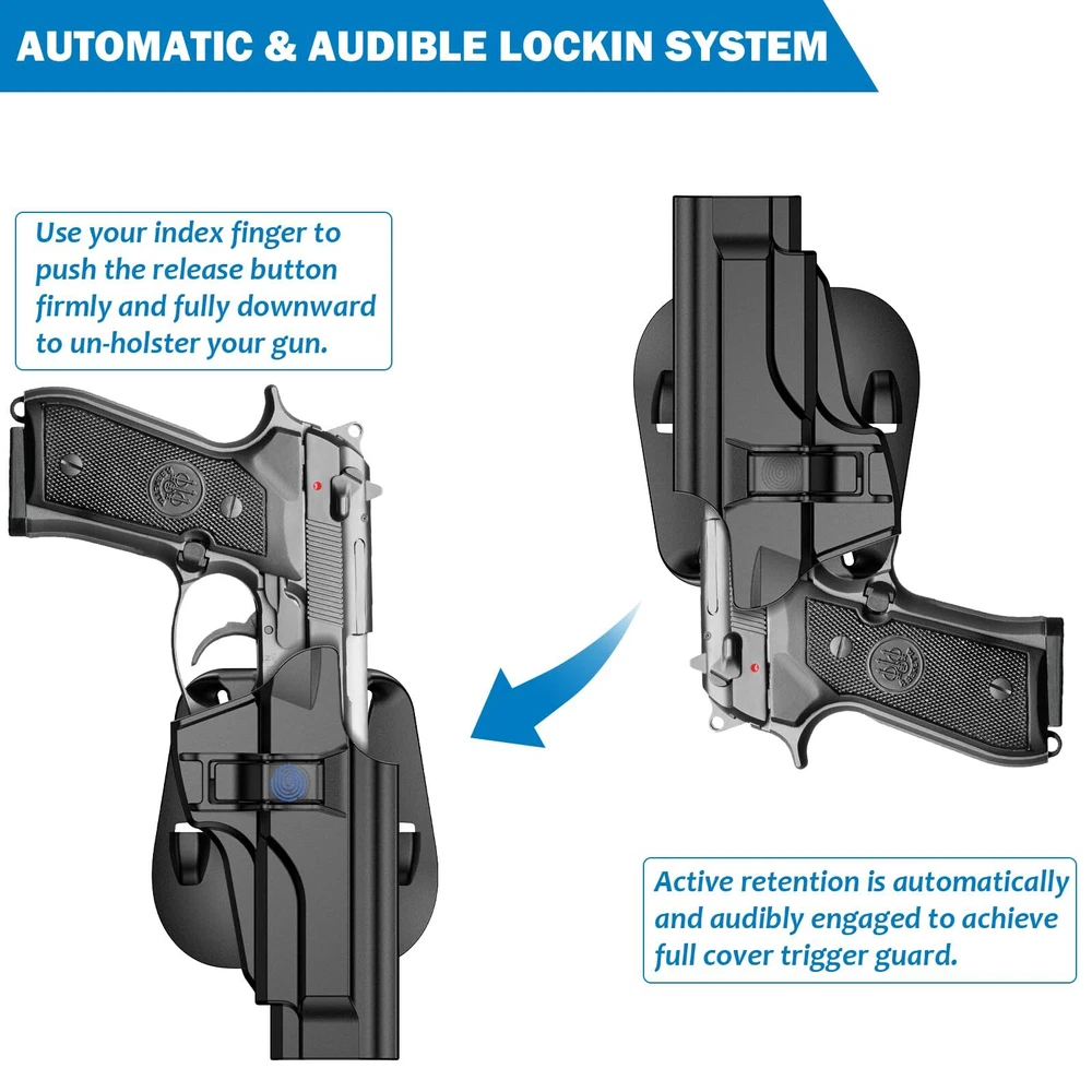 【HOLSTER FIT GUIDE】 Outside the Waistband Holster Custom Molded Fit for Beretta 92 FS 92FS Inox /Compact 92S Full Size/Compact/Centurion M9 M9_22 92G ELITE LTT /Centurion /Compact Taurus PT92 pistol. Notice: This tactical holster can't fit with pistols with laser or sight. (Check the second chart details please) 【LEVEL Ⅱ RETENTION】 Auto locking system achieves an audible click when you holster the weapon, which can secure your weapon inside this OWB holster to ensure ultimate safety. It is designed to be quickly drawn and re-holstered for easier access by pressing release button with your forefinger whenever needed. 【60° ADJUSTABLE PADDLE CANT】 Ergonomically-designed thinner paddle holsters is easily clipped anywhere on your belt or inside the pants waistline, it is convenient to conceal your weapon under your clothing. Simple set cant from 0-60 degrees to fit a comfortable position with Allen key, you won’t have to worry about the firearm digging into your leg the way belt loop holsters can. Compatible duty belt width up to 2 inch. 【MILITARY-GRADE MATERIAL & EXCELLENT DESIGN】 This polymer holster is made of high standard polymer that is waterproof and durable, almost no maintenance required, adapt to every bad environments. The Excellent design of this paddle holster features a wide concave-shaped piece of plastic which works as the backing of the holster, which keeps the firearm away from the hip and ensures a firm grip and the drawing movement is quick and hurdle-free. 【APPLY FOR EVERY PLACES】 Wearing a belt is not a compulsion for using a paddle holster, you can simply tuck it over your waistband, so it is widely used by duty holsters, uniformed law enforcement and peace officers, security personnel, military personnel, private persons and shooting sports holsters all over the world. If you are looking for a gun holster, this is good choice for you.