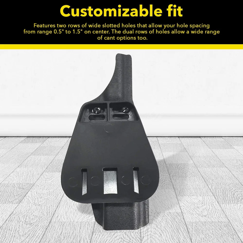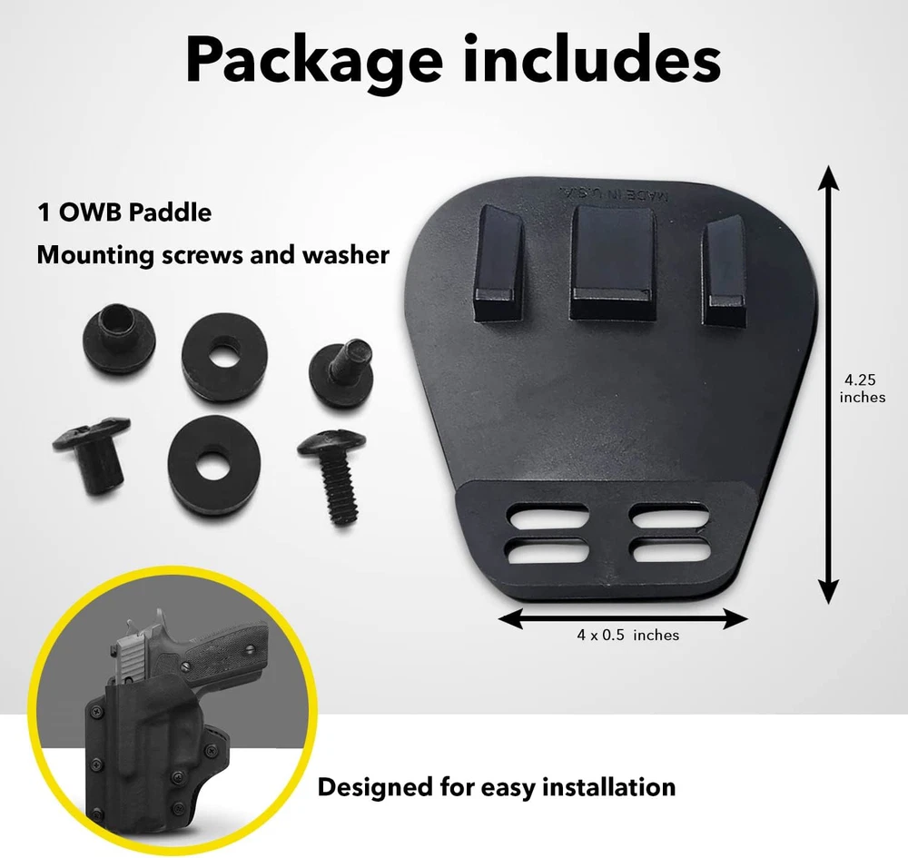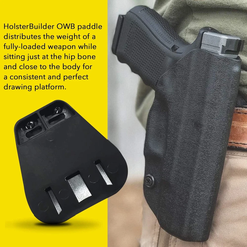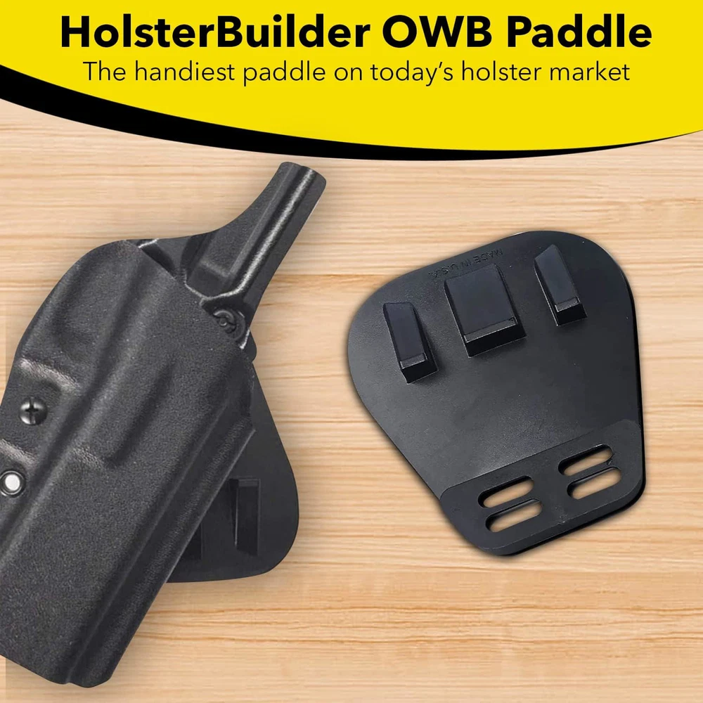 Comfortable design: Our ergonomically designed paddle holster distributes the weight of a fully-loaded carry while sitting just at the hip bone and close to the body providing a consistent and perfect drawing platform. Quality construction: Holster paddles are built with a durable polymer material and allow users to rearrange screws quickly and efficiently without the use of tools. The holster locking fork is designed to mount directly to the back of the holster to keep your carry safe. Customizable fit: Our OWB paddle features two rows of wide slotted holes that allow your hole spacing from range 0.5" to 1.5" on center. The dual rows of slotted holes allow you a wide range of options to set the size of the paddle to plus or minus and adjust the ability to rotate up to 30 degrees. Easy to use: Complete installation takes less than 5 minutes. One side of the OWB holster paddle is attached to the holster body and the other is attached to the back-piece or holster attachment device. You can mount these receiver plates anywhere you wish to securely keep your carry safe. Veteran-owned and manufactured in the US: Our holster paddle is constructed with durable material in the U.S with painstaking attention paid to every last detail so you can be assured that your paddle will be perfectly crafted and durable. Similar in size and shape to the other popular paddles out there, our OWB paddle holsters save you time and effort by already including holes. Our holster paddle attachment features two rows of wide slotted holes that allow your hole spacing to range from 0.5??? to 1.5??? on center. The dual rows of slotted holes allow you a wide range of cant options too. Straight drop / zero cants. Plus or minus adjust ability clear out to 30 degrees! Our paddles for holsters are as much about the features that you can see, like the ones that you can't. Everything from our unique design, to the thread lock on each screw, to our stealth belt clip, to the specific shape of our holsters is no accident. This deliberate attention to detail is what makes the difference between a holster paddle that collects dust in a drawer and a HolsterBuilder OWB paddle attachment that you can confidently use & comfortably wear every day Features: -Quality full grain genuine leather strap -Robust locking system -Pre-drilled holes -Made from durable polymer material -Ambidextrous -Ergonomic design Specifications: -Product dimensions : 4 x 0.5 x 4.25 inches -Product weight: 5.93 Ounces -Solid screw hardware Built-in the USA Package Contains: -1 OWB Paddle -Mounting screws and washers About Us: At holsterbuilder our mission is to create a one-stop shop that provides you, the holster builder, with everything you need to form and create your custom products.