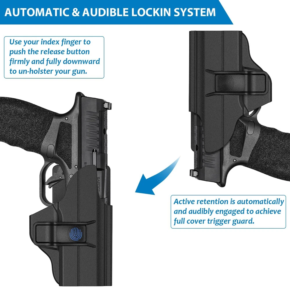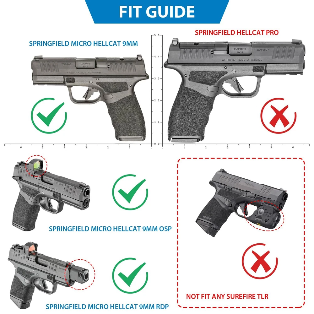 【HOLSTER FIT GUIDE】This springfield hellcat holster fit for Springfield Armory Hellcat 3'' Micro-Compact 9mm . 9mm springfield hellcat holster with Optic,hellcat OSP/RDP holster,Notice: This tactical holster can't fit with Springfield Hellcat modified with laser or sight. (Not fit hellcat ) 【LEVEL Ⅱ RETENTION】This hellcat micro holster right hand,Auto locking system achieves an audible click when you holster the , which can secure your inside this OWB holster to ensure ultimate safety. It is designed to be quickly drawn and re-holstered for easier access by pressing release button with your forefinger whenever needed. 【60° ADJUSTABLE OPEN-TYPE BELT CLIP】Open type belt clip allows step open step close (without regulating screw), not like other ordinary belt loop holster on the Market. This belt holster can slid over the belt, they retain their position and stay firm. Simple set cant from 0-60 degrees to fit a comfortable position with Allen key, you won’t have to worry about the firearm digging into your leg the way belt loop holsters can. duty belt width up to 2 inch. 【MILITARY-MATERIAL & EXCELLENT DESIGN】This polymer holster is made of high standard polymer that is waterproof and durable, almost no maintenance required, adapt to every bad environments. The Excellent design of this belt holsterworks as the backing of the holster, which keeps the firearm away from the hip and ensures a firm grip and the drawing movement is quick and hurdle-free. 【APPLY FOR EVERY PLACES】 It is widely used by duty holsters, uniformed law enforcement and peace officers, personnel, military personnel, private persons and shooting sports holsters all over the world. If you are looking for a holster, this is good choice for you.