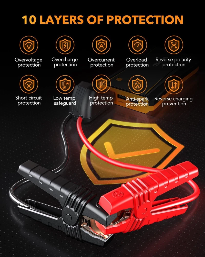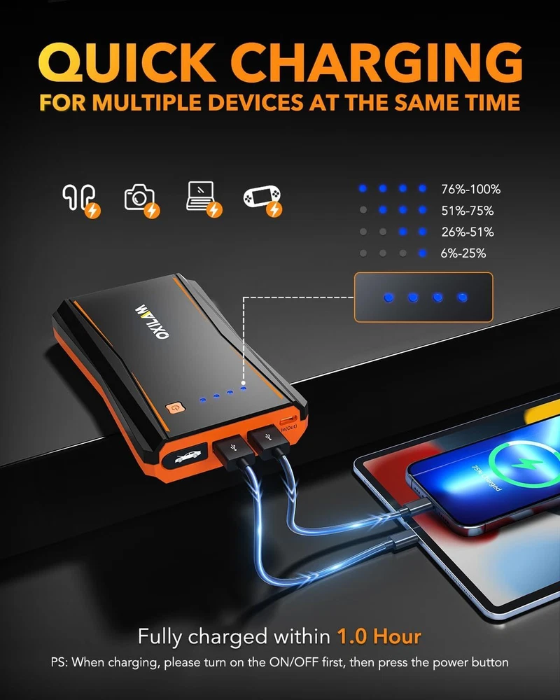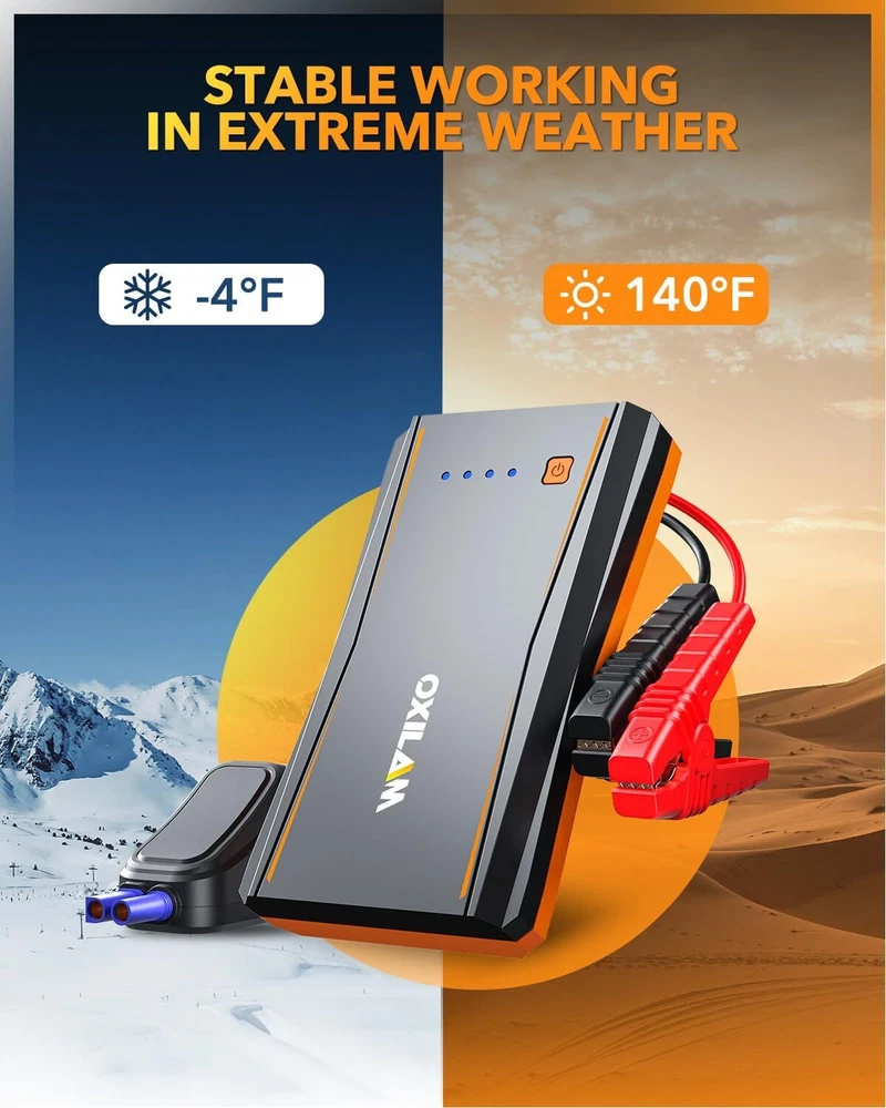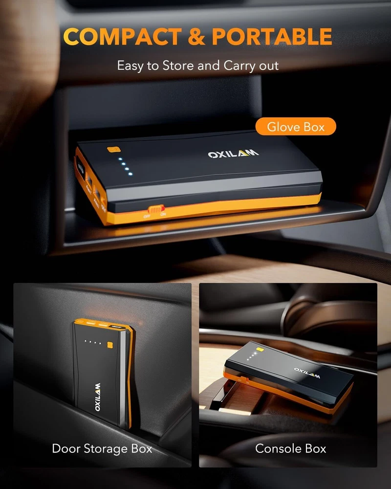 OXILAM Jump Starter, 4000A Peak Car Battery Jumper Starter Portable, Orange Product Details Brand: OXILAM Product Dimensions: 7.91"D x 4.3"W x 3.07"H Item Weight: 0.68 Pounds Amperage: 4000 Amps Peak Output Current: 4000 Amps Manufacturer: Guangdong Boltpower Energy Co., Ltd Model: Car Battery Jump Starter Item Weight: 10.9 ounces Item model number: Y1 Batteries: 1 Lithium Ion batteries required. (included) Manufacturer Part Number: OXILAM-DY-Y1 Brand: OXILAM Product Dimensions: 7.91"D x 4.3"W x 3.07"H Item Weight: 10.88 ounces Amperage: 4000 Amps Peak Output Current: 4000 Amps Battery Cell CompositionVoltage: Lithium Ion12 Volts Vehicle Service TypeBattery Capacity: Passenger Car, Van, Motorcycle, ATV, RV, UTV, Truck, Watercraft, TractorPassenger Car, Van, Motorcycle, ATV, RV, UTV, Truck, Watercraft, TractorPassenger Car, Van, Motorcycle, ATV, RV, UTV, Truck, Watercraft, Tractor See more 12800 Milliamp Hours 【Powerful Car Jump Starter】: OXILAM jump box is equipped with the QDSP technology, which increases the starting capacity by 3 times. The 4000A peak current can instantly start your car dead battery (up to 10L gas / 8L diesel engines). OXILAM jump pack can start up to 40 times on a single charge. It also supports other 12V vehicles like lawn mowers, motorcycles, cars, pickups, trucks, yachts. 【Compact and Portable Design】: OXILAM car battery jump starter is smaller and lighter than traditional bulky jump starters, making it easy to store anywhere in the vehicle and use in an emergency. It can also be easily taken out and used as a power bank for charging. 【More than A Jump starter】: OXILAM jump box for car battery is not only a portable car jump starter but also a multi-functional power bank, providing fast charging that fully charging a mobile phone in 1 hour. It also comes with 2 USB-A ports, which can charge 2 devices at the same time, making it an excellent car must have. 【600 Lumens Super Bright Flashlight】: OXILAM jumper starter provide a 600 lumen super bright flashlight with 3 modes (flashlight/SOS/strobe), which can be used in different emergency situations and for a Long-lasting illumination. 【3 Steps to Go, Always On The Road】: Plug the jumper cables into the OXILAM jump starter and connect the clamps to the car battery, then start the car. And don't forget to pack up the OXILAM car jump starter to keep you always on the road. 【Tips】: Please make sure that the power is greater than 50% before starting the car. In addition, if it is not used for a long time, it is recommended to charge the car starting power supply every 2-3 months to keep the car starting power supply in a healthy state.