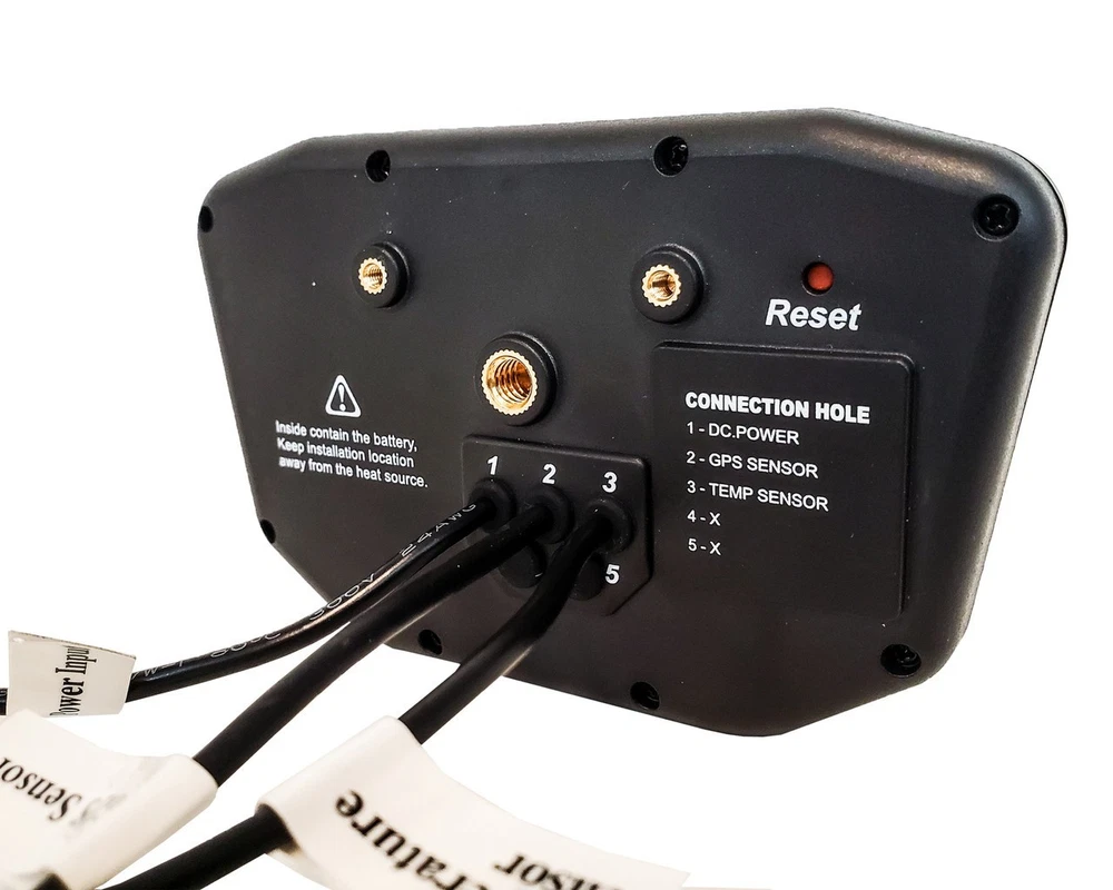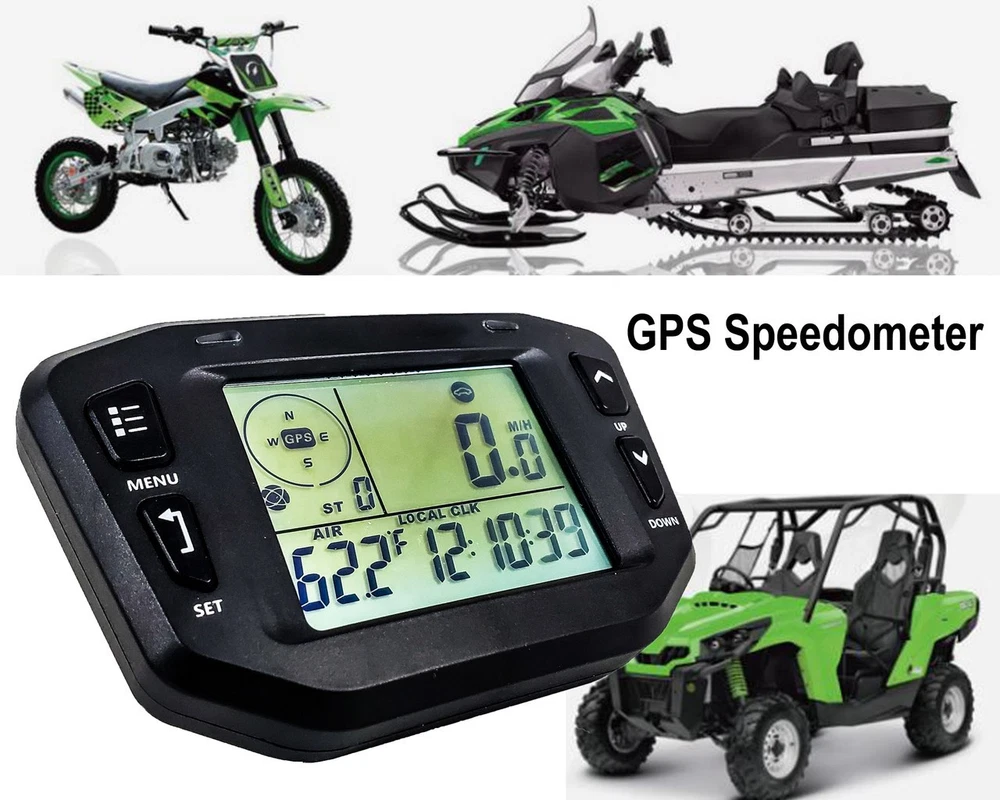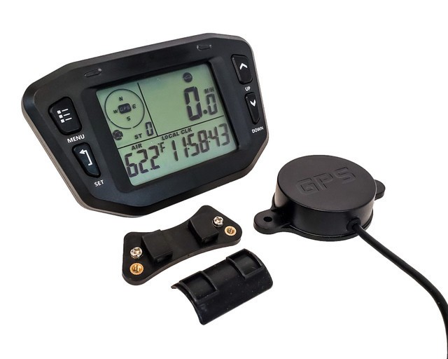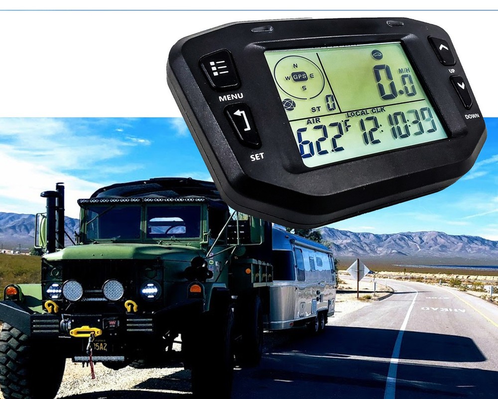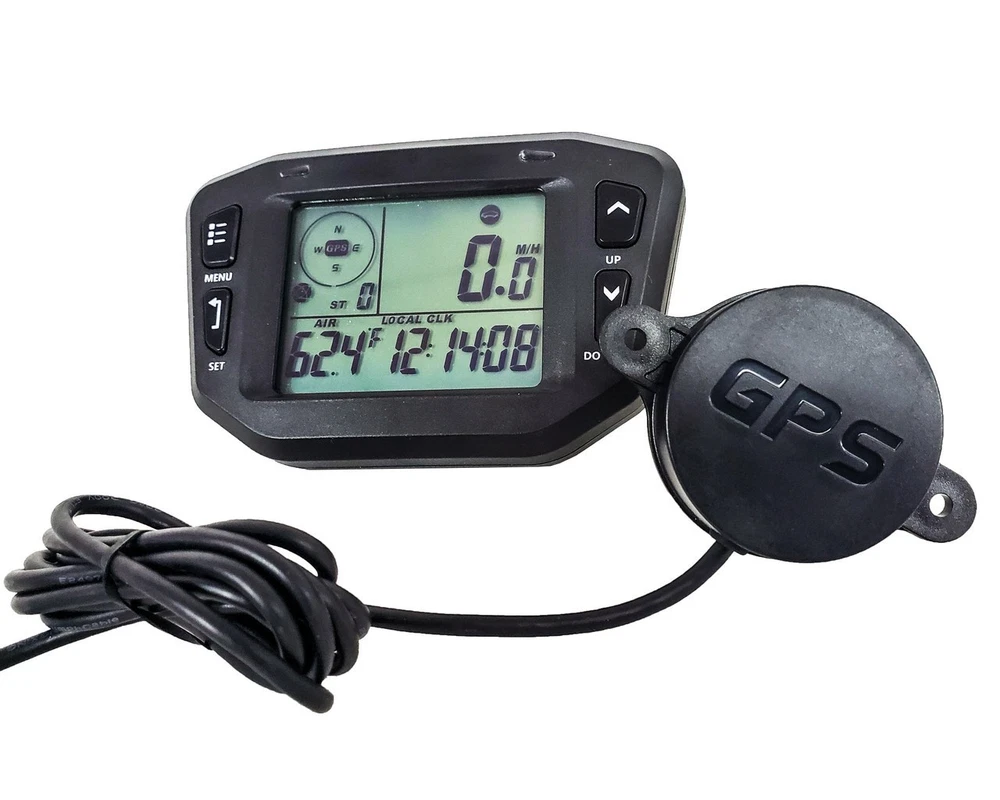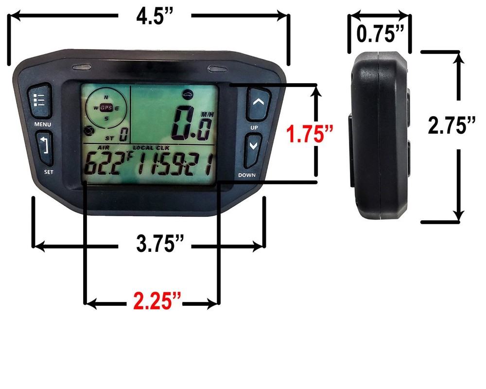 Multi-Function Display: Current, average & max speed Total mileage (ODO) & trip distance (resettable) Engine temperature & ambient temperature Battery voltage, clock & accumulated run time (ART) Maintenance interval reminders 3 Main Display Modes: Direction, satellite count, speed, ambient temperature, clock Direction, speed, voltage, ODO (total mileage) Direction, speed, run time, engine temperature Specifications: Size: 4.5" x 2.75" x 0.75" (11.43 x 6.98 x 1.90 cm) LCD screen with white backlight Built-in rechargeable 3.7V-500mAh lithium battery External power: DC 8–36V Waterproof & shockproof (IP67 rated) Units: KM/H, MPH, Knot Speed range: 0–399 KM/H (0–247 MPH) Temperature range: -20°C to 250°C (-4°F to 482°F)