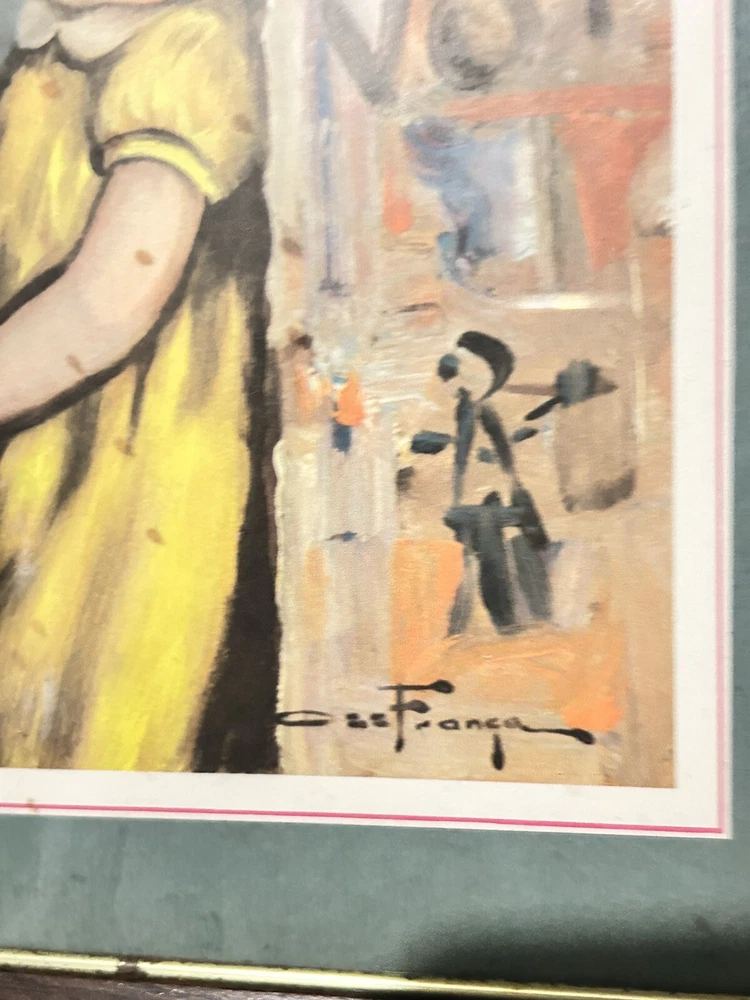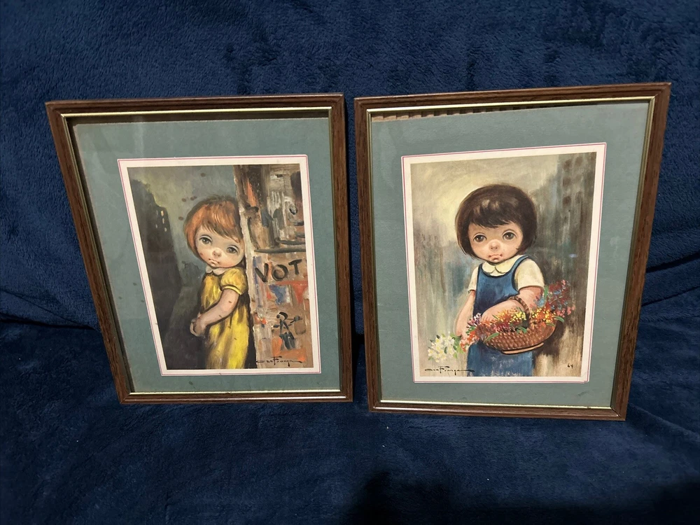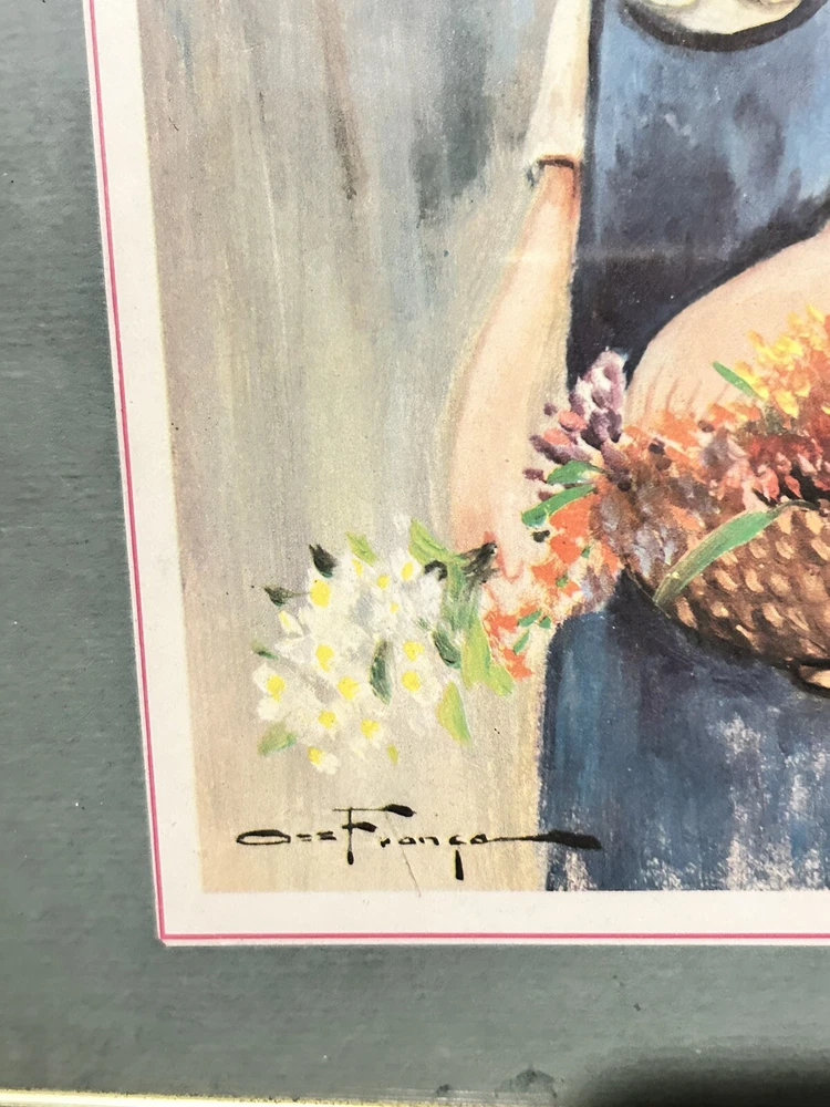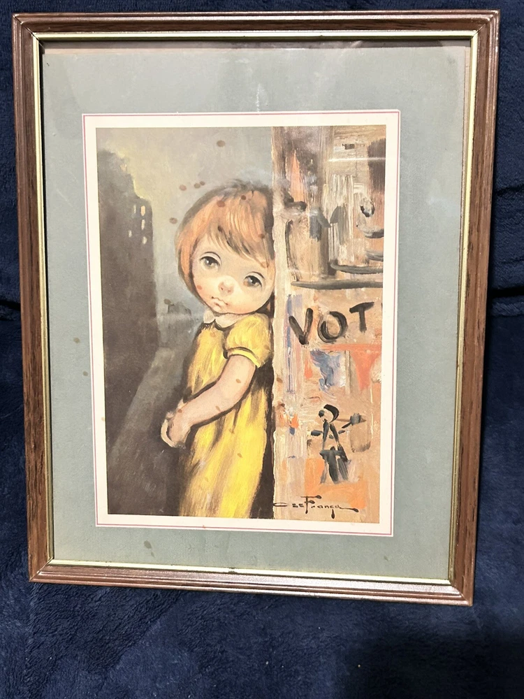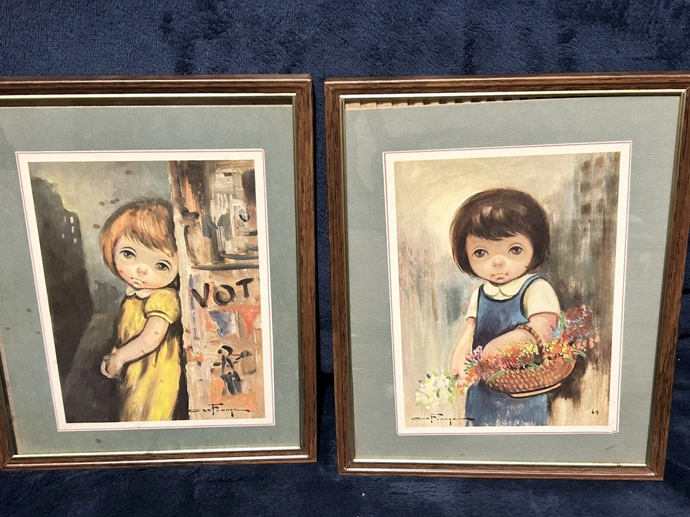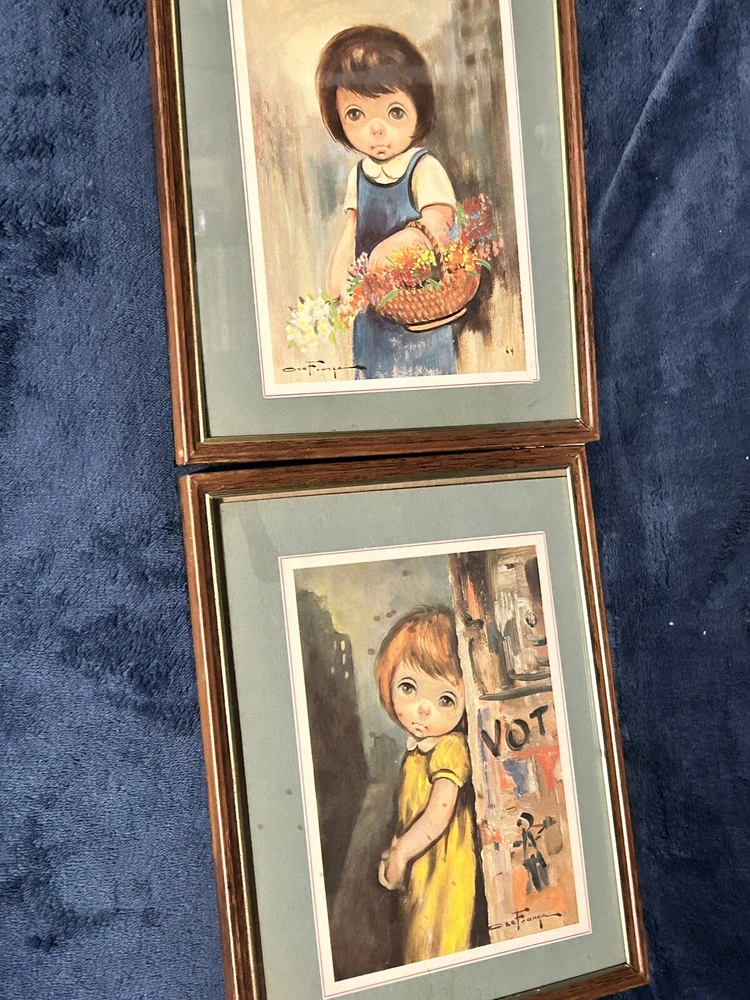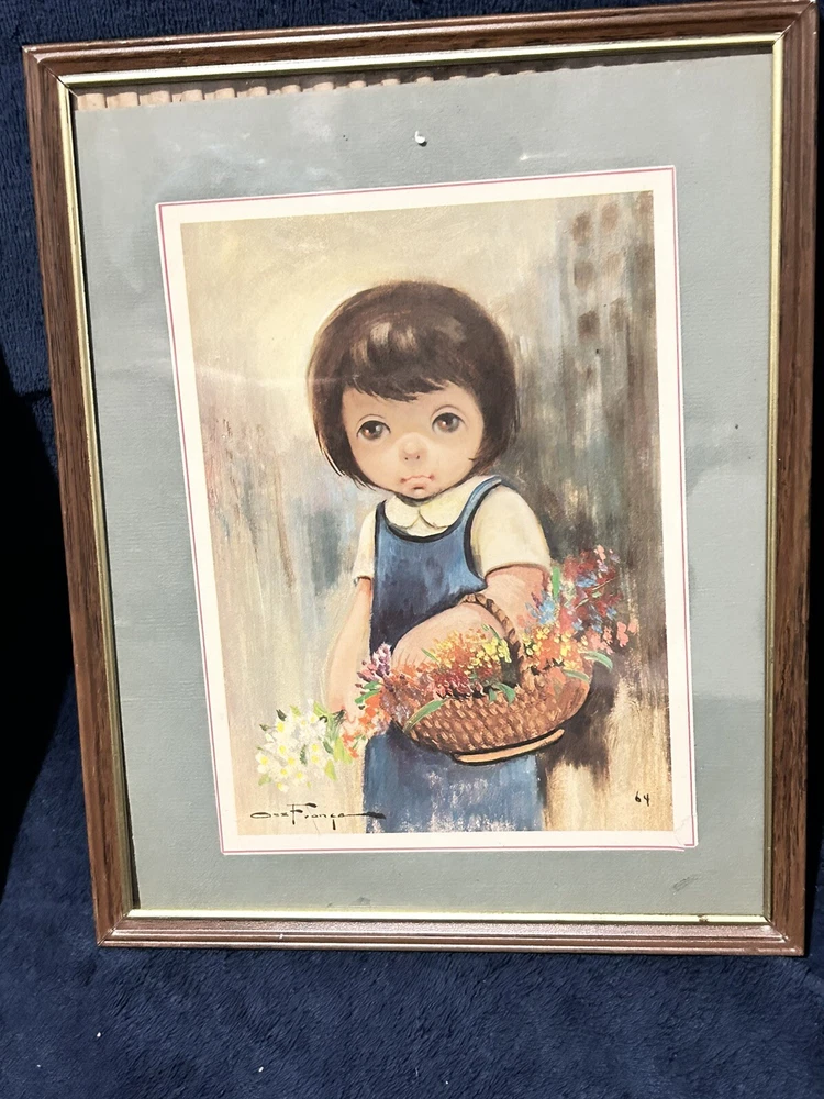These two pictures by Oz Franca are so cute. They are signed by him. The frame is 11 x 8. The pictures inside the frame are 5 1/ 2 x 7 1/2. They are titled guys sad eyes dated 1964. They are in the original frames .