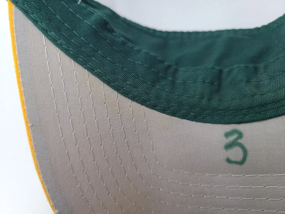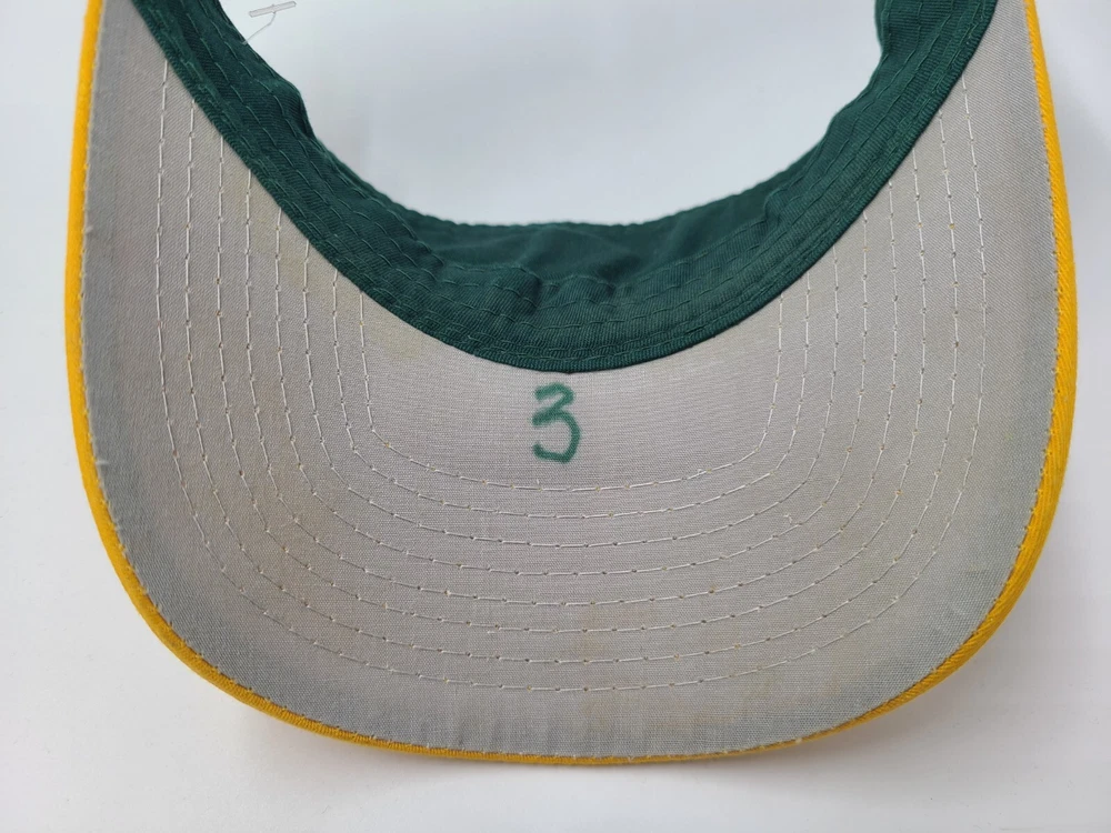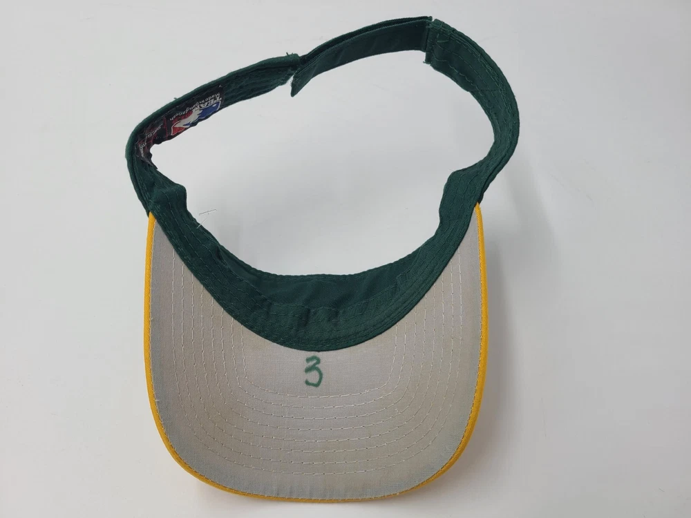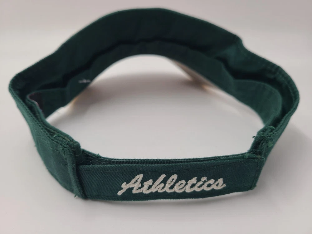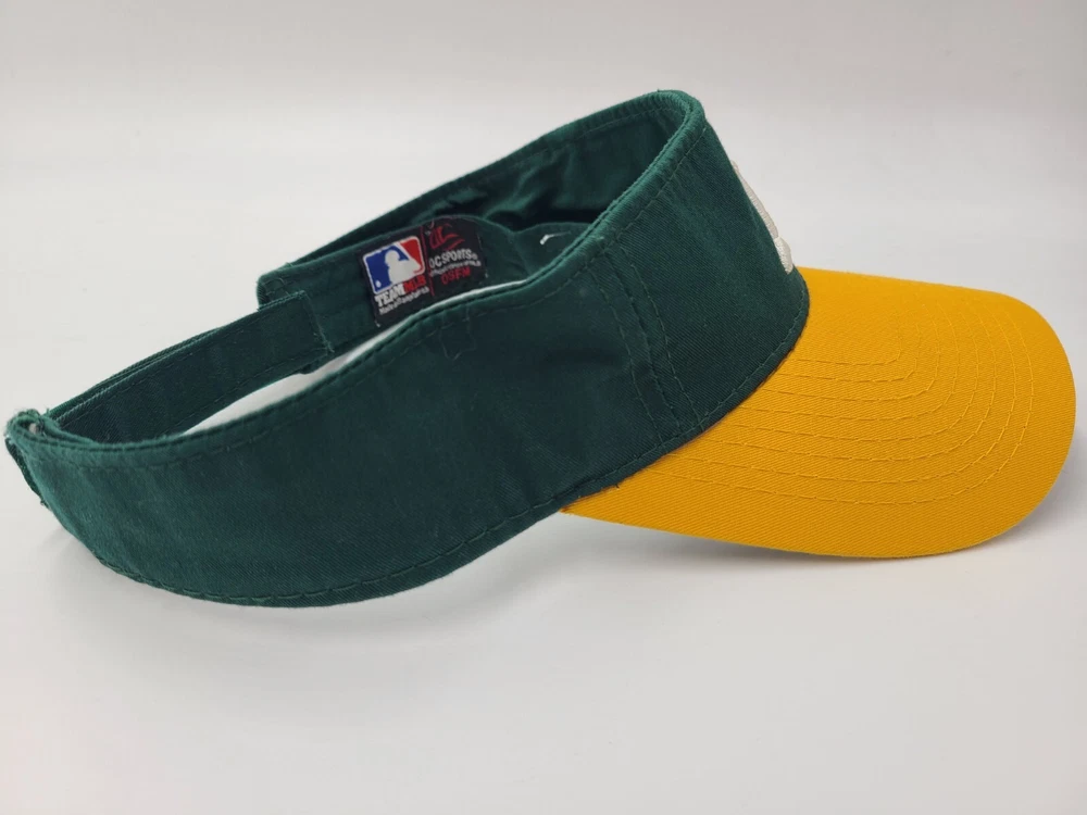 Has some writing and stains underneath the brim as seen in photos. Oakland Athletics A's OC Sports Sun Visor Adjustable Hat Cap MLB Green Yellow. EACH ADDITIONAL HAT PURCHASED IS ONLY $1 ADDED SHIPPING!