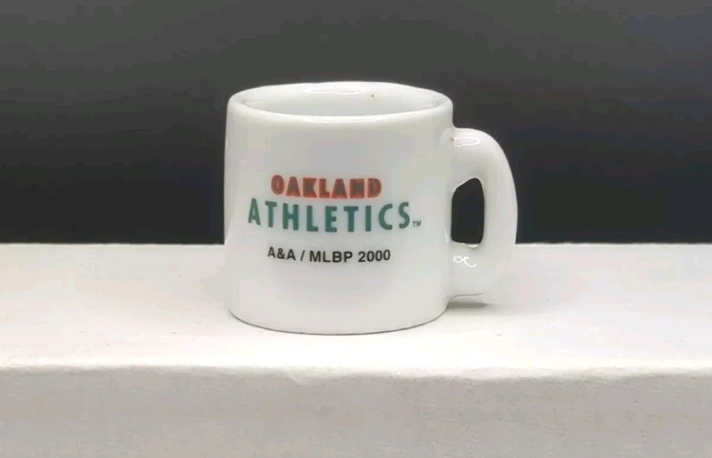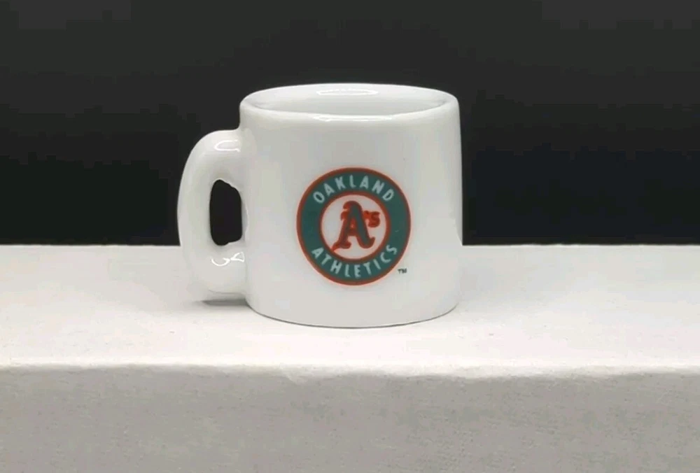 This collectible miniature ceramic mug is a must-have for any Oakland Athletics fan. Featuring the iconic team logo and colors, this mug is the perfect addition to any sports memorabilia collection. Measuring at 1.25 inches in height, this mug is perfect for display on a shelf or desk. Made in the year 2000, this mug is a great way to show off your love for the Oakland Athletics. Whether you're a longtime fan or just getting started, this mug is a great way to show your support for the team. So why wait? Add this collectible mug to your collection today!