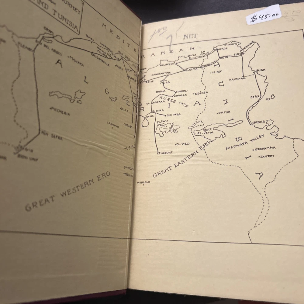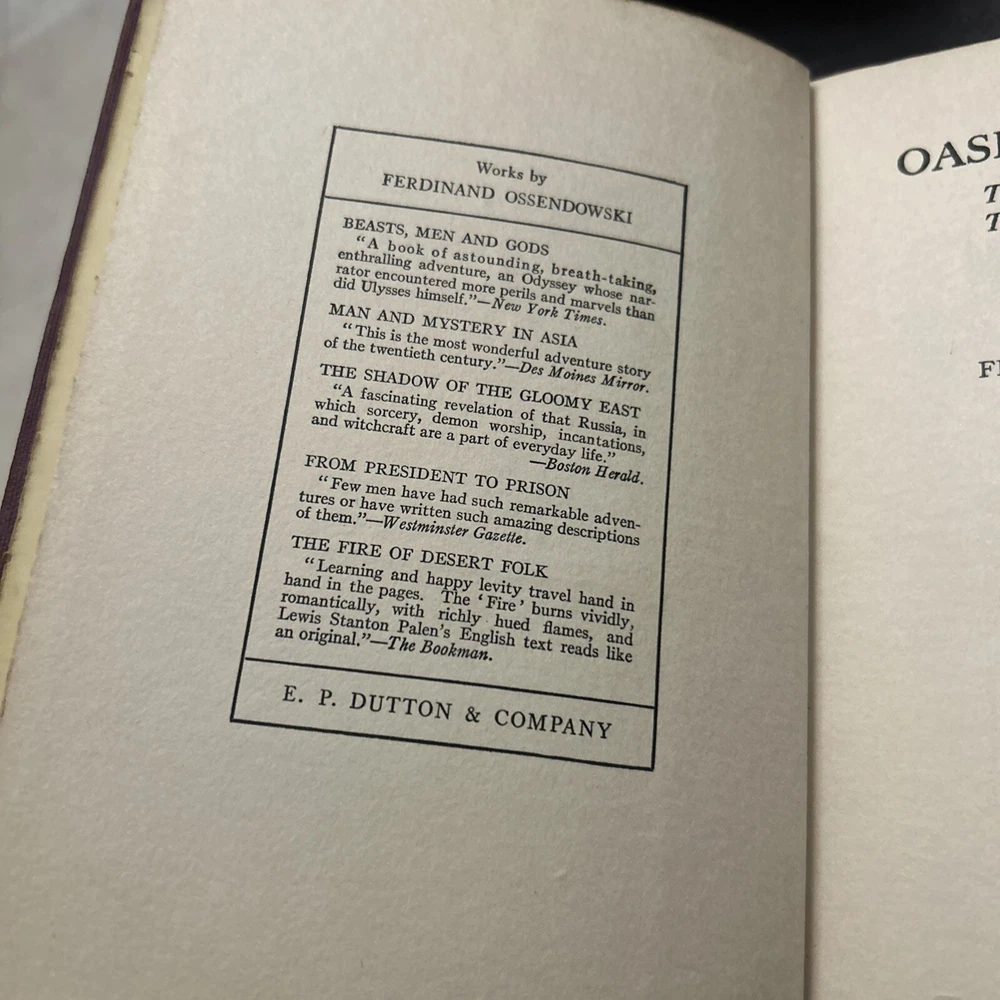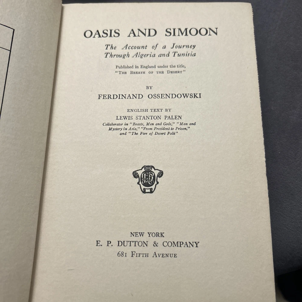 The product is a vintage first edition book titled "Oasis and Simoon: The Journey Through Algeria & Tunisia" written by Ferdinand Ossendowski. Published in 1927 by E.P. Dutton, the book explores exploration and travel in Algeria and Tunisia. It is a hardcover book in English, with no indication of being signed or personalized. The book provides a unique insight into the regions of Algeria and Tunisia during that time period, making it a valuable collectible for book enthusiasts and historians interested in early 20th-century exploration literature. Condition is good with minor stains on cover and minimal wear on the corners. Good looking book. Spine is strong and inside pages clean. Carrington collection. Thanks for looking!