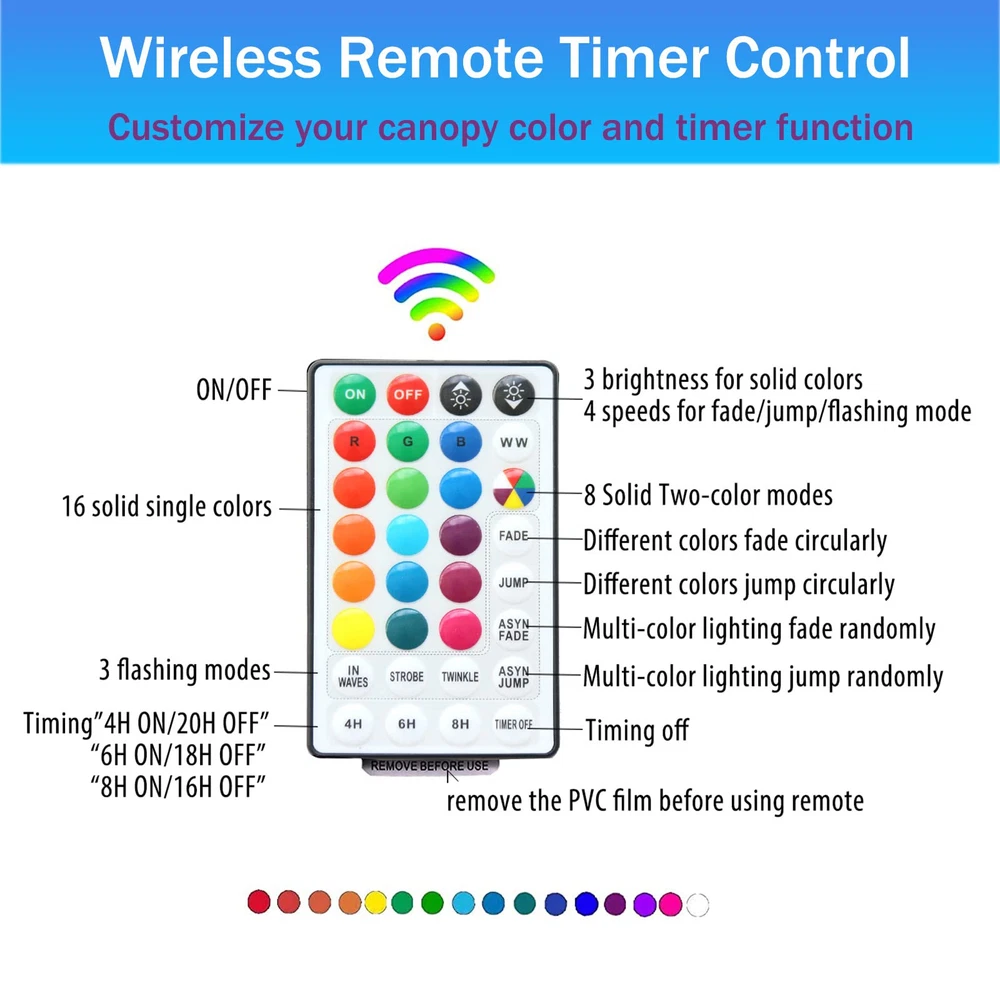This princess bed Canopy is an new design. There are 100 LED star lights with 18 colors options and multicolor. Pink for princess, blue for Brave knight, purple for queen, red/blue/white lights for 4th July, multi-color for Christmas decor etc This gift packaging starry bed canopy will surprise your girls and boys. There are 100 shining stars accompany your girls to sleep, which illuminates the bedroom with floating stars around the bed The canopy string lights can be controlled with remote. There are 18 different color options and 7 multicolor(twinkling and flashing). It also has 3 timer (4 hours on/20 hours off, 6 hours on/18 hours off, 8 hours on/16 hours off) The round canopy with different light colors bring you sweet dream in summer night It’s easy to set up. The canopy is applicable to various types of bed,such as twin bed,full bed,king bed,queen bed. Set it up either in bedroom or anywhere else you like