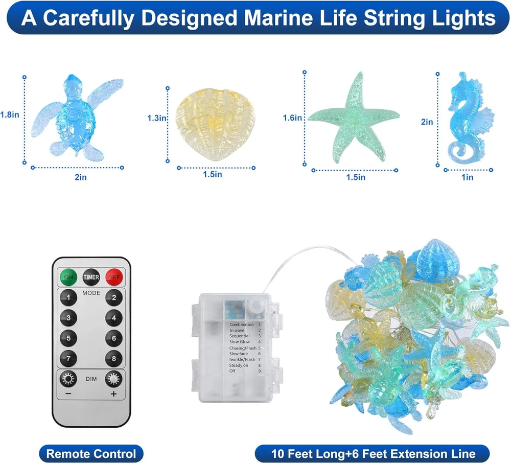 Store New Arrivals Add to Favorite View Feedback Contact Ocean Themed Decorative Lights String of Marine Life Fairy String Lights Coastal Decor 10Ft 30 Leds Battery Operated with Remote Control for Beach Bedroom Decoration Description Item model number SEABA-2023-HXT Light Source Type LED Style Sealife Power Source Battery Powered Number of Light Sources 30 Control Method Remote Theme Coastal Decor Style Number SEABA-2023-HXT Controller Type Remote Control Material Copper Additional Features Water Resistant Package Dimensions 5.28 x 3.46 x 2.6 inches; 7.05 ounces Indoor/Outdoor Usage Outdoor Material Type Copper Light Color Multicolor Water Resistance Level Water Resistant Connectivity Technology USB Special Feature Water Resistant Color Multicolor Wattage 5 watts Indoor Outdoor Usage Outdoor Included Components water resistant battery box Style Name Sealife 【Let The Beauty of Coral Reefs Creatures Light Up Your Life】Turtles, seahorses, starfish, and giant clam. Each icon is carefully designed with rich details. Each one is a work of art with our deepest love to ocean. 【Recognizable and Multiple Usage Scenarios】This copper wire lamp Star is 1.5x1 inch and it is fully light up. People can tell what they are from a distance. And the light it emits is more even and bright. They are the color of ocean water. This is mermaid will choose for her bedroom. Anyone who love ocean and beach will love this light. 【Better Quality and Safe Décor for Everyone】We use 0.45 diameter copper wire compares to 0.38 diameter of old version products, which make our item more durable. This wire will never go hot, it is also water resistant and can even work in very humid environment for a period (Keep USB and battery pack dry). Even if the lamp wire is damaged or broken, there will be no leakage. It can work safely near children and pets. 【Remote Control Provides Timer and Flicker Function】6 Hrs build-in timer provides automatic shut off (6 hours on and 18 hours off and 6 hours on again), plus brightness dimmer and flicker function, easy to use and save energy. The remote also offer different flicker mode and speed. You can easily control the lights even when it is out of your reach. 【Battery Operated】 The water resistant battery box allows you to use this product flexibly anywhere, we recommend using rechargeable batteries. Islands and beaches are always my first choice for vacation. The endless blue sea level always calms my heart. I also like free diving. Below sea level is like another world, which makes me forget all the unhappiness and boredom in life. Countless kinds of fish and turtles are like angels in this heavenly world. For some reason, my young son is also obsessed with the world. He loves all the creatures in the ocean for no reason. Therefore, it has become a great pleasure for me to observe the creatures in this world and bring their cutest forms to life. I started from small sea life and poured all my love for this blue world. I hope to share this feeling with you through my design. ABOUT US We offer the best prices around on high quality products. Our E-store includes media such as books, movies, music and games while offering electronics, toys, sporting apparel, clothing, tools, general home, garden items and more. SHIPPING We are always working hard to ensure your package arrives as soon as possible. Please understand that some factors like weather, high postal traffic, and the performance of shipping companies are outside of our control. We offer free shipping to the lower 48 states and ship within 2 business days of payment, usually sooner. We do not accept P.O. Boxes. Please provide a physical address. For shipping outside of the continental USA, we only use eBay's Global Shipping Program.The item is shipped to KY and then sent to the rest of the world. International customers are responsible for all duties and taxes. Continue to check out in order to calculate costs for shipping the item to your country. Messages regarding eBay's Global Shipping Program MUST be directed at eBay EXCLUSIVELY. RETURNS We offer a 30-Day Return Policy on items which you are not completely satisfied with. You have the option for a full-refund or an exchange of the item. No returns are available on items shipped outside of the USA. PAYMENT We accept PayPal. CONTACT US This page content is yet to come Please ad us to your favorite seller and visit again later Thank You CUSTOMER SATISFACTION We try our very best to make sure every customer is completely satisfied. If there's a problem, message us! We're happy to help. WE ACCEPT Copyright © 2021 AutoDS. | All Rights Reserved
