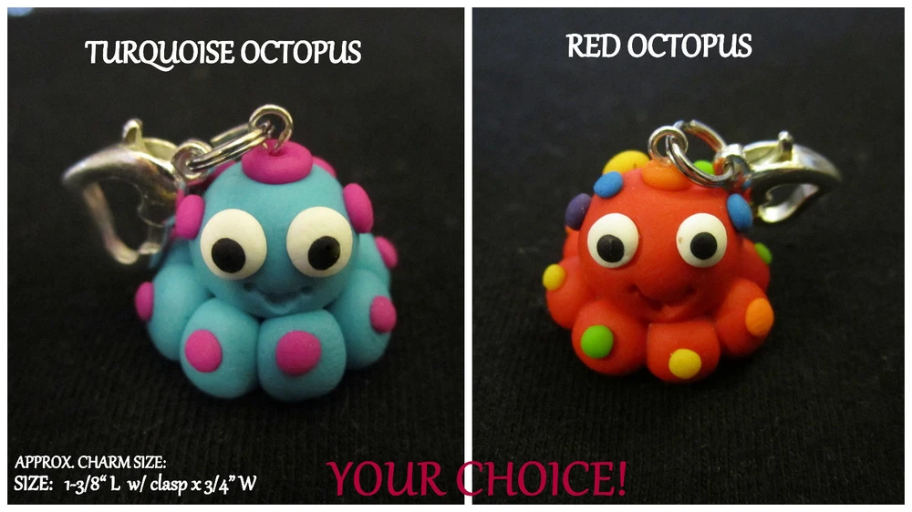 DETAILS **NOTE** Can be made into a cell phone charm with lanyard strap. If lanyard is requested, clasp will be removed. Please leave a note as to which color lanyard and tip you want. This listing is for a high quality, handmade Polymer Clay *Octopus* silver heart clasp charm...you choose color! The Octopus is handmade using polymer clay and measures approx. 5/8 inch high by approx. 3/4 inch wide. I attached the Octopus with a split jump ring to a silver heart clap. The total length of charm, including clasp, is approx. 1 3/8 inch. This is such an adorable charm that would make a great gift IF you can part with it!! FEEDBACK POLICY DUE TO A LARGE NUMBER OF BUYERS THAT NEVER RETURN FEEDBACK...I WILL ONLY GIVE IT AFTER THE BUYER DOES. WHEN THE BUYER RECEIVES THEIR ITEM AND LEAVES ME POSITIVE FEEDBACK, I PROMISE TO RETURN THE FEEDBACK TO THEM. SOMETIMES IT TAKES ME A FEW DAYS BUT I WILL GET IT TO YOU!! IF THE BUYER IS NOT HAPPY WITH SOMETHING I ASK THEM TO PLEASE CONTACT ME BEFORE LEAVING FEEDBACK AND GIVE ME THE FAIR CHANCE TO MAKE THINGS RIGHT!! I HOPE THAT MY BUYERS WILL UNDERSTAND AND I THANK YOU!! QUESTIONS Ask any question that you may have. If you are not happy with this item when you receive it.... please contact us instead of leaving a negative feedback. We are always willing to work anything out. Our customers come first and we want them to be happy. We always promise excellent customer service. A happy customer comes back!! We stand 100% behind our products and 100% guarantee all of them!! PAYMENT DETAILS USA and OUTSIDE USA: We accept PAYPAL payments. We do combine shipping on multiple items IF all items are paid within one payment. PLEASE WAIT FOR COMBINED SHIPPING INVOICE!! If you cannot pay with Paypal immediate, please let us know right away. This will keep us from bothering you with tons of invoices because we will know when to expect your payment!! Items MUST be paid for within 4 days. If not, We will relist the item and file a Non-Paying Bidder complaint. We truly hope that all transactions can be smooth and pleasant!! PLEASE understand that shipping is more than just stamps or postage. We do combine shipping on multiple items IF all items are paid within one payment. PLEASE WAIT FOR COMBINED SHIPPING INVOICE!! I try and ship items out within 24-48 hours after payment is received. I am very careful to package items extremely well which requires alot of high quality packing materials. Please also understand that no matter how fast I ship...the postal service is out of our control. Thank you! FOR RETURNS If you feel that you are not happy with an item, please CONTACT ME before leaving feedback. If the item is broken...I require return and will refund your payment in full when the item gets back to me. If you just dont want the item and choose a REFUND please understand that I cannot issue it until I have the item back in my home and it is in the EXACT shape as when it left. You will need to return the item at your own expense and refunds do not include shipping unless the item is broken or not as described. This is the only way that I can recover some of my costs that I would otherwise lose. THANK YOU!!