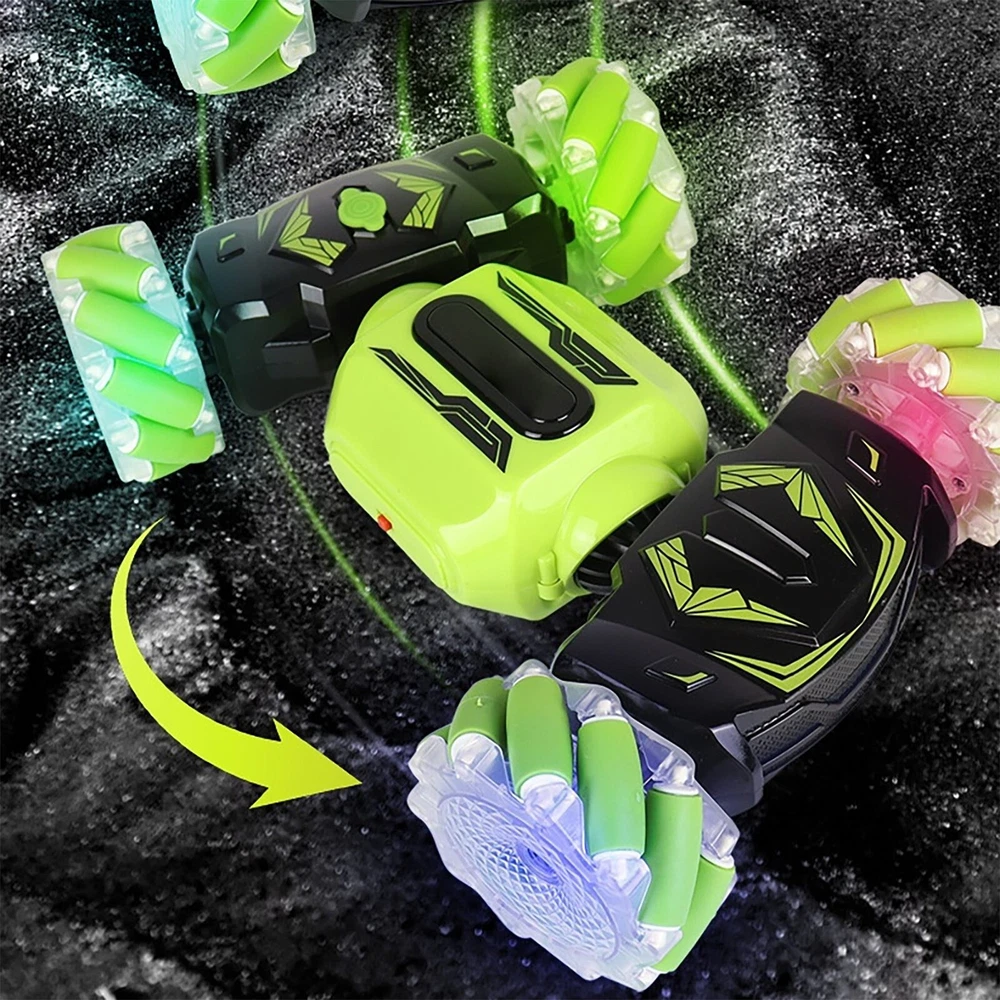 All-Terrain Remote Control Stunt Off-Road Toy Car, 2 Control Modes RC Car Features: Remote control, stunning lights and sounds, the tiger whistle for an adventure with real car sounds. 2.4 radio system: -interference ability, can race on the same track at the same . 100 metres distance, race. TWO MODES OF CONTROL: One mode is to wear the watch on your hand and control the stunt car by changing gestures such as forward, backward, left/right turn, flip driving and high body change. The other is to use the remote control to make the car drive the way you want. ONE- TRANSFORMATION FOR ON-ROAD AND OFF-ROAD: The transformable body makes the vehicle more flexible and suitable for all terrains. Drive on grass, sand, rocks, rough roads and other terrains. LATERAL DRIVING DESIGN: This drift car features a special double-sided rolling style that allows for quick lateral movement or in place.The 4-wheel drive and transformable body system makes the vehicle more agile and delivers great power torque to drive on any with ease.The 4-wheel drive and transformable body system makes the vehicle more agile and delivers great power torque to drive on any with ease. Product Description: All-Terrain Remote Control Stunt Off-Road Toy Car, 2 Control Modes RC Car Material: ABS Color: as the picture shows, (Due to the difference between different monitors, the picture may have slight color difference. please make sure you do not mind before ordering, Thank you!) Package weight: 700g Package size: 22.5x16.5x6.5cm,(Please allow 1-3mm error due to manual measurement. please make sure you do not mind before ordering.)
