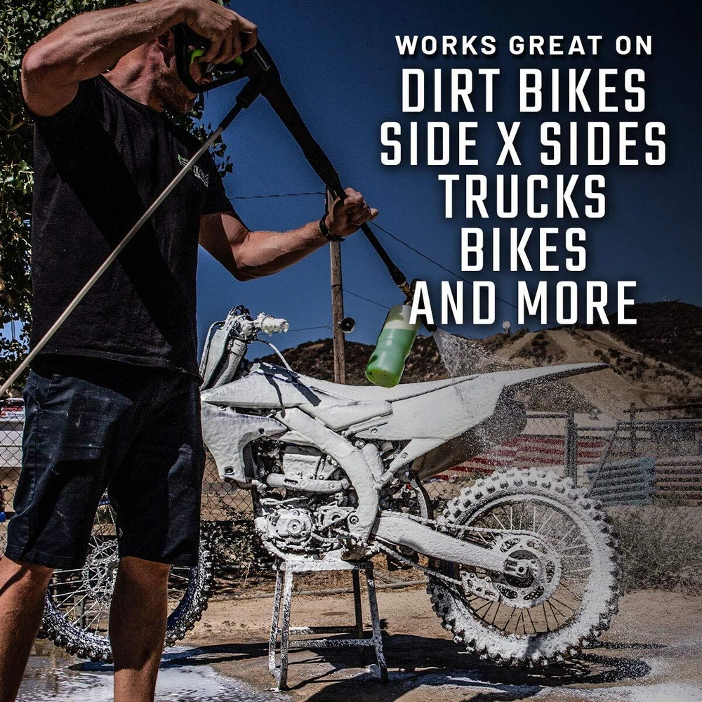 PREMIUM WASH SOLUTION WITH PROFESSIONAL RESULTS : offroad car care products are specially formulated with high-quality ingredients designed to offer users a faster, safer, and easier cleaning experience wash after wash. Our Super Concentrated Off-Road Wash is exactly what you need to maintain the life, look, and value of your vehicle for years to come. EASY HOME AND PRO USE : Whether you're a professional in car detailing or you want to wash your truck, dirt bike, or UTV at home, our off-road vehicle wash is perfect for you. The foamy auto detailing wash works to get rid of all the tough dirt and mud on surfaces making it easy to achieve a professional shine. VALUE FOR YOUR MONEY : Getting a showroom shine doesn't have to take hours of detailing. Make your next dirt bike, truck, or car wash fast, fun, and spotless with our off-road motorsport cleaning solution. Each bottle is the equivalent of 16 pre-mixed quart bottles. Just mix 4-8 ounces of the green soap with 1 Gallon of water. Our off-road concentrated wash works great with any foam cannon, foam gun, sprayer, or bucket for easy washing of your offroad vehicles. SUPERIOR CLEANING WITHOUT STRIPPING LUBRICATION : Maintain the life, look and value of your off road vehicles with our super concentrated cleaning solution. This off road wash is specially formulated to quickly penetrate heavy dirt, mud and target grime without stripping essential lubrication from bearing or pivot points leaving a streak-free, like-new shine to your vehicle. SAFE FOR ALL FINISHES : You can safely apply our non corrosive wash to aluminum, anodized parts, other metal surfaces, paint, plastic, rubber, and bearings without etching, fading, or discoloring surfaces. This pH balanced heavy duty truck and car cleaner is designed for exterior use on your dirt bike, truck, ATV, UTV, Trailer, Lawn Equipment, heavy machinery, and other off road vehicles.