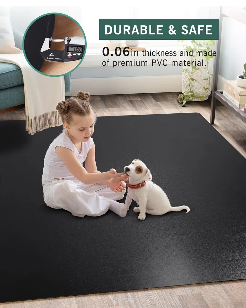 Office Chair Mat for Hard Floors, 48"x60" Anti-Slip Waterproof Floor Protector Desk Chair Mat for Rolling Chairs, Heavy Duty Non-Toxic Computer Chair Mat, Easy Glide Floor Mat for Work, Gaming Product Details Size: 48"x60" (for hard floors) Color: Black Brand: FURKIT MPN: Black-A01 UPC: Does not apply EAN: Does not apply Material: Polyvinyl Chloride (PVC) Brand: FURKIT Size: 48"x60" (for hard floors) Color: Black Style: Modern Shape: Rectangular Product Dimensions: 48"L x 60"W x 0.06"Th Surface Recommendation: Hard Floor Corner Style: Rounded Manufacturer: FURKIT Material: Polyvinyl Chloride (PVC) Brand: FURKIT Size: 48"x60" (for hard floors) Color: Black Style: Modern Shape: Rectangular Product Dimensions: 48"L x 60"W x 0.06"Th Surface Recommendation: Hard Floor Corner Style: Rounded Manufacturer: FURKIT Number of Items: 1 Item Weight: 7.3 pounds Country of Origin: China Item model number: Black-A01 Date First Available: September 11, 2023 Easy to Glide & Reduce Leg Fatigue: The frosted side of this office chair mat is up, which makes it much easier to glide your chair effortlessly in any direction. It is also an ergonomic chair mat that reduces the danger of lower body fatigue and repetitive stress injuries. Protect Hard Floors & Multifunction: The chair mat for gaming protects the hard floor from scratch. It can prolong the use of your hardwood floor, saving the cost of having to repair damage. The large desk chair mat has a wide range of uses, it is not only an office chair mat but also can be used as a pet litter mat and a play mat for the floor. No Cracks & Easy to Flatten: The computer chair mat is rolled up along a hard reel rather than folded in half, so there are no creases. The hard reel also protects the mat from bumps or dents on the edges caused by external forces. The hardness of the mat is tested several times, and it is easy to flatten in a short time, minimizing tripping hazards. Heavy-duty & Durable: The hard floor protector for the desk chair is 0.06 inch thick and made of premium PVC material, making it incredibly durable. It is built to last under even the most demanding conditions and protect your hardwood floor from scratches and marks caused by repetitive chair movements. Safe Material: Made from waterproof PVC material with SGS Certification, it is BPA and phthalates-free. The office chair mat for the hard floors is ideal for those who with pets and kids.
