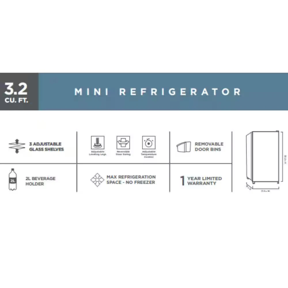 Fast Shipping On All Items 30 Days Money Guarantee Customer Support Excellent Service 100% Satisfaction Satisfaction Guaranteed Office Dorm 3.2Cu-ft Reversible Door Beverage Compact Black Mini Refrigerator Specification Appliance Category Refrigerator Appliance Series Not Applicable Appliance Type Compact Refrigerator Color - Appliance Cabinet Black Color - Door Handle(s) Black Color/Finish Black Color/Finish Family Black Defrost Type Manual Energy Efficiency Tier Rating Not CEE rated Freezer Capacity (cu ft) 0 cu ft Freezer Features No Additional Features Freezer Type No Freezer General Features No Additional Features Handle Type Recessed Handle Hardware Color/Finish Black Hardware Color/Finish Family Black Ice Maker Features No Ice Maker Indoor/Outdoor Indoor Installation Depth Counter Depth Number of Doors 1 Door Number of Freezer Baskets/Bins No Baskets/Bins Number of Freezer Shelves No Shelves Number of Refrigerator Shelves 2 Shelves Operational Features No Additional Features Product Weight (lb) 43.90 lb Refrigeration Dispenser Features No Dispenser Refrigerator Capacity (cu ft) 3.2 cu ft Returnable 90-Day Shelf Material - Refrigerator Glass Storage Features Adjustable Shelves/Racks,Removable Shelves Temperature Control Type Internal Analog Total Capacity (cu ft) 3.2 cu ft Water Filter Replacement Model# Not Applicable Manufacturer Warranty 1 Year Parts and Labor; 5 Years Compressor Part Only Depth (Excluding Handles) (in) 20.6 in Depth (Including Handles) (in) 20.6 in Depth (Less Door) (in) 16.9 in Depth With Door Open 90 Degrees (in) 34.7 in Height to Top of Door Hinge (in) 33.20 in Height to Top of Refrigerator Case (in) 33.20 in Product Depth (in) 19.10 in Product Height (in) 33.20 in Product Width (in) 17.50 in Refrigerator Width (in) 17.10 in 17.5 inches x 19.1 inches x 33.2 inches. Weight: 43.9 lb Item Description Compact size is ideal for offices, kitchenettes, and dorms In-door storage to fully optimize interior capacity Adjustable temperature control and removeable glass shelves The Vissani 3.2 cu. ft. Mini Refrigerator has the storage options you're looking for. It is a freezer-less design which allows for more usable fresh food and drink storage capacity. The sleek appearance is matched by its well-designed interior, which includes a can holder to conveniently keep canned beverages in the door, while additional door shelves provide space for other frequently used items. Its glass shelves are easy to clean, and the ENERGY STAR qualified design helps save on energy costs without sacrificing performance. Perfect compact size for use in dorm rooms, offices, basements, rec/playrooms, break rooms. Upfront interior analog controls for making quick adjustments to internal temperature 3 fresh-food glass shelves help keep foods organized and are easy to clean Door can holder keeps beverage cans neat and makes it easy for you to just grab 1 and go Freezer less design provides more usable capacity ENERGY STAR rated for energy efficiency Door shelves help your keep frequently used items up front for easy access 3.2 cu. ft. capacity compact refrigerator is manual defrost Reversible door offers multiple options for placement in a room Flush back for ease of installation Warranty is 1-year parts and labor, 5-years compressor (part only) Item does not qualify for the major appliance delivery and haul away or installation services About us We offer the best prices around on high quality products. Our E-store includes media such as books, movies, music and games while offering electronics, toys, sporting apparel, clothing, tools, general home, garden items and more. Shipping We are always working hard to ensure your package arrives as soon as possible. Please understand that some factors like weather, high postal traffic, and the performance of shipping companies are outside of our control. We offer free shipping to the lower 48 states and ship within 2-3 business days of payment, usually sooner. We do not accept P.O. Boxes. Please provide a physical address. For shipping outside of the continental USA, we only use eBay's Global Shipping Program.The item is shipped to KY and then sent to the rest of the world. International customers are responsible for all duties and taxes. Continue to check out to calculate costs for shipping the item to your country. Messages regarding eBay's Global Shipping Program MUST be directed at eBay EXCLUSIVELY. Returns We offer a 30-Day Return Policy on items in which you are not completely satisfied with. You have the option of a full-refund or an exchange of the item. No returns are available on items shipped outside of the USA Satisfaction We try over very best to make sure every customer is completely satisfied. If there's a problem, message us! We're happy to help. Payment Options Shop With Confidence