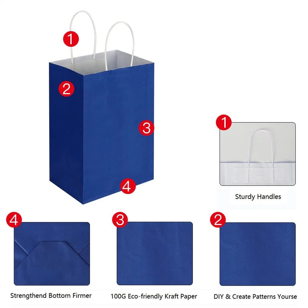 Oikss Each 100 Pack Small Blue & Fuchsia Kraft Paper Gift Bags with Handles Bulk Product Details Brand: Oikss Occasion: Wedding, Birthday, Valentine's Day Theme: Patterns Number of Items: 100 Unit Count: 100.0 Count Pattern: Solid Size: Inches Total Eaches: 100 Item Form: Bag Style: Each 100 Pack Small Blue & Fuchsia Kraft Paper Gift Bag Date First Available: September 15, 2022 Quantity: Contains 100 pack small blue gift paper bags and 100 pack small fuchsia kraft paper bags. Gift Bags Small Size: 5.25 inches long, 3.25 inches wide, 8.25 inches high kraft paper bag with 3.5 inches handle. Very suitable for Valentine's Day gift bags, shopping bags, holiday gift bags, party gift bags, retail bags, commodity bags and wedding welcome bags. Eco-friendly Paper Bags: This kraft paper bags are made of 100% Recycled Paper, which are bio-degradable and recyclable, no peculiar smell and look a lot classier as gifts bags. It can be used in many field, including wholesale and retail. Unleash Your Creativity: There are no words and patterns on the gift paper bag, you can add the words and patterns you want on it, you can DIY by yourself. Give full play to your imagination and release your creativity. Service Quality Assurance: We attach importance to service and product quality, and it is our job to make every customer satisfied. If you are not satisfied with our products or have any other questions, please contact us via email and we will serve you wholeheartedly. Each 100 Pack Small Blue & Fuchsia Kraft Paper Gift Bags with Handles Bulk for Birthday Wedding Party Favors Grocery Retail Shopping Takeouts Business Goody Gift Bags Sacks